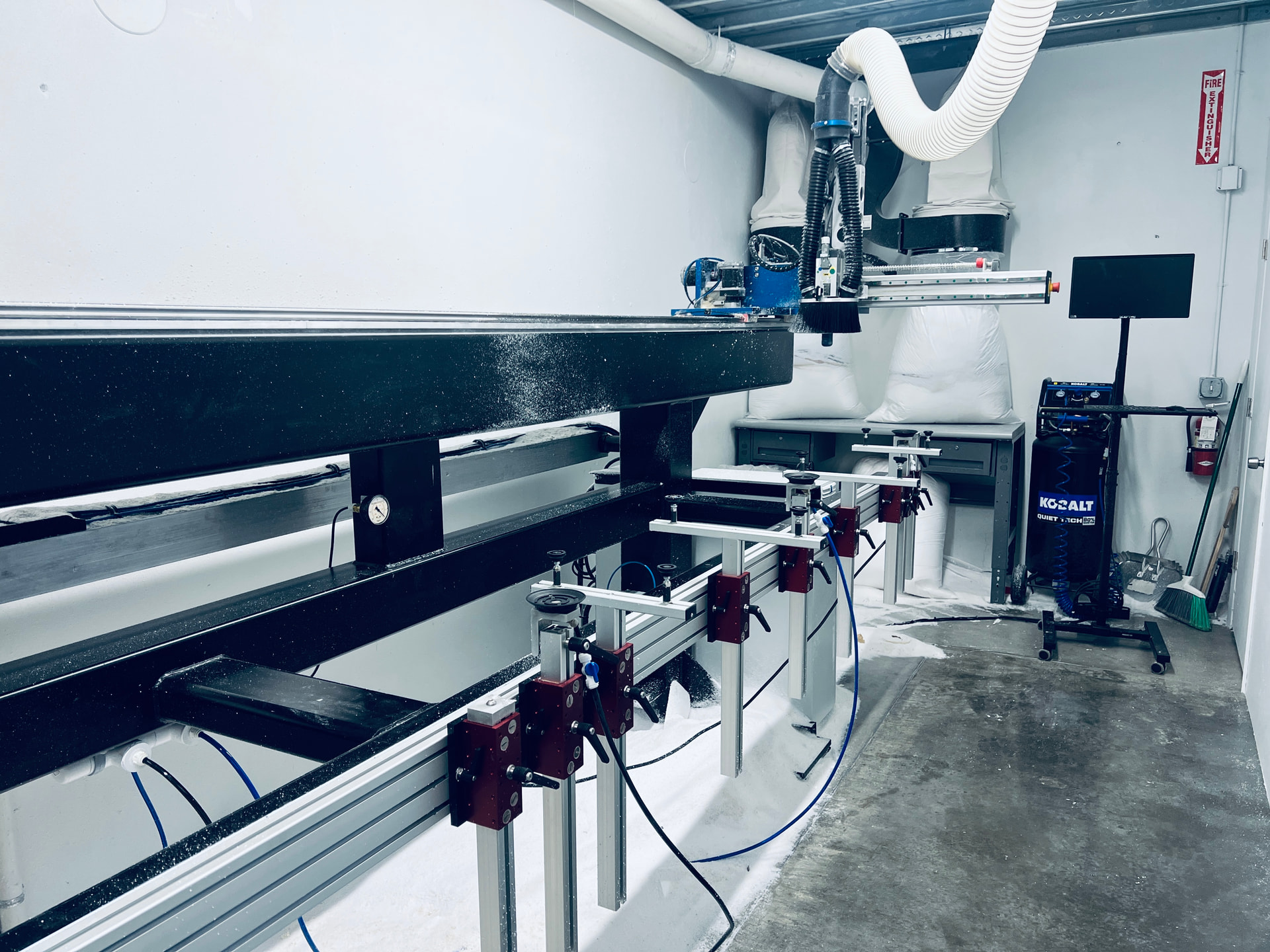 Equipped with a bull-nose carbide burr cutter for precise shaping of channels, wings, foil decks, and fin boxes. The 18-ft x 36-in x 18-in cutting area accommodates everything from shortboards to paddleboards.