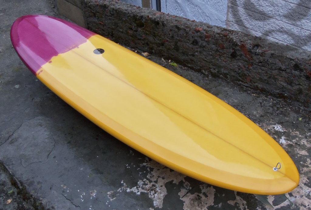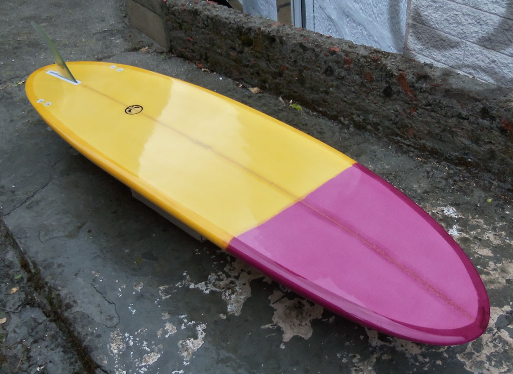 Simple board for an easy surf, lots of volume, single to double concave in vee, 50/50 rails. 2 colours tint resin, gloss finish.