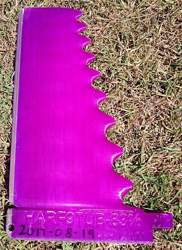 HARF9TUB-83% is a shrunk down version of HARF9TUB. The fin without UTFB is 200mm high instead of 239mm. Unfortunately I split the layers between the main purple and the white line in the aft tip area, when I carelessly used a rasp to remove the support system remnants. I glue it back together with Tarzans Grip Mega Bond.