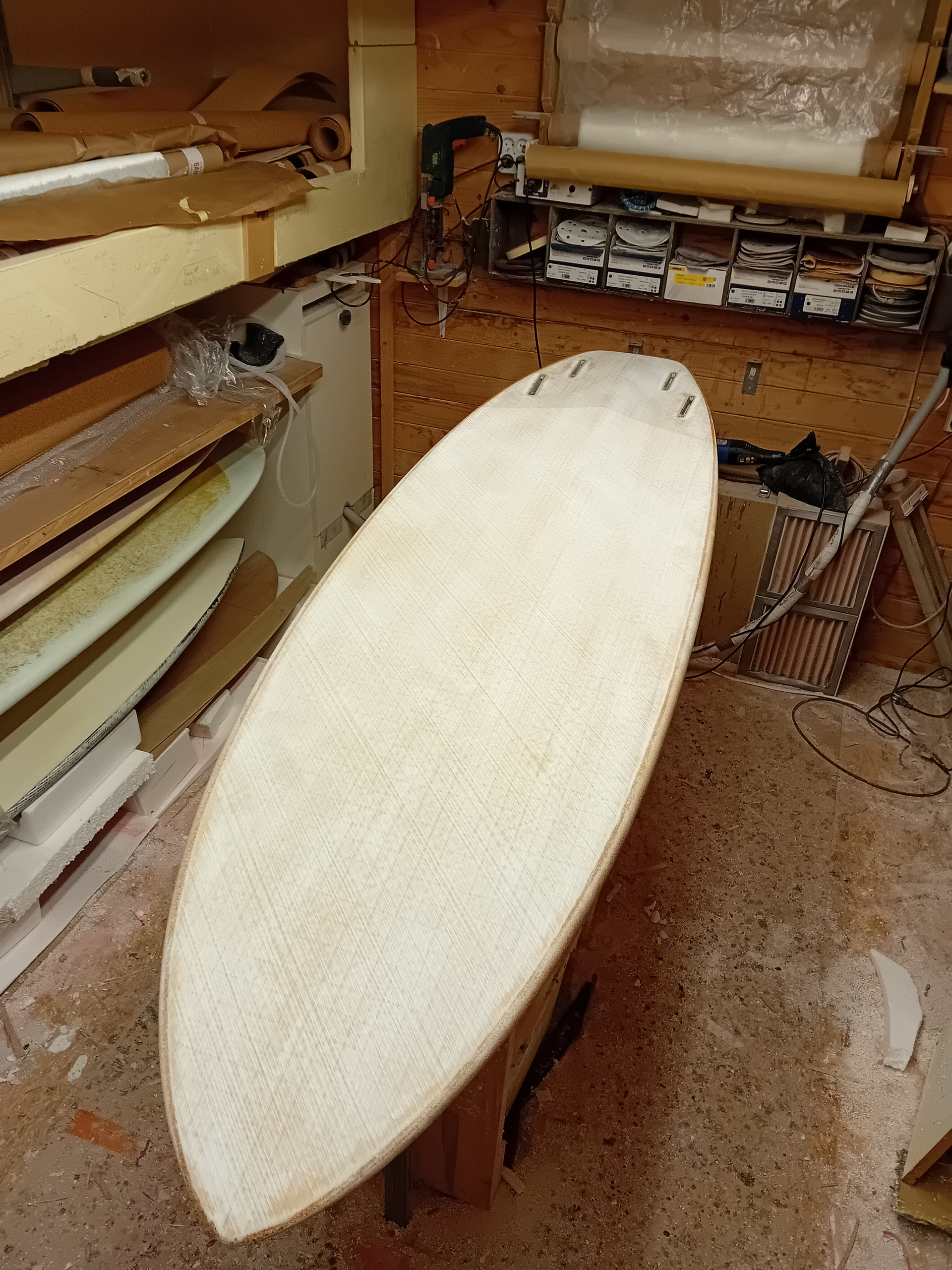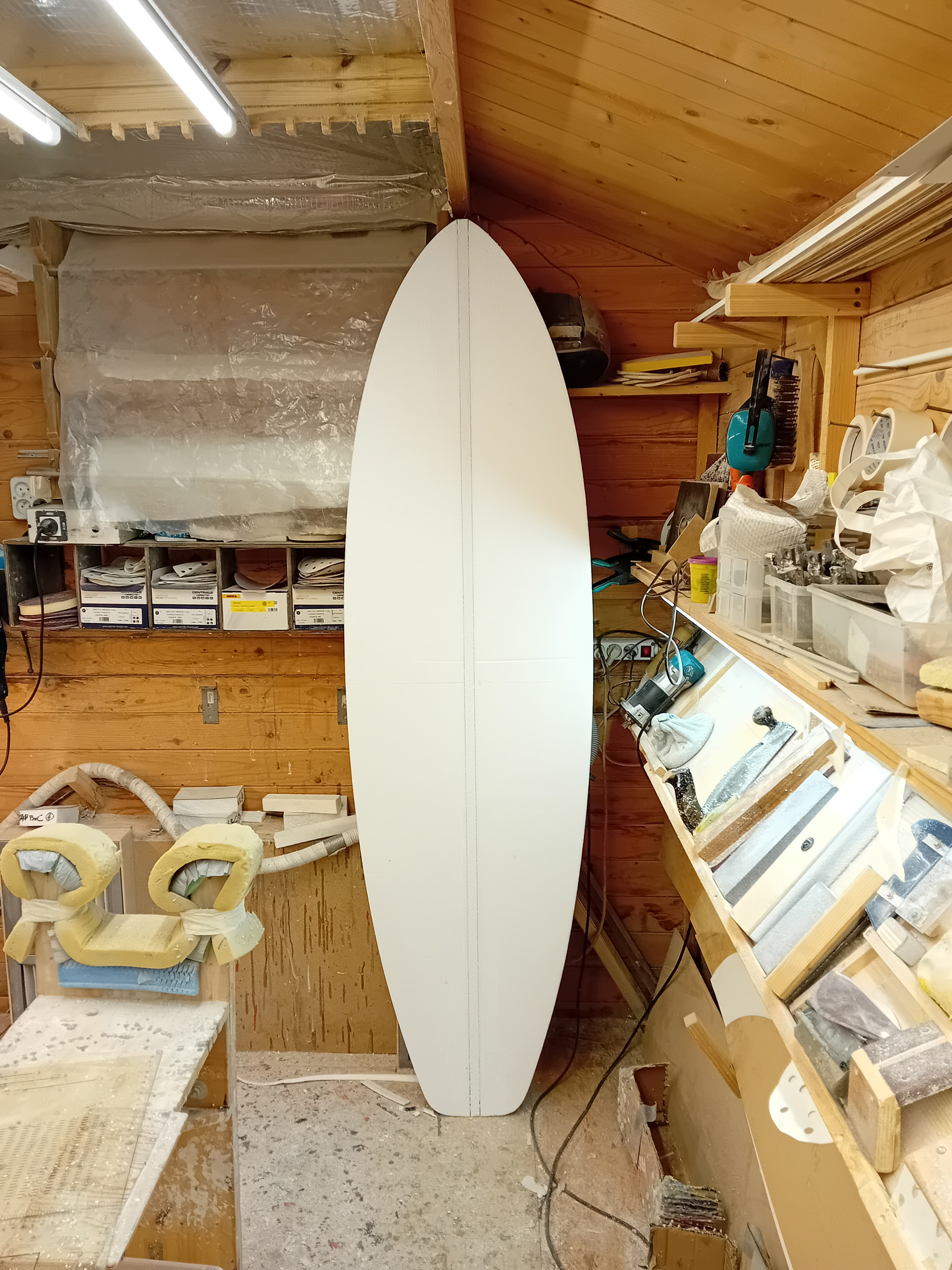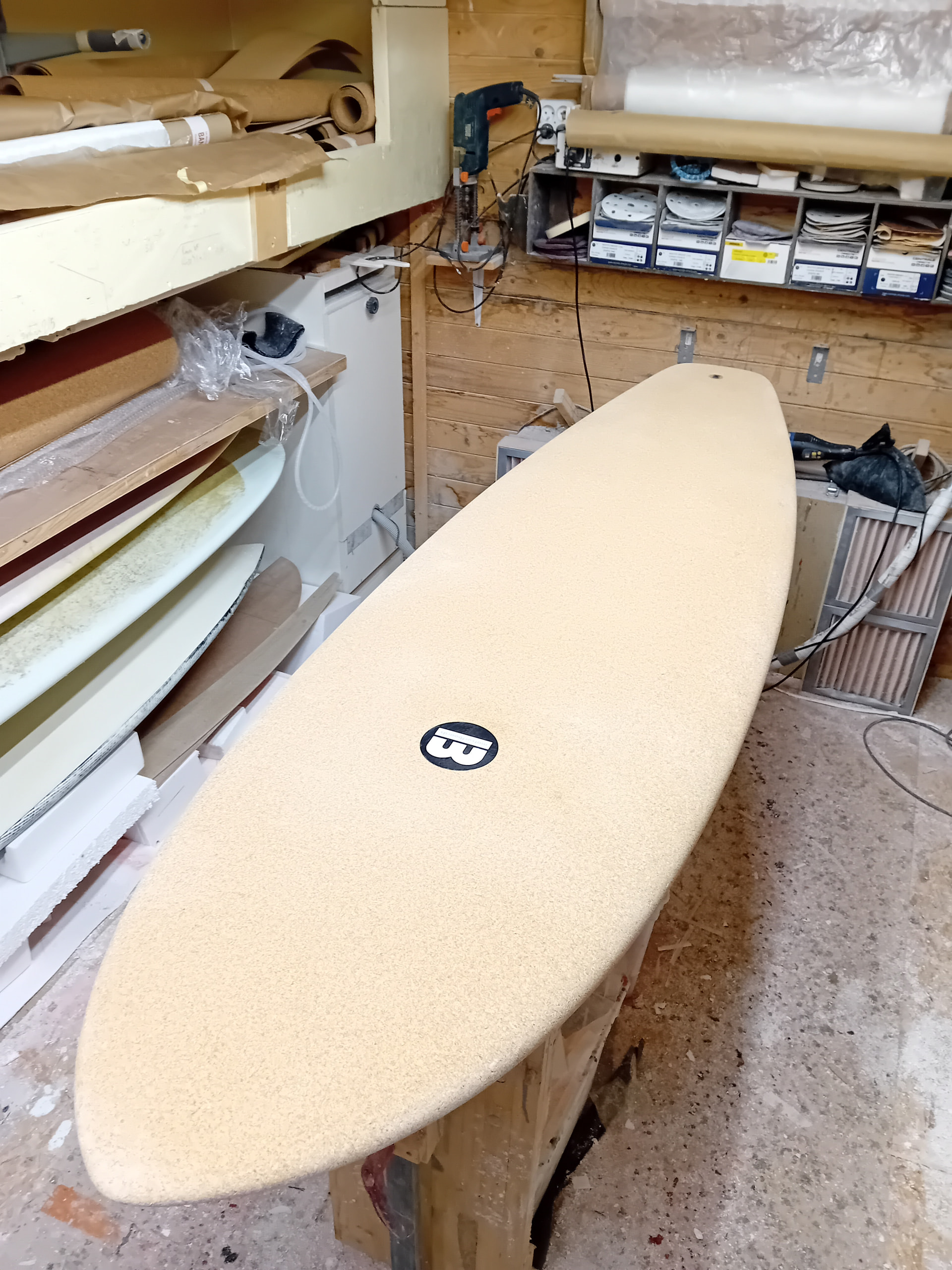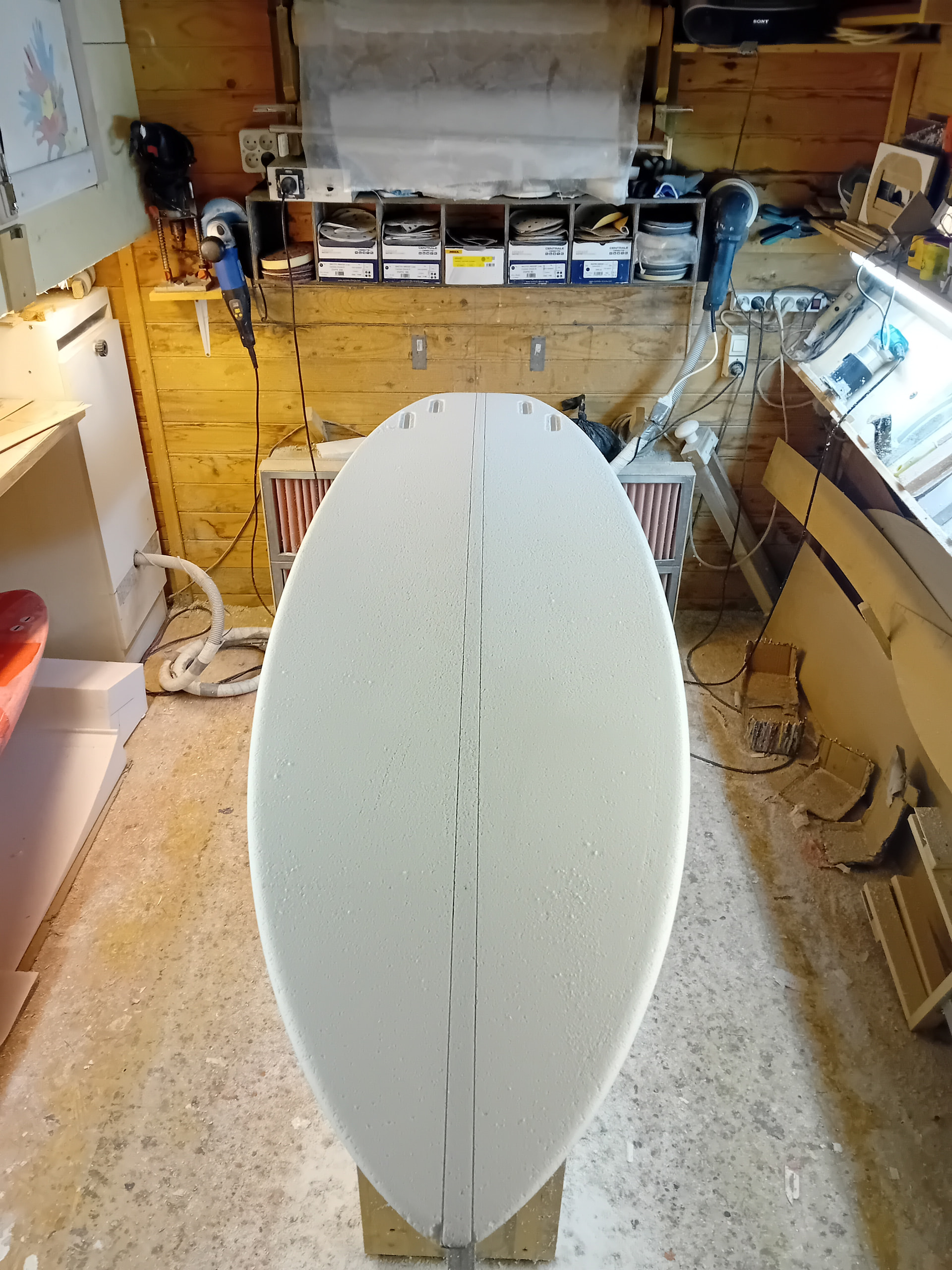 Thanks to wide flatness and thickness under the chest the board paddle fast in the wave, then the double thin and wide tail (straight oultline) with quad allow to go high and fast in the trimline. Board have a strong lift back so help entry in curvy wave without catapulte effect and allow to cut bottom turn if needed. This board is the “big board” for the hollow fast beachbreack where my mate surf, where it’s impossible to use a minimal that he should surf in “classic” beachbreack.