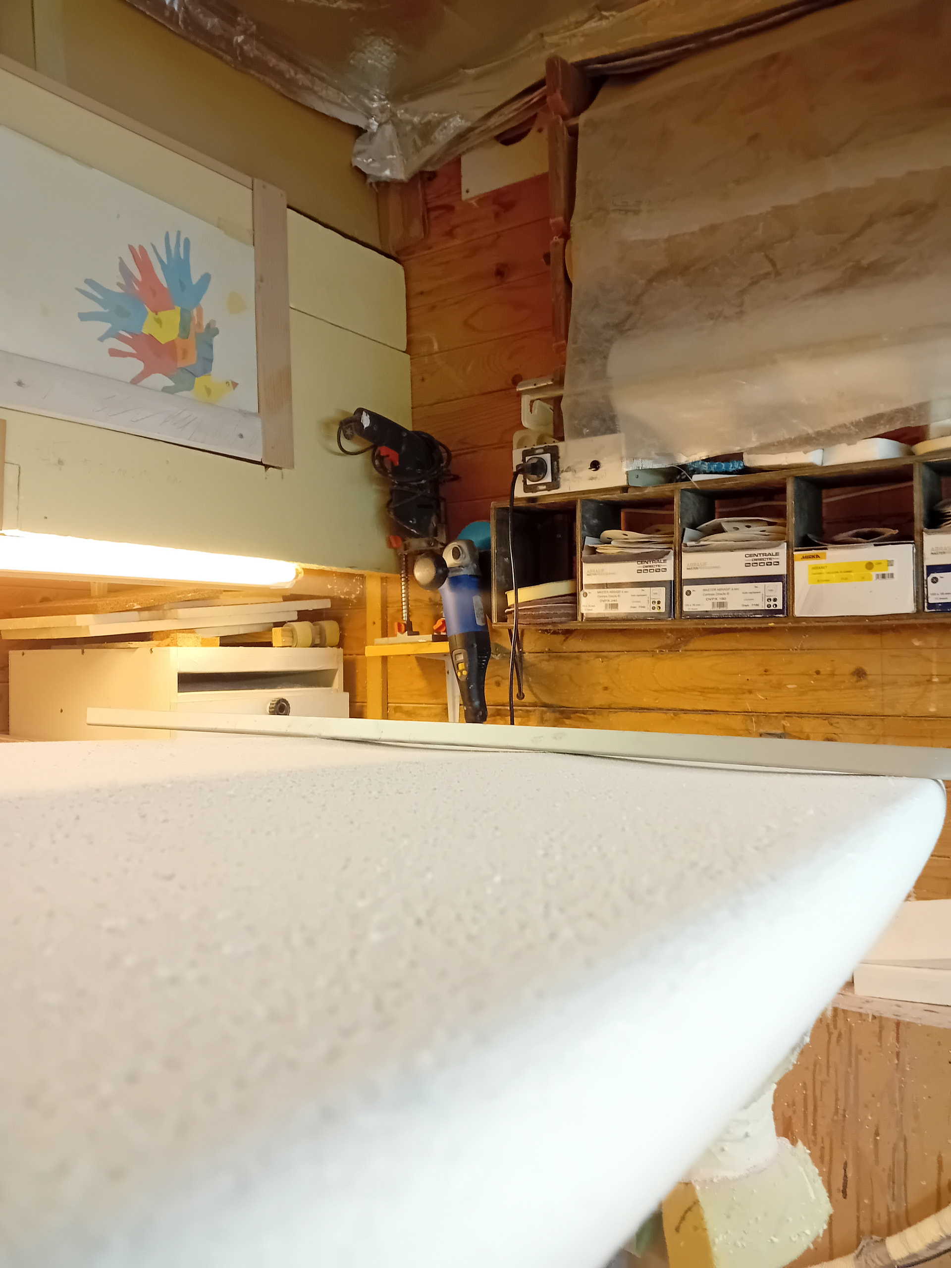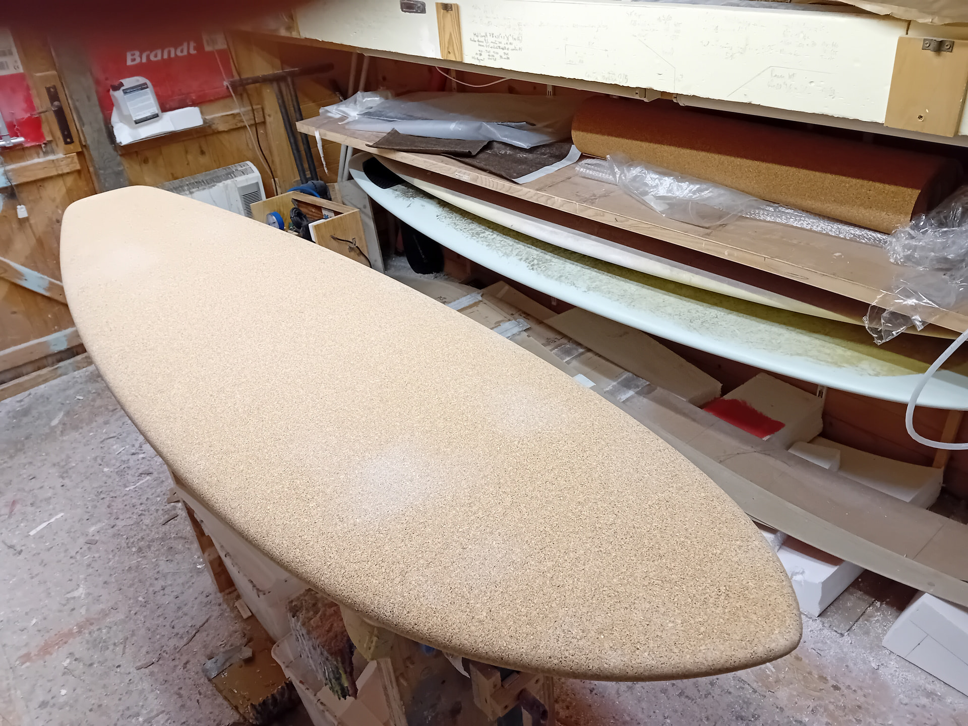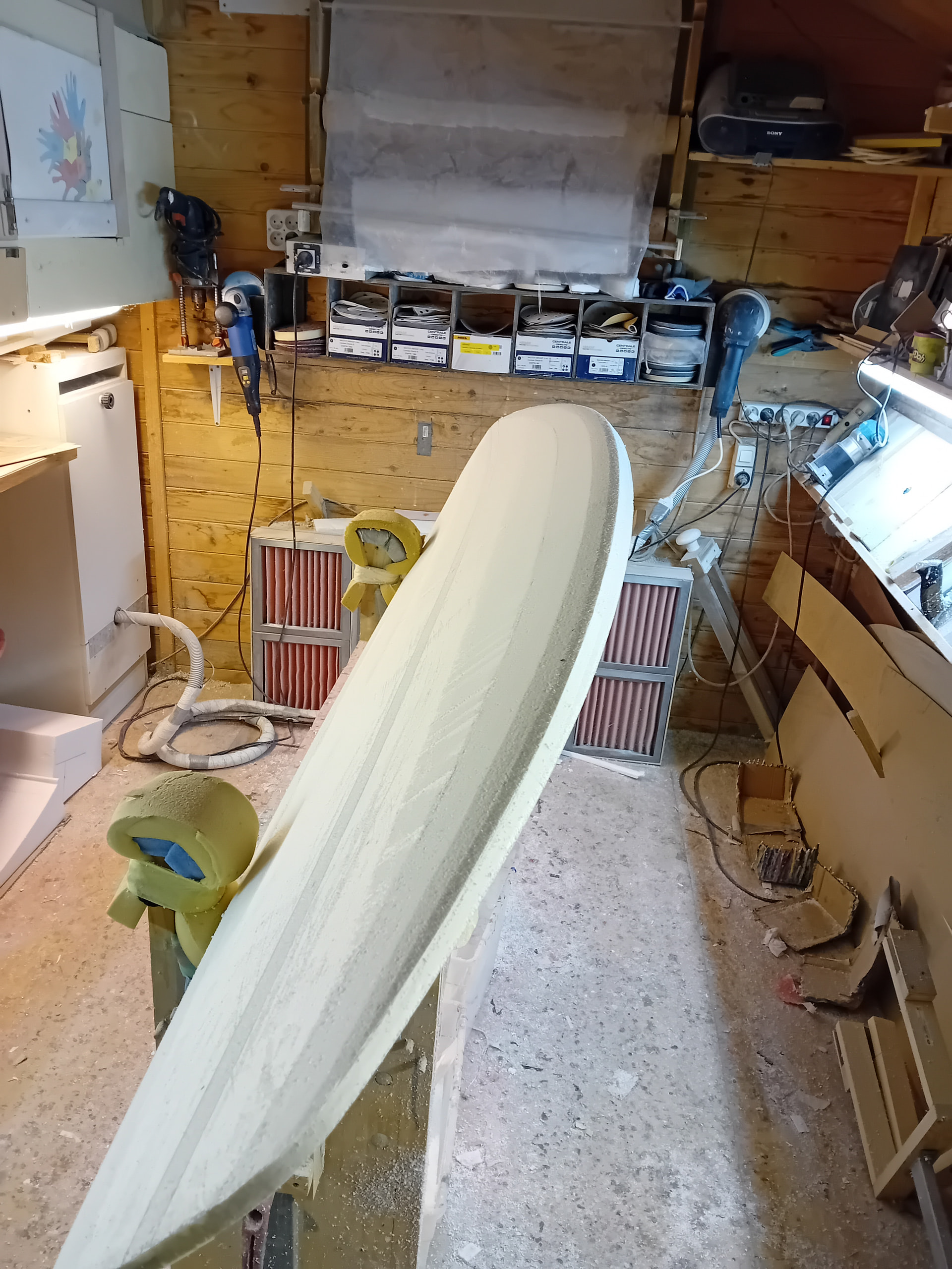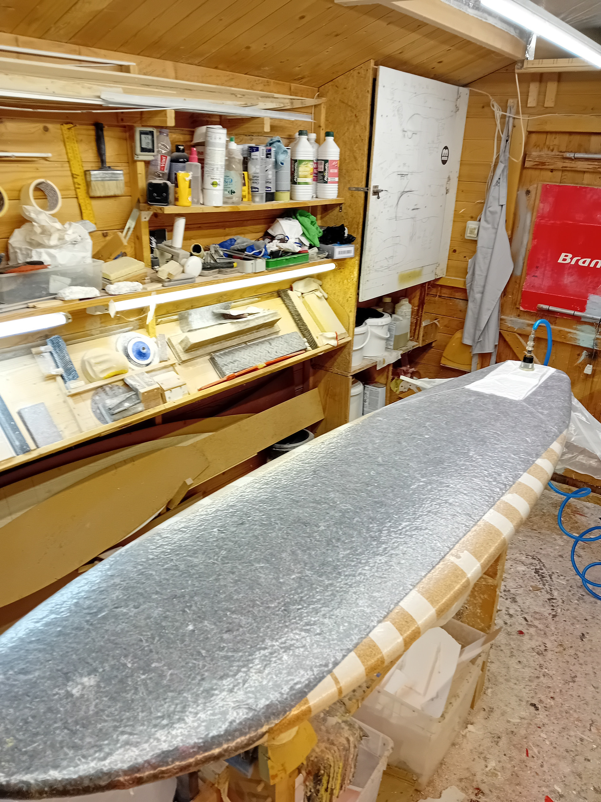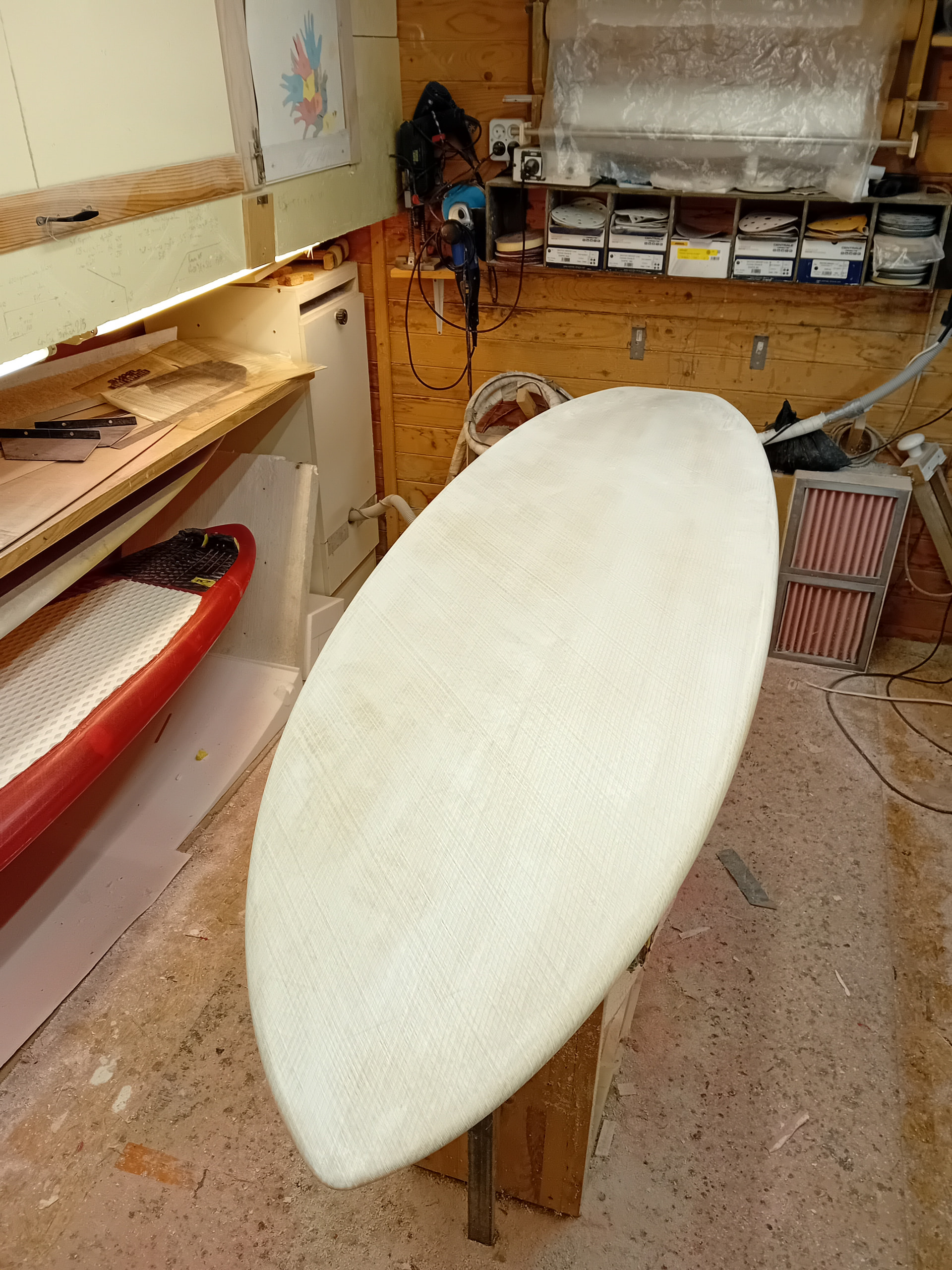Thanks to wide flatness and thickness under the chest the board paddle fast in the wave, then the double thin and wide tail (straight oultline) with quad allow to go high and fast in the trimline. Board have a strong lift back so help entry in curvy wave without catapulte effect and allow to cut bottom turn if needed. This board is the “big board” for the hollow fast beachbreack where my mate surf, where it’s impossible to use a minimal that he should surf in “classic” beachbreack.