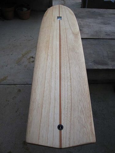 He used a 7-6 length of kiln dried redwood, perhaps 1-1/2" thick. The template was not like yours, some time I’ll post a pic… Rails beveled wit 1/4" radius top and bottom. Absolutely flat deck and bottom (this concave thing seems to be a recent development) and completely rockerless. One he painted orange (mine) the other yellow (brother’s).