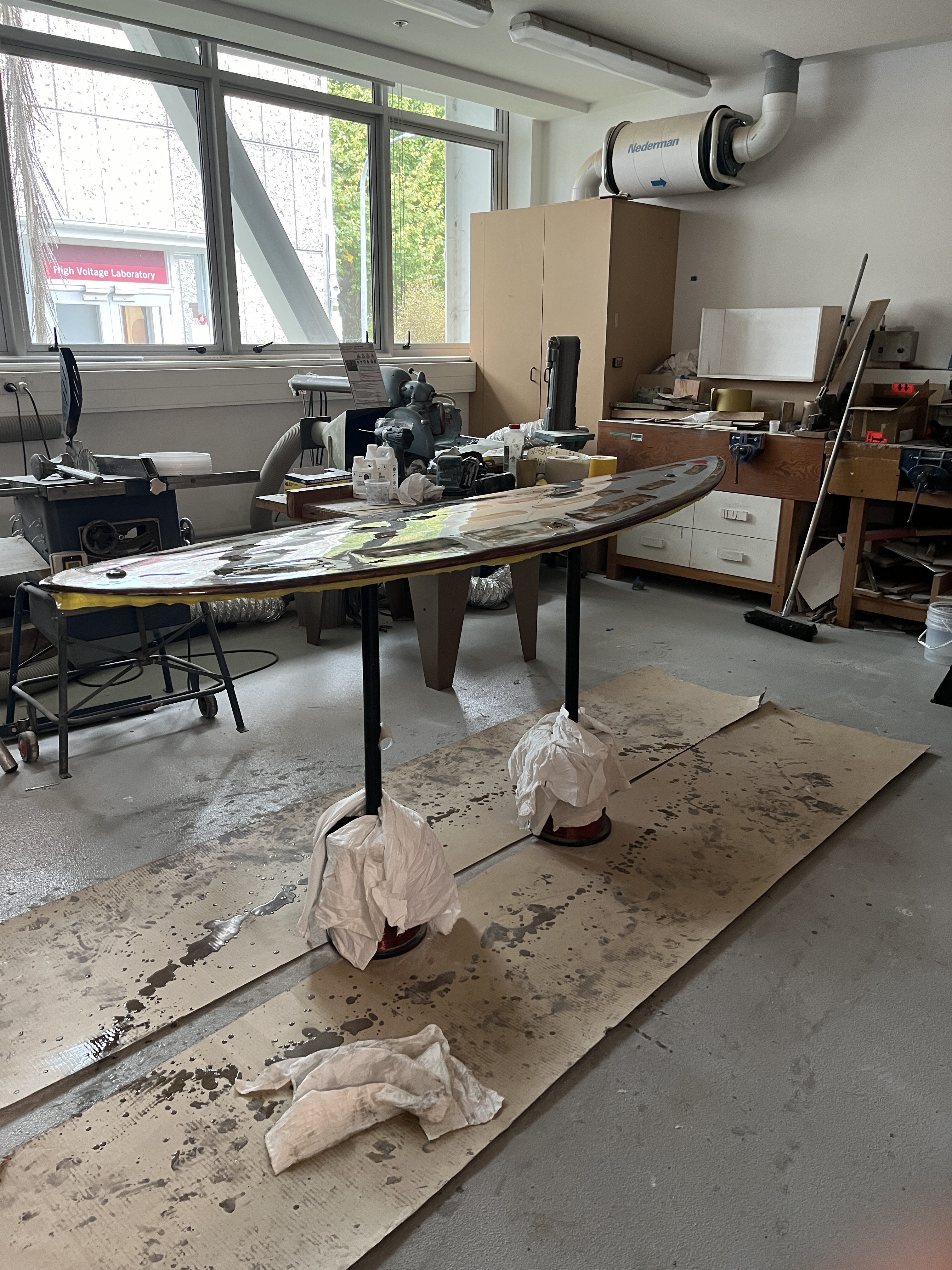 9.3 kg (20 lbs.) definitely on the heavy side for a 7 footer by today’s standards, but not out of line with many hollow wood surfboards. It seems surfable for sure, but only way to really know will obviously be to finish it and try it. If the skin is aluminum that sounds like a really interesting build, wondering how you will attach the skin, and where you got the sheet aluminum. And the process. It does look like the bottom skin is sheet aluminum. Are you going to vent it? Keep us posted on this interesting project.
