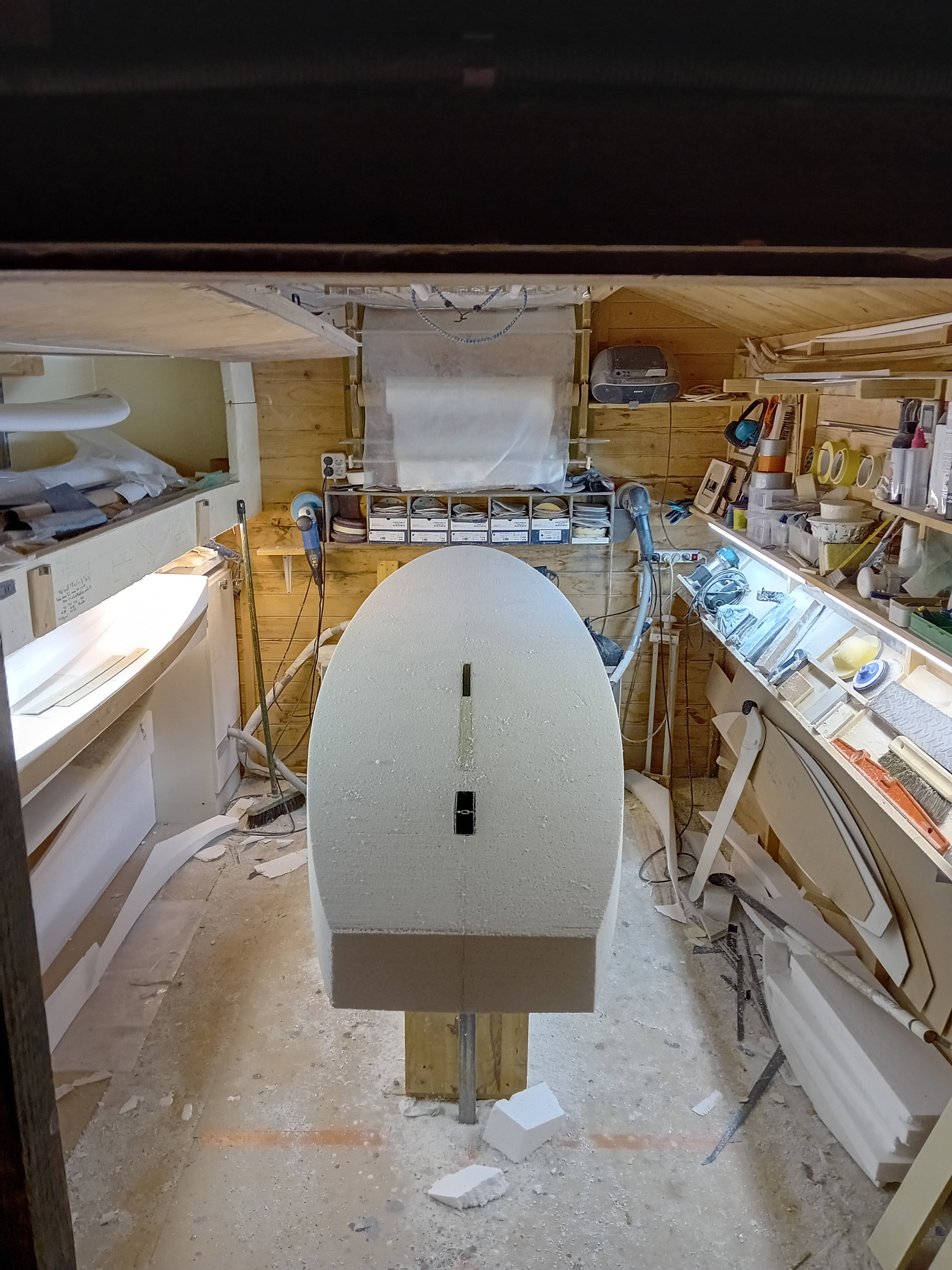 33 years garage shaping around 250 boards always all in one small room last one is 4m long, 3m wide with an oven. Bigger board was a windsurf hybrid raceboard. More important for me is ventilation. I suck through a filter near floor one side and push air in from roof opposit. Photo from the door, board is 290x72cm