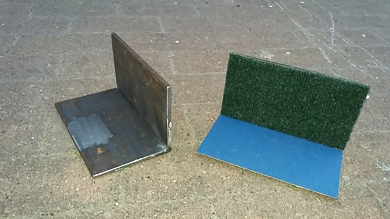 3/16" x 4" flat stock welded on a perfect 90* angle. Some Hi Strength 90 Spray Adhesive, a scrap of outdoor carpet, and a piece of 80 grit belt sandpaper… for truing up outlines. Guaranteed 90* rails.