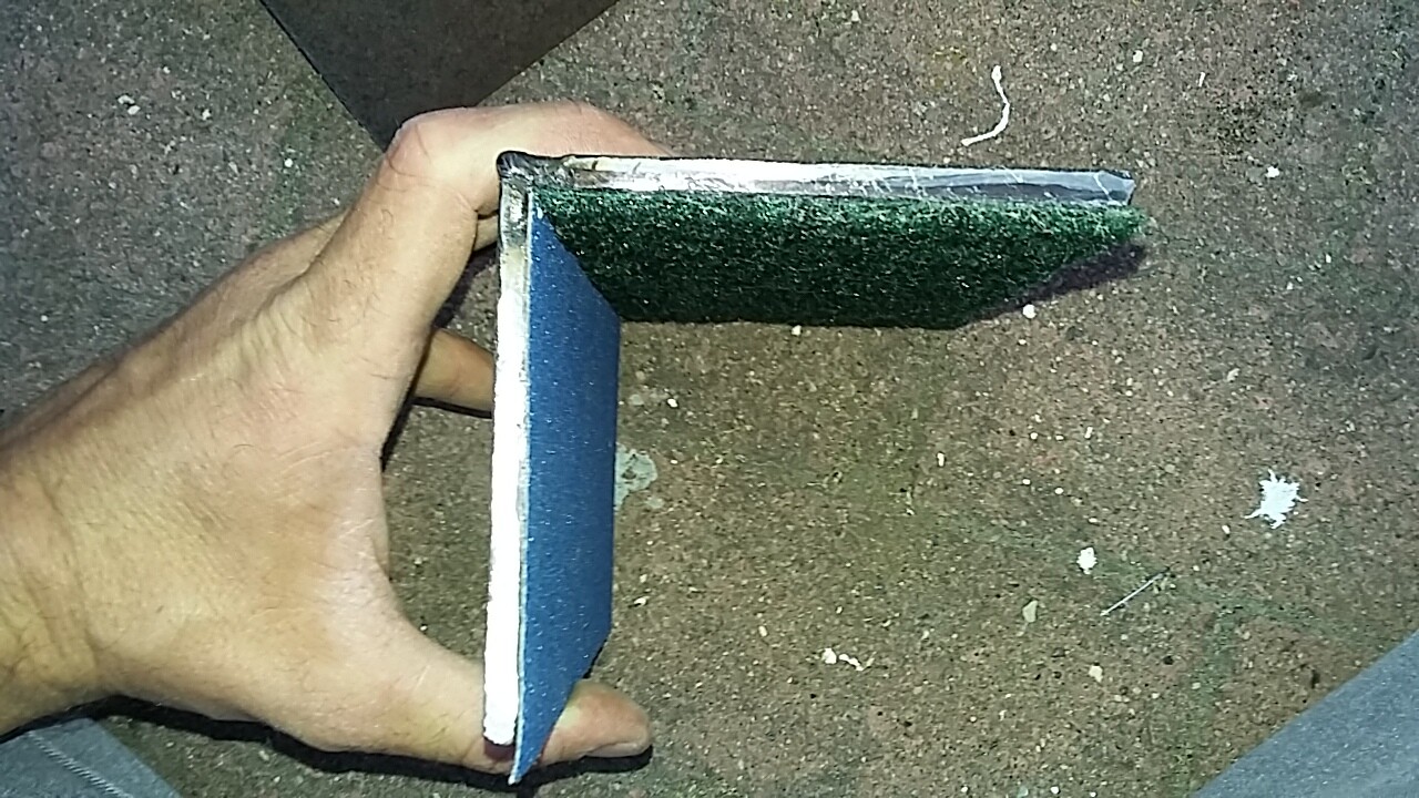 You guys were right. The carpet is no good. Also the steel is pretty heavy. So I remade it in wood using three-quarter inch ply and my Kreg Jig. I like this version much better but I have been noodling on ways to add either grooves or holes on the Sandpaper side to allow the dust to escape. Also, I need to use rougher grit sandpaper