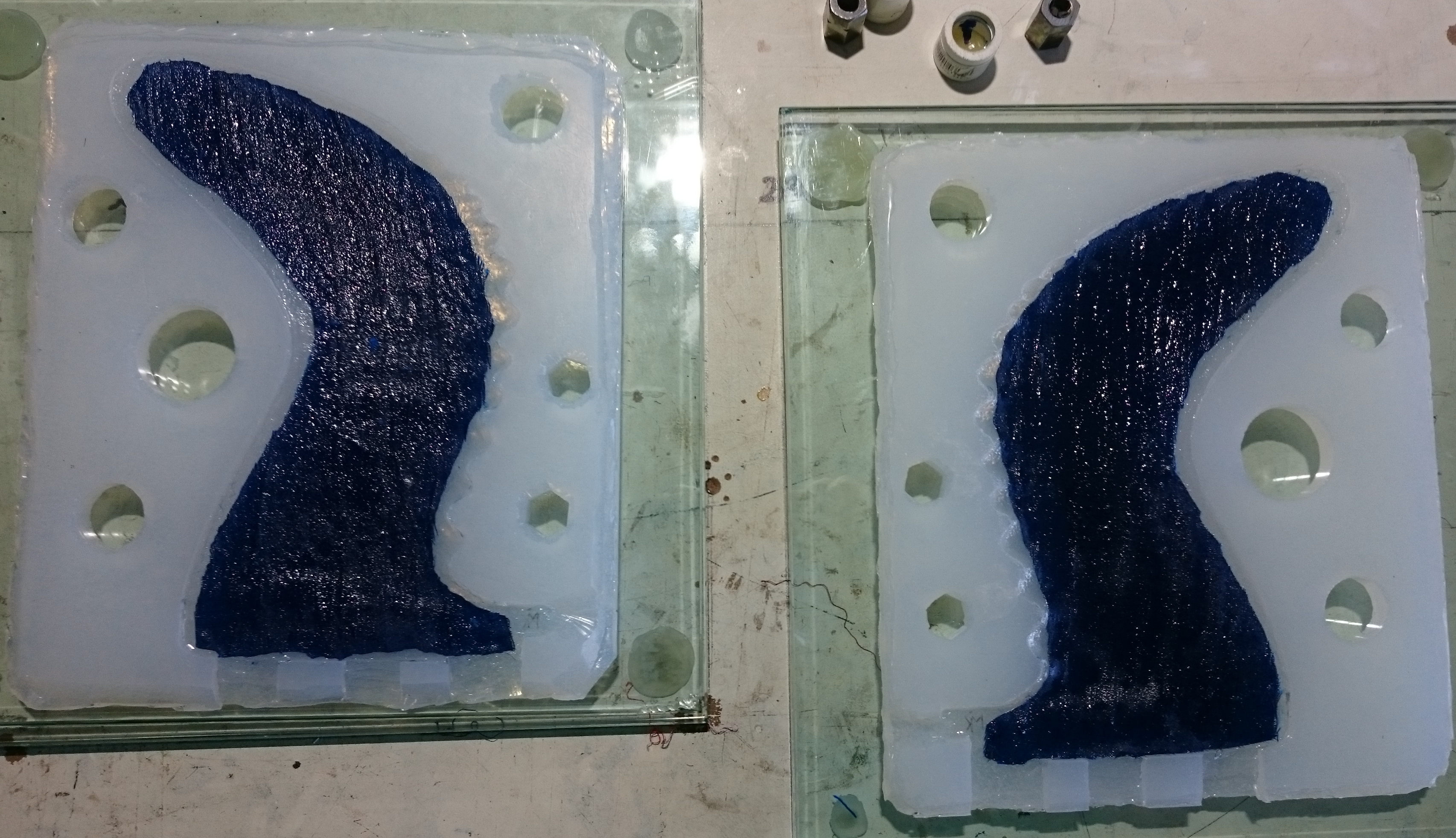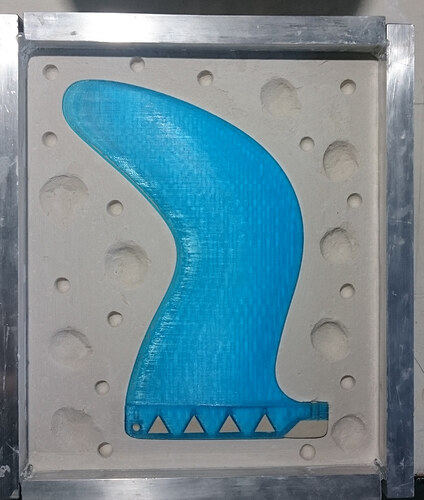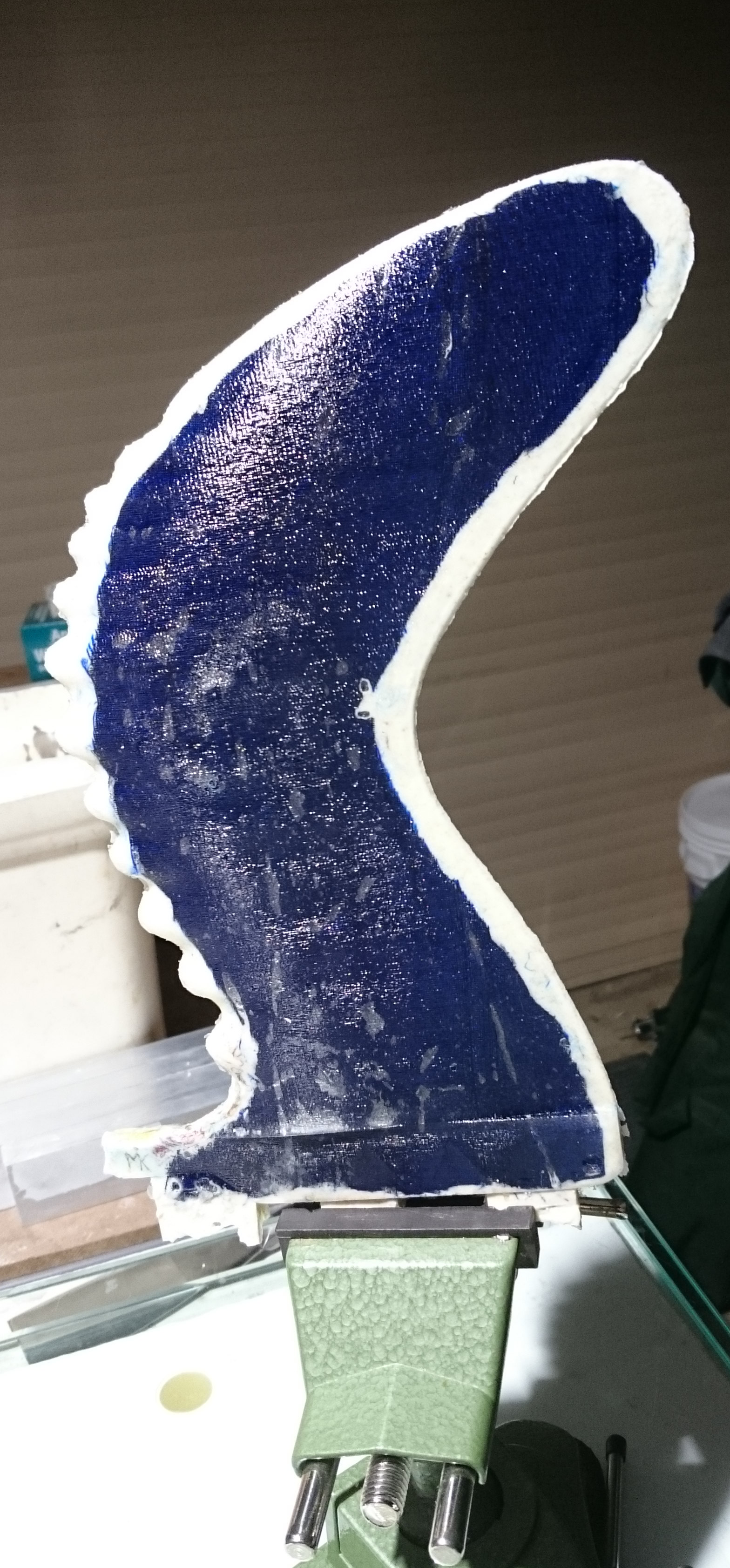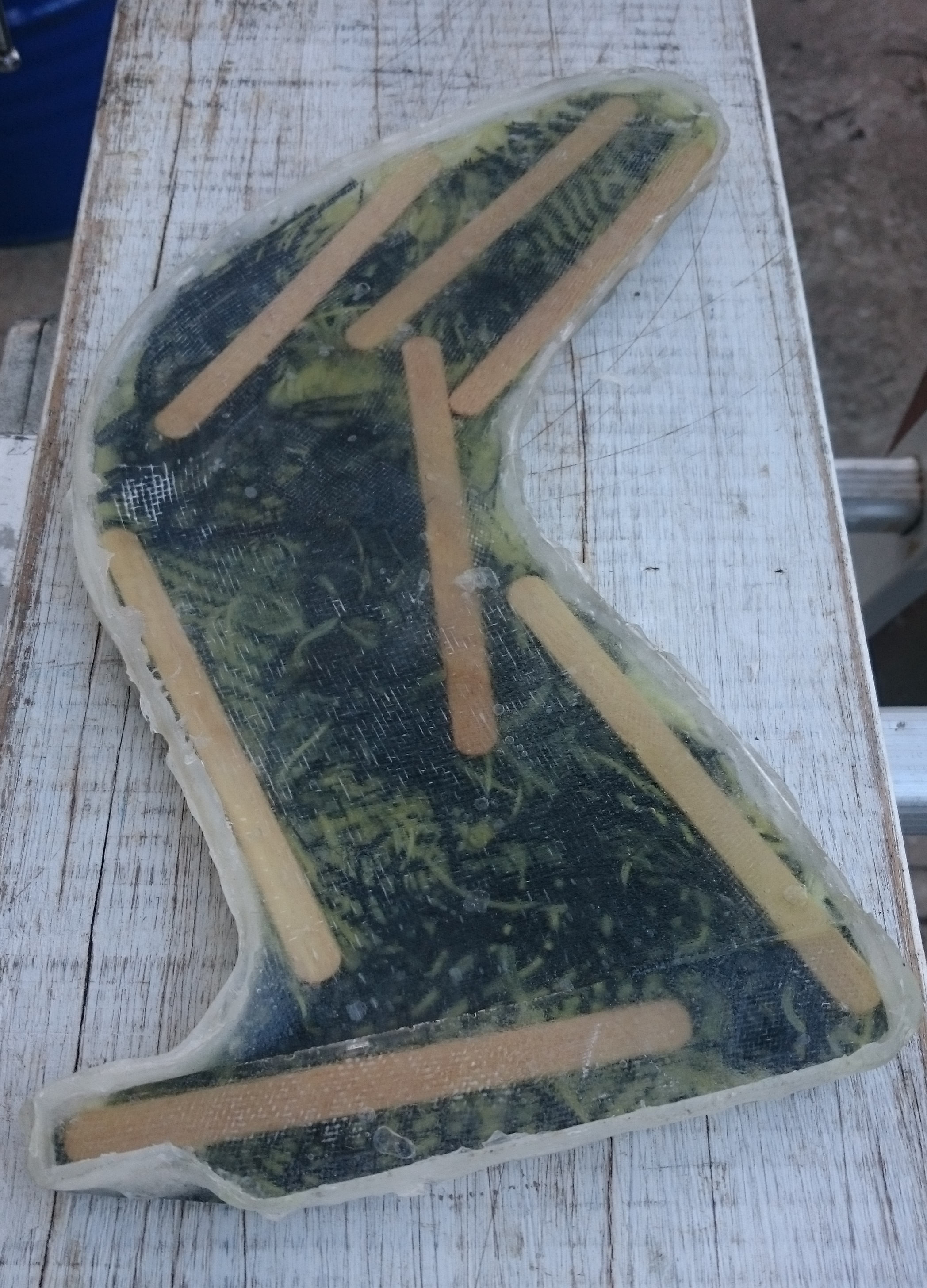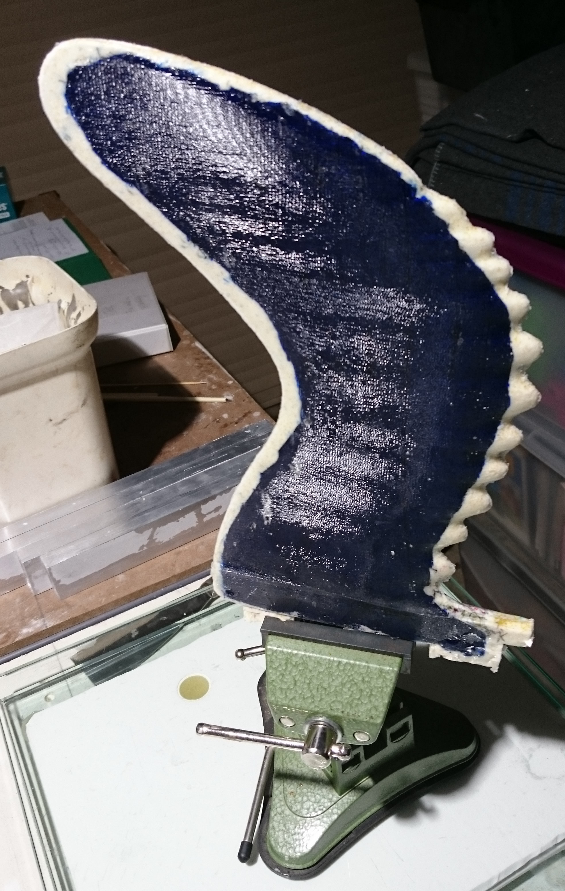 So, while applying layers of latex and waiting for them to dry, I returned to an earlier attempt to make a mould: The blue gullwing fin printed by Roy, without bumps on the leading edge. I had covered it with vaseline, Solarez Zerovoc, carbon, paddlepops, kevlar, epoxy and more zerovoc IIRC. Today, it did “eventually” come off clean from the fin and what remains is a very accurate and durable half-mould of that fin. I doubt I’ll ever use that approach again. And I don’t think there will be much use for that very tough half-mould…