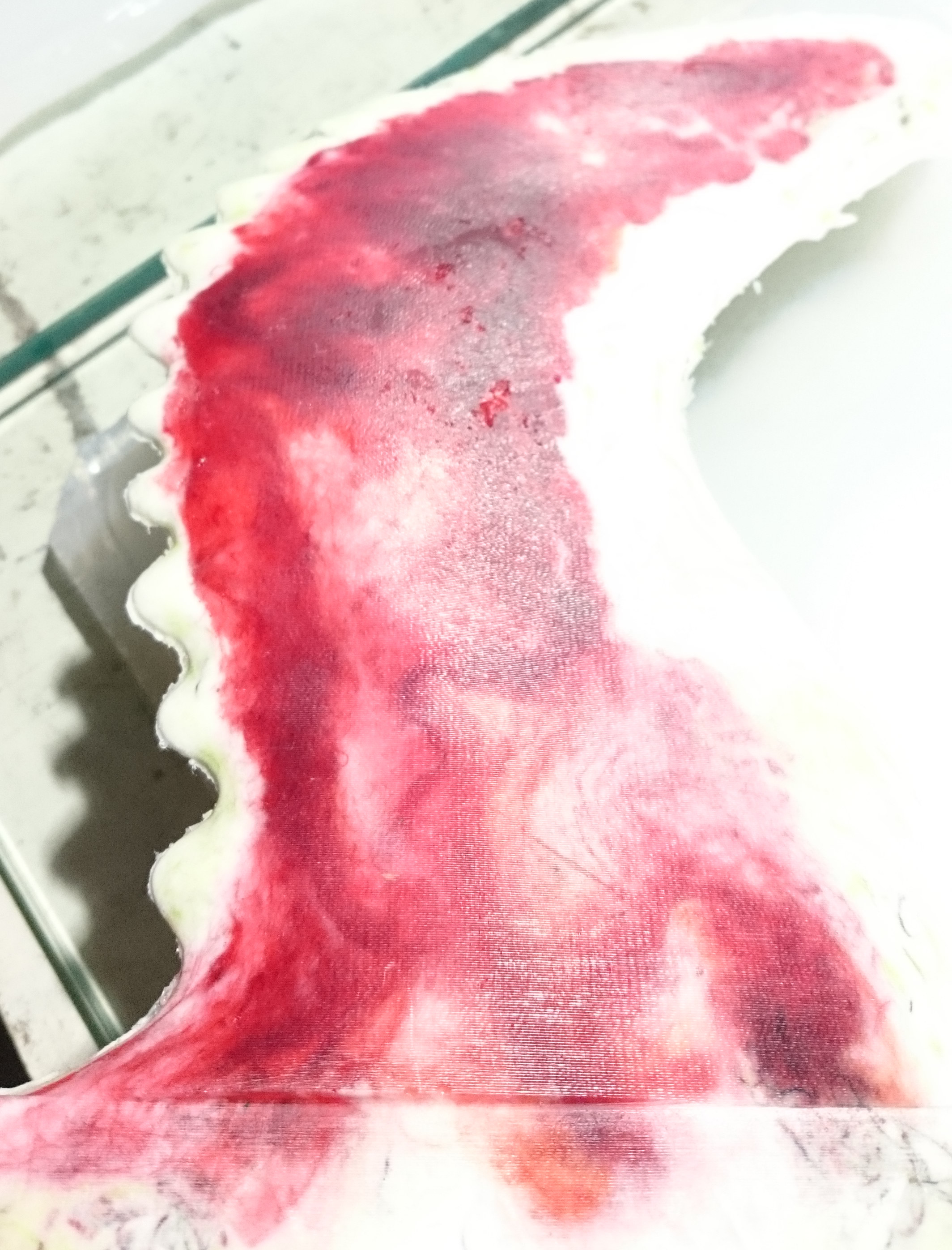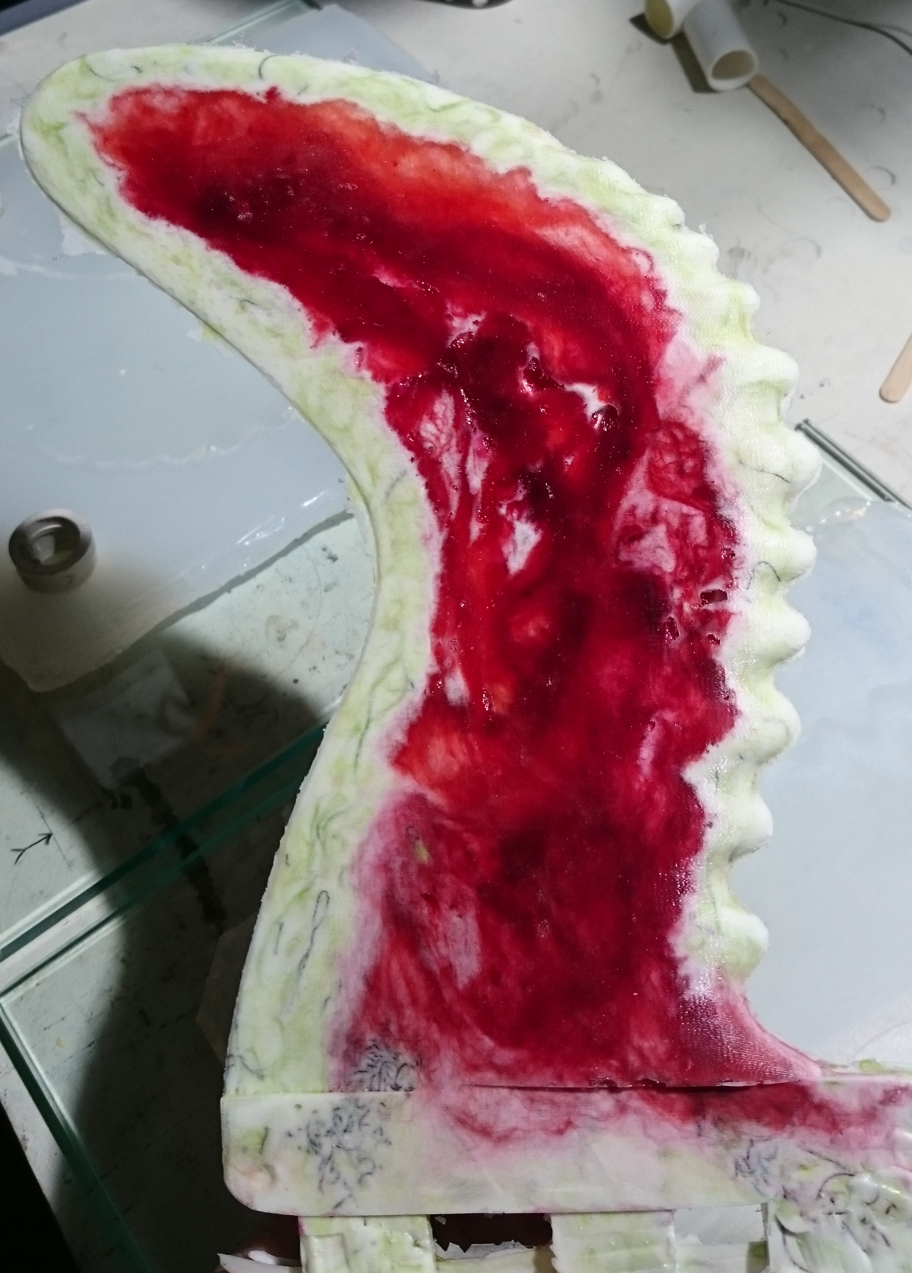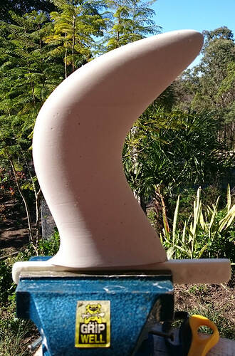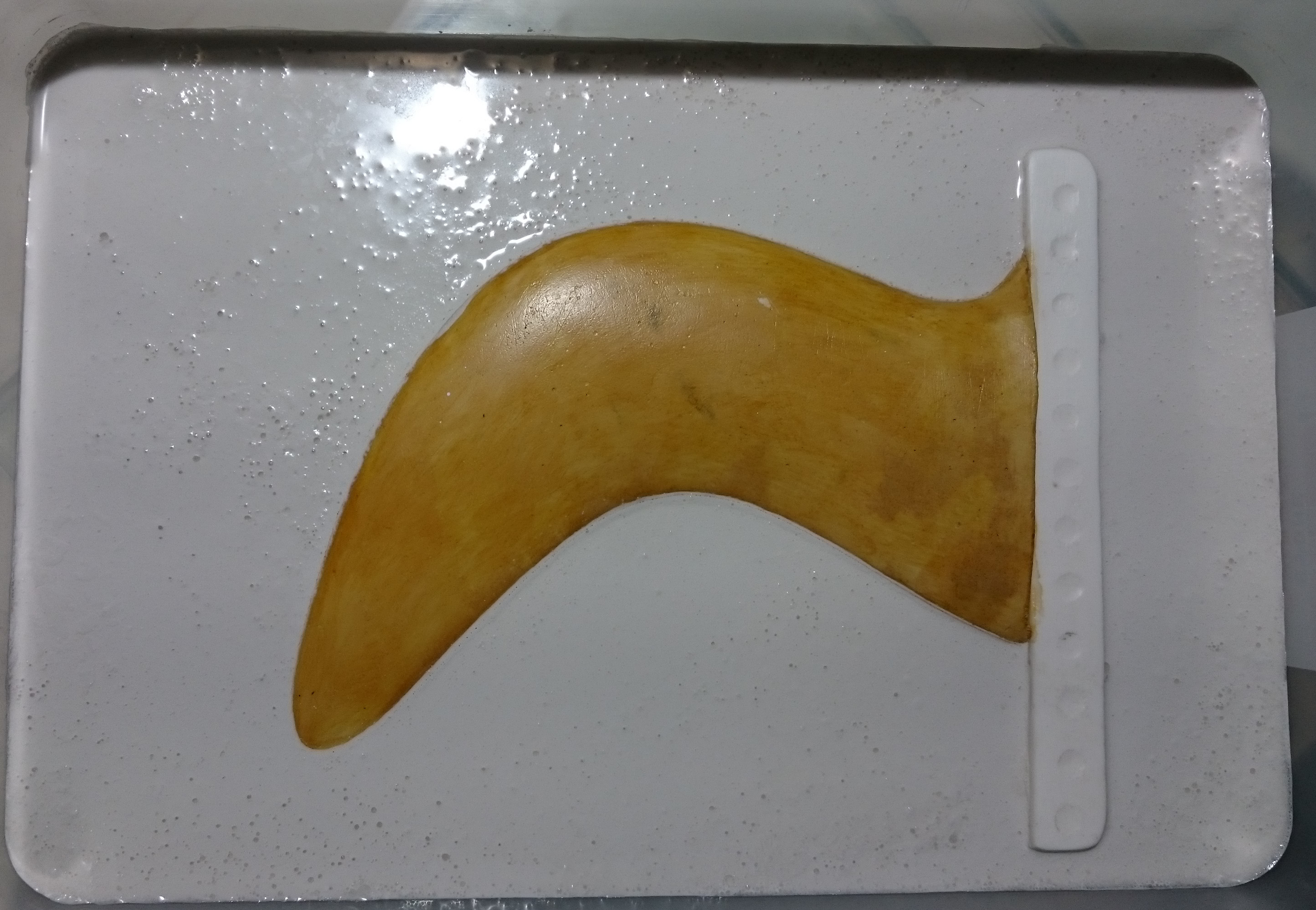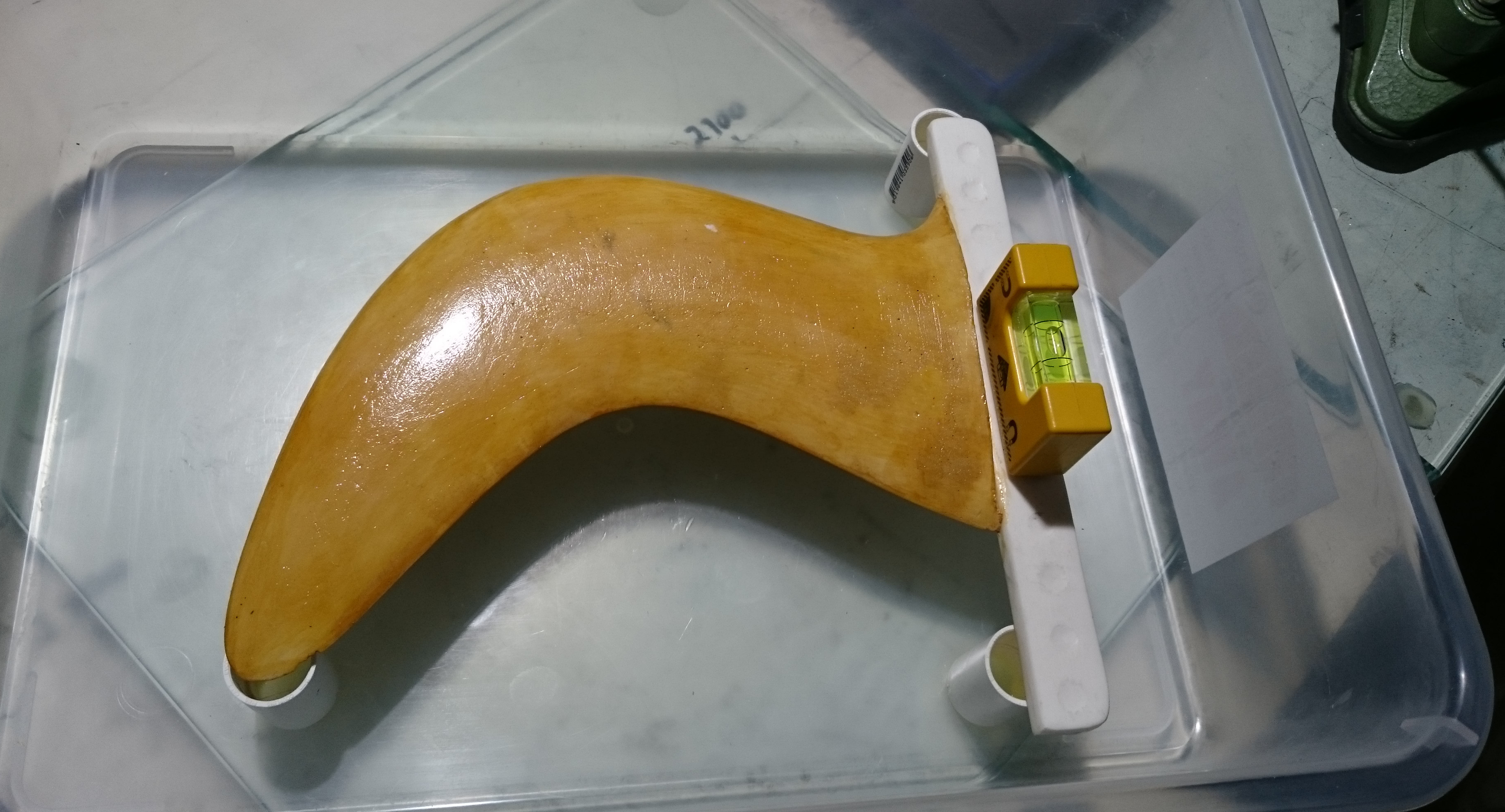So, while applying layers of latex and waiting for them to dry, I returned to an earlier attempt to make a mould: The blue gullwing fin printed by Roy, without bumps on the leading edge. I had covered it with vaseline, Solarez Zerovoc, carbon, paddlepops, kevlar, epoxy and more zerovoc IIRC. Today, it did “eventually” come off clean from the fin and what remains is a very accurate and durable half-mould of that fin. I doubt I’ll ever use that approach again. And I don’t think there will be much use for that very tough half-mould…