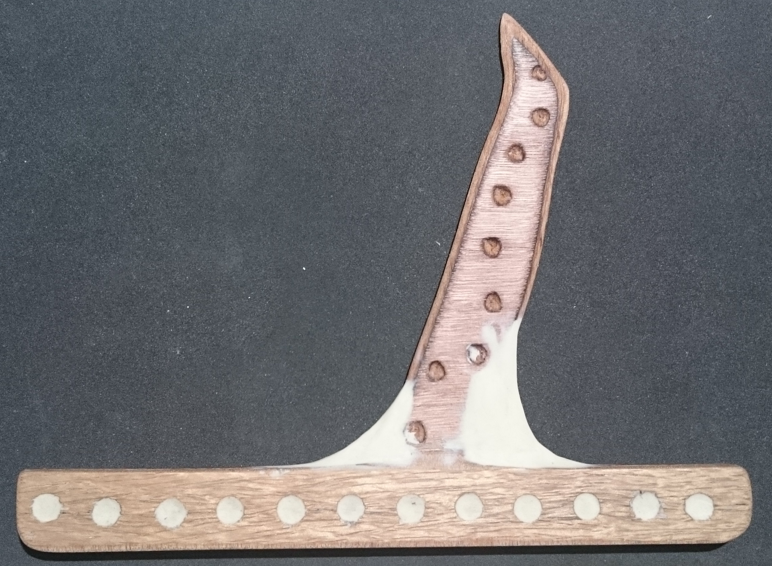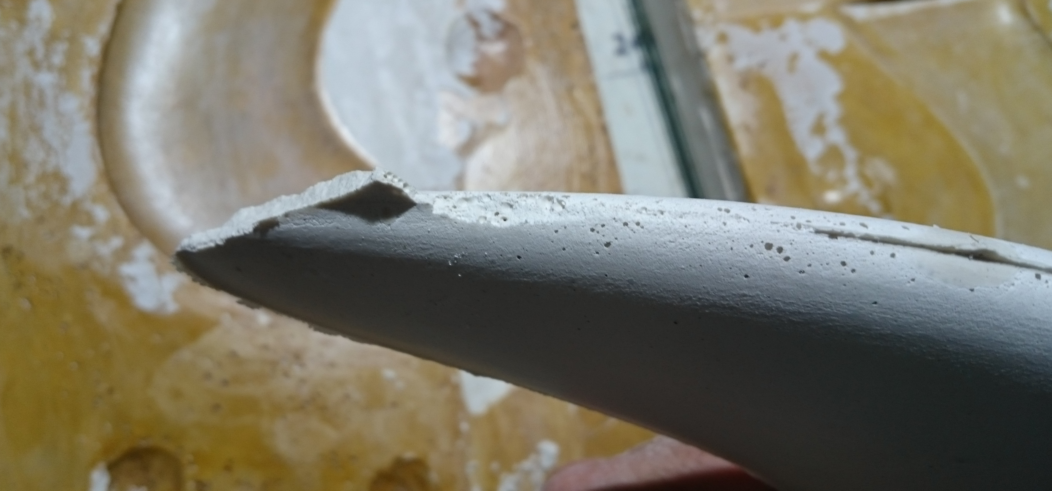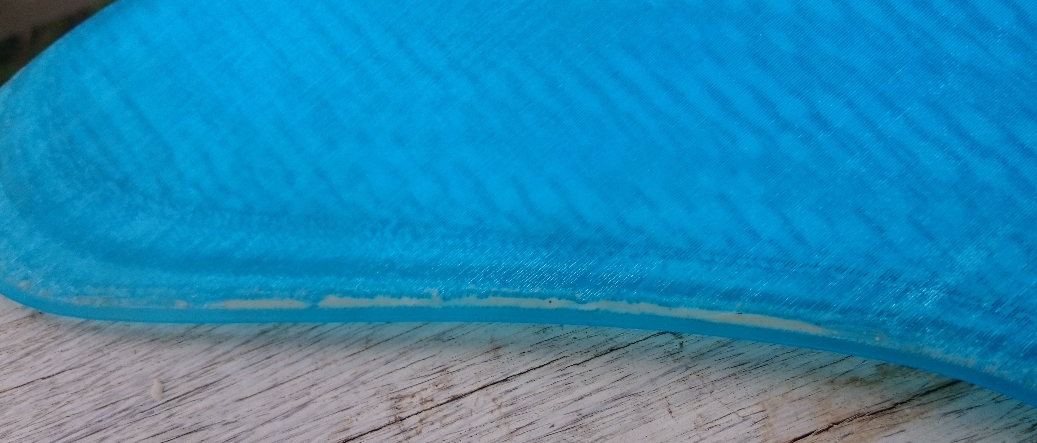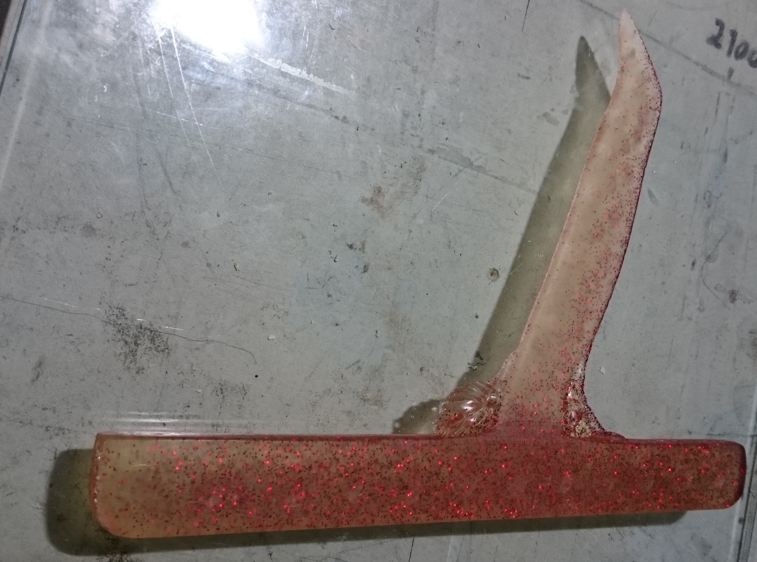 So, while applying layers of latex and waiting for them to dry, I returned to an earlier attempt to make a mould: The blue gullwing fin printed by Roy, without bumps on the leading edge. I had covered it with vaseline, Solarez Zerovoc, carbon, paddlepops, kevlar, epoxy and more zerovoc IIRC. Today, it did “eventually” come off clean from the fin and what remains is a very accurate and durable half-mould of that fin. I doubt I’ll ever use that approach again. And I don’t think there will be much use for that very tough half-mould…