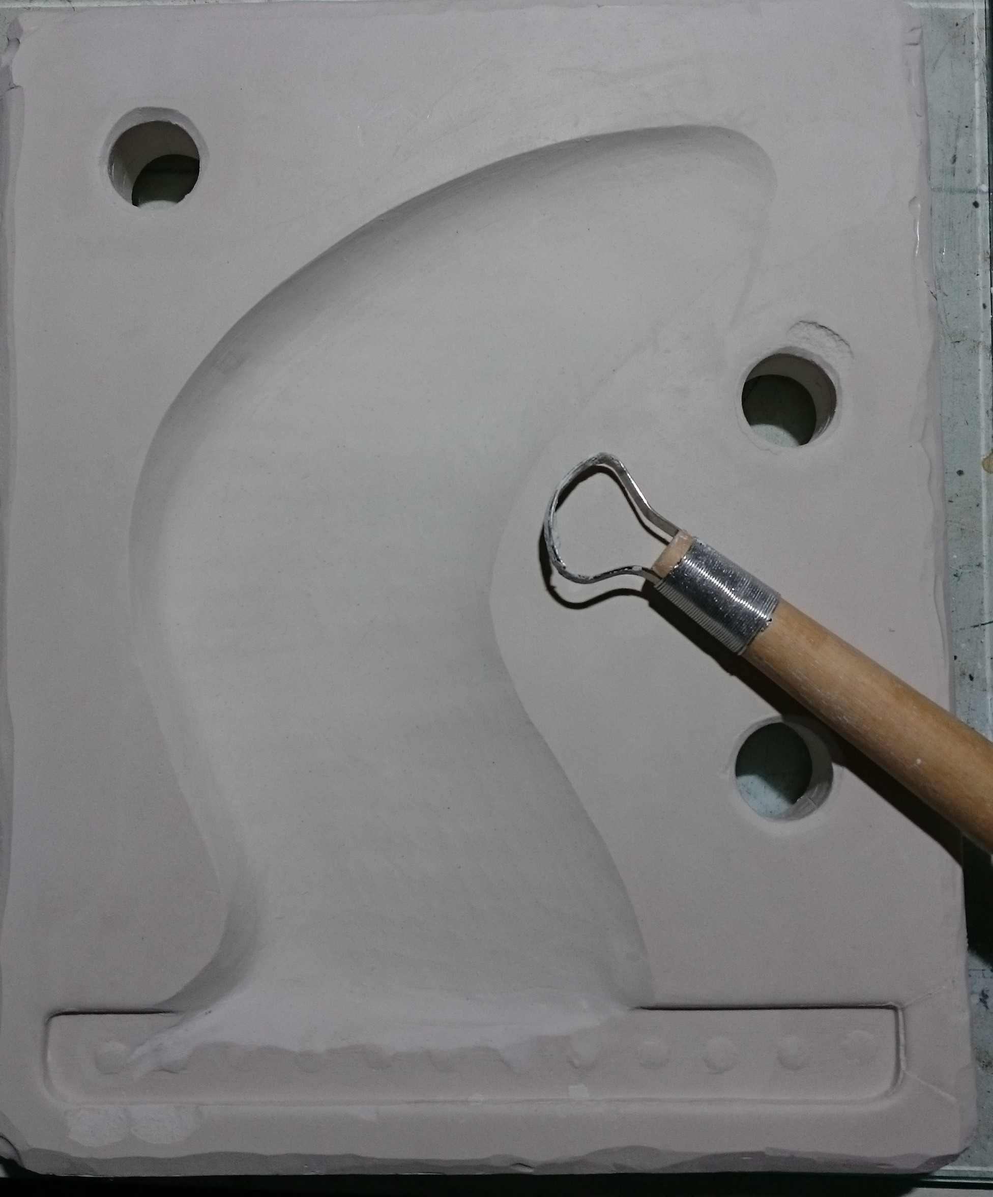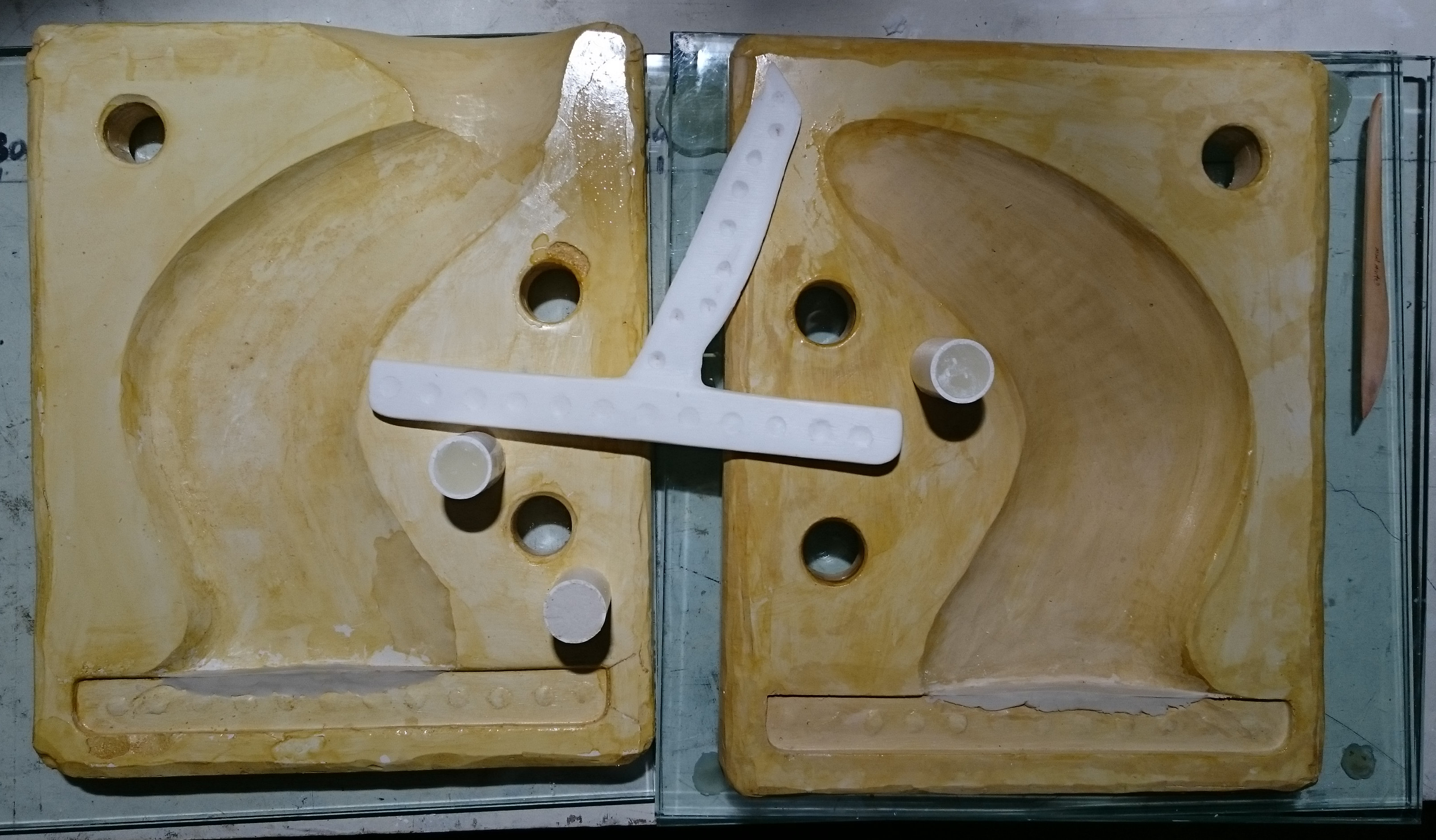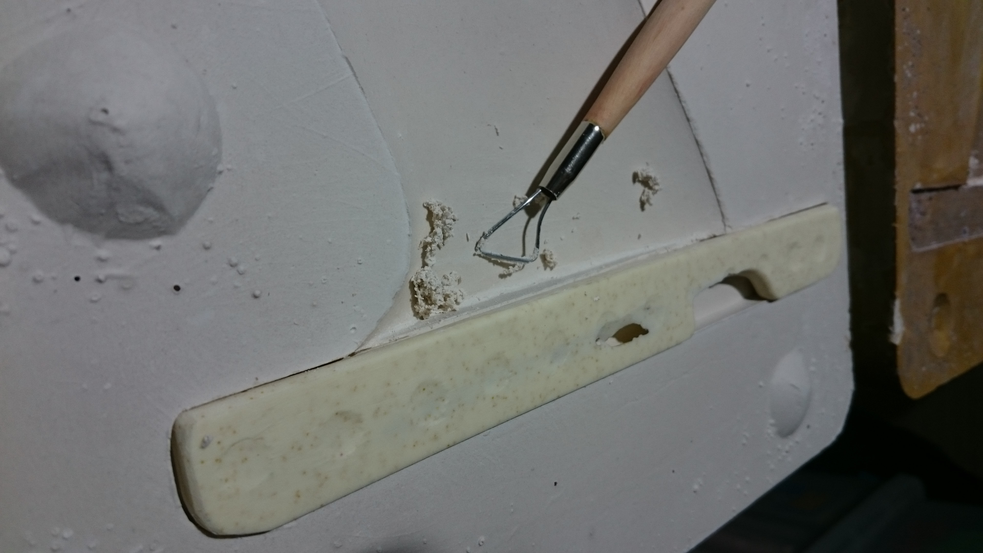 Clean surface of Pop while still soft (within 1-2 hrs of pouring it) with tissues, scraper, vacuum cleaner, various tools and attention to detail. Cut multiple “keys” into the Pop surface. All this without dislodging the fin from the plaster. I’m still aiming for a level surface between split mould halves.