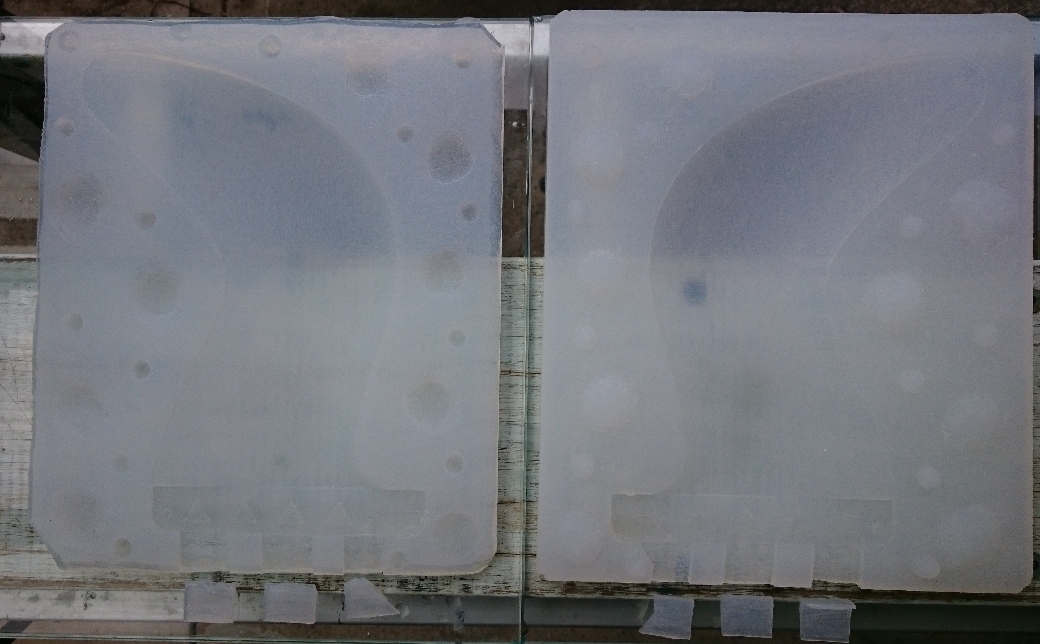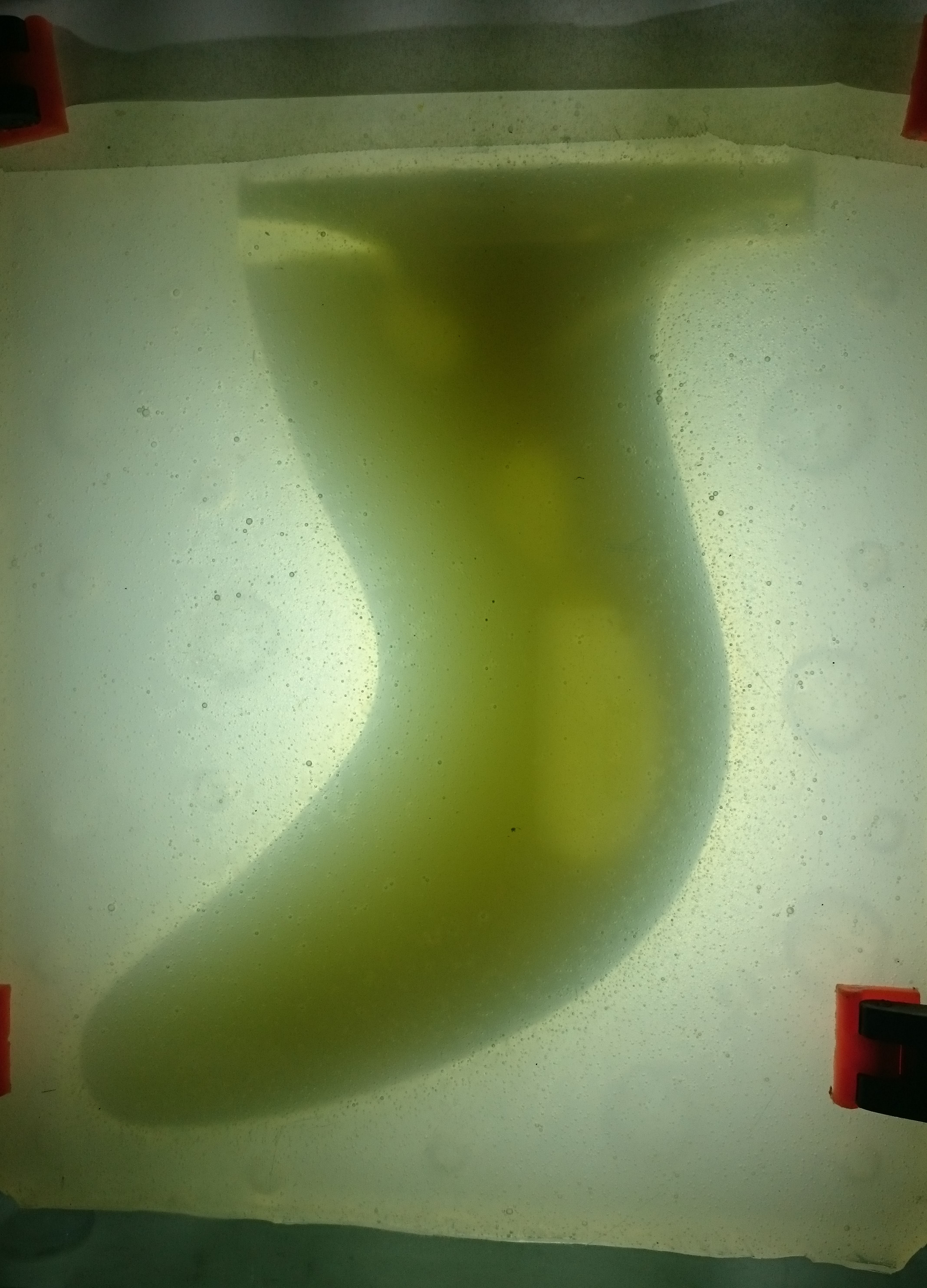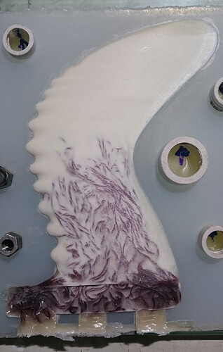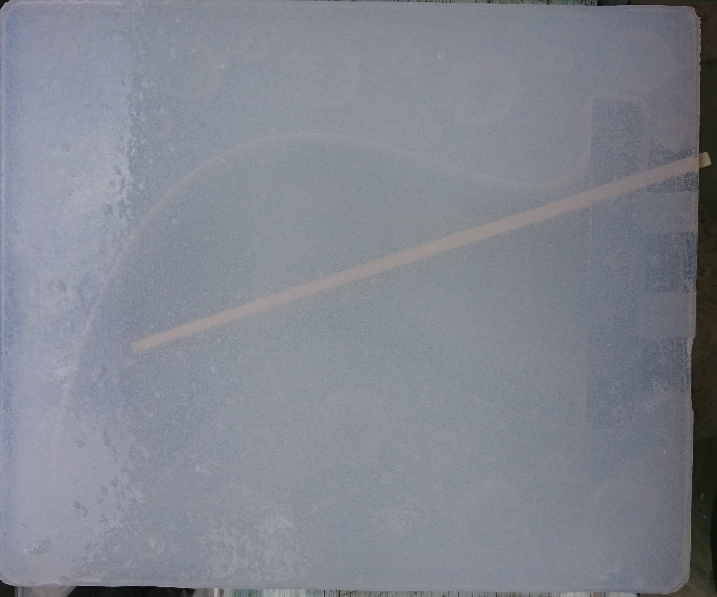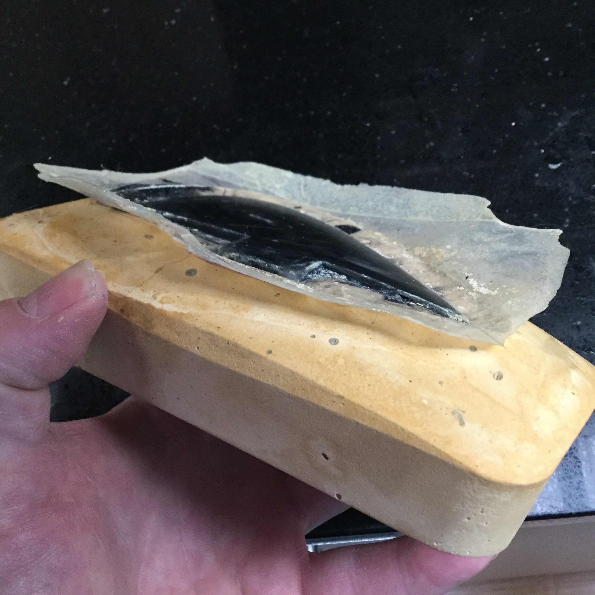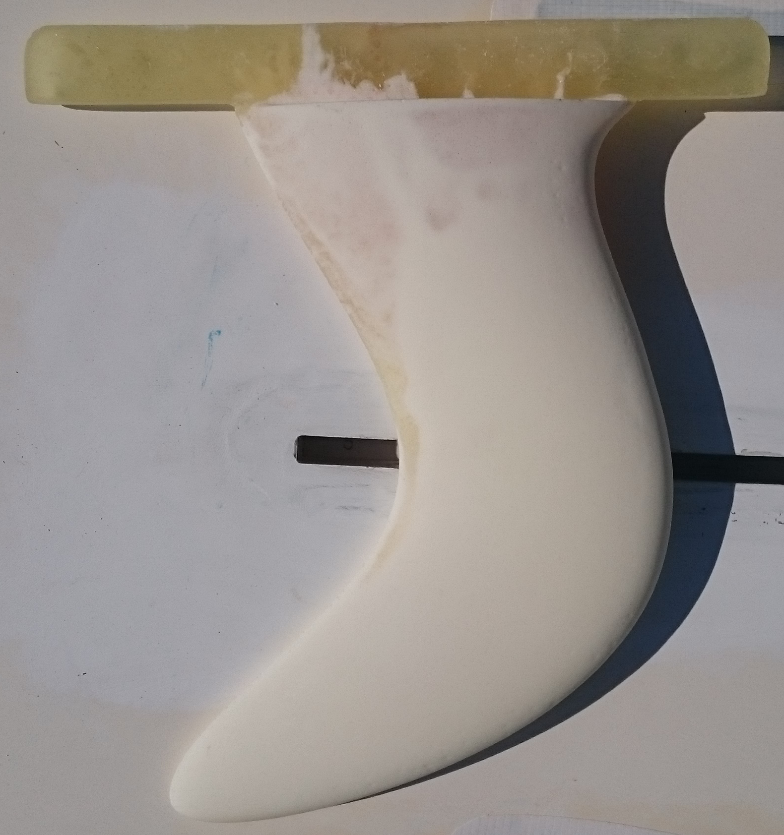 Just two small bubbles at the trailing edge (and a big inconsequential bubble towards the back of the fin tab) got away from my ‘real time visual quality control’ (transparent silicone between glass plates). These two bubbles got away because yours truly was stupid enough to put baking paper in the way, so that the bubbles could not be seen. In my defence, I tried to pull the paper out, but the paper would not budge, and I figured that separating the glass plates while the resin was still liquid would have been much riskier than not being able to see what happened close to the fin tab.