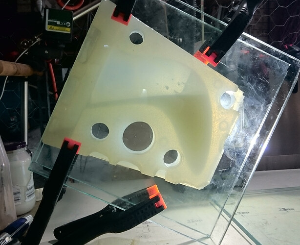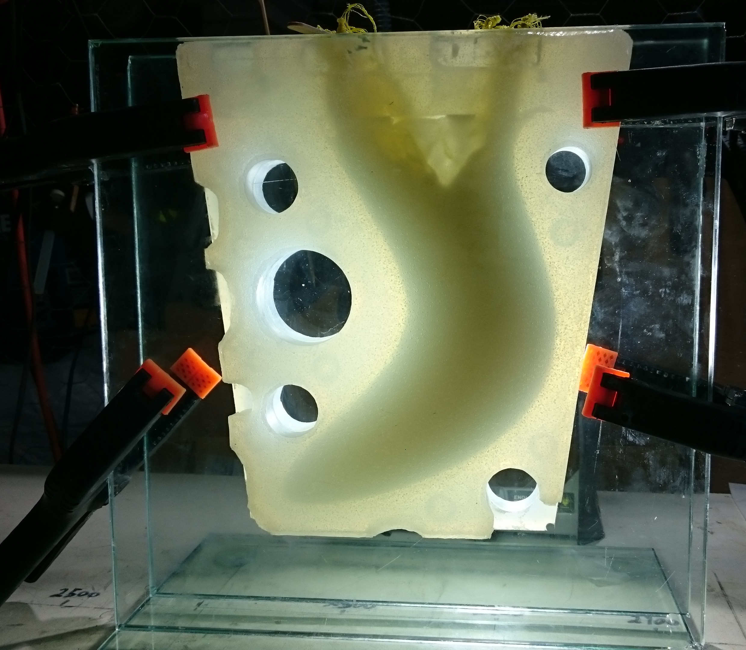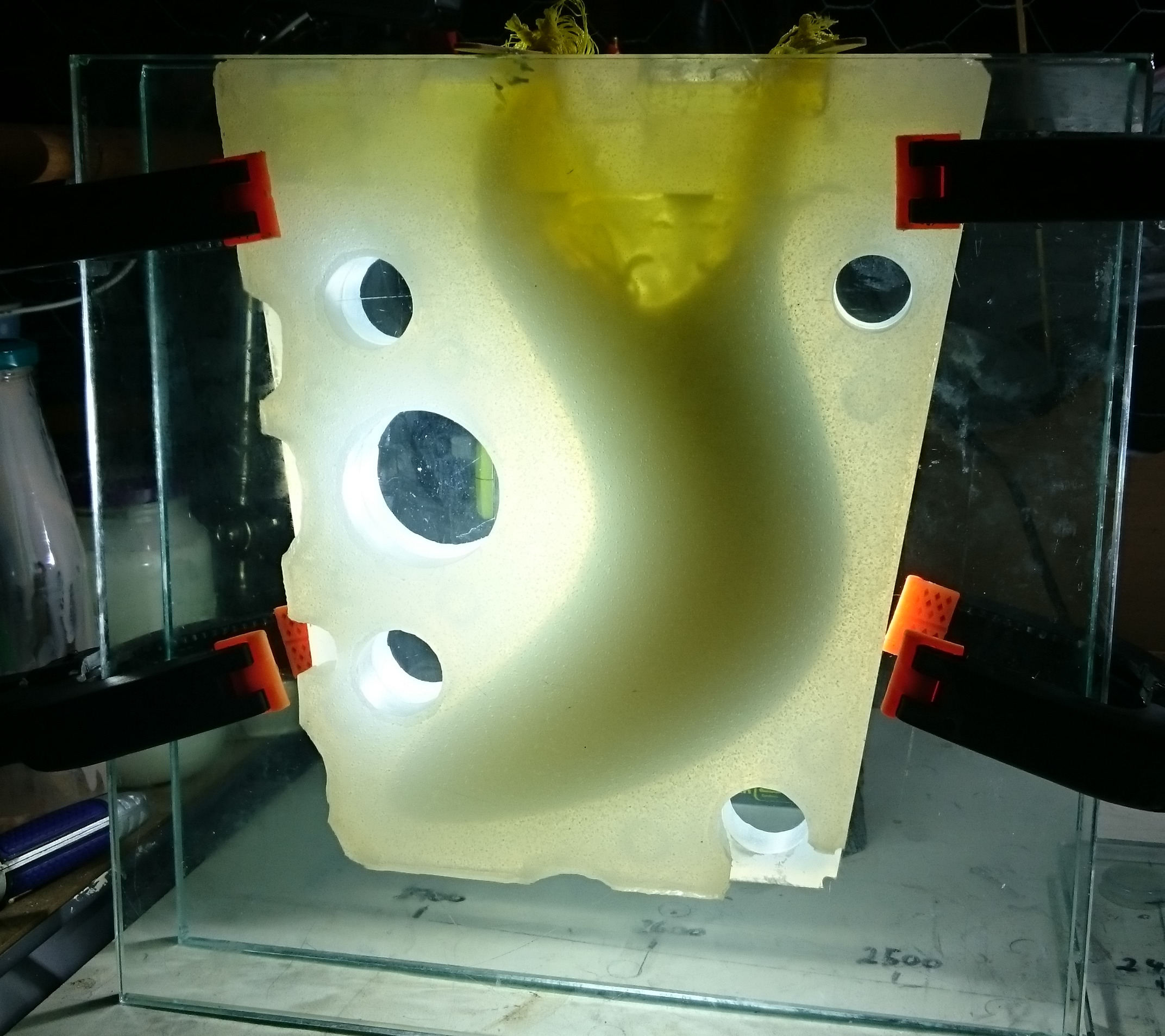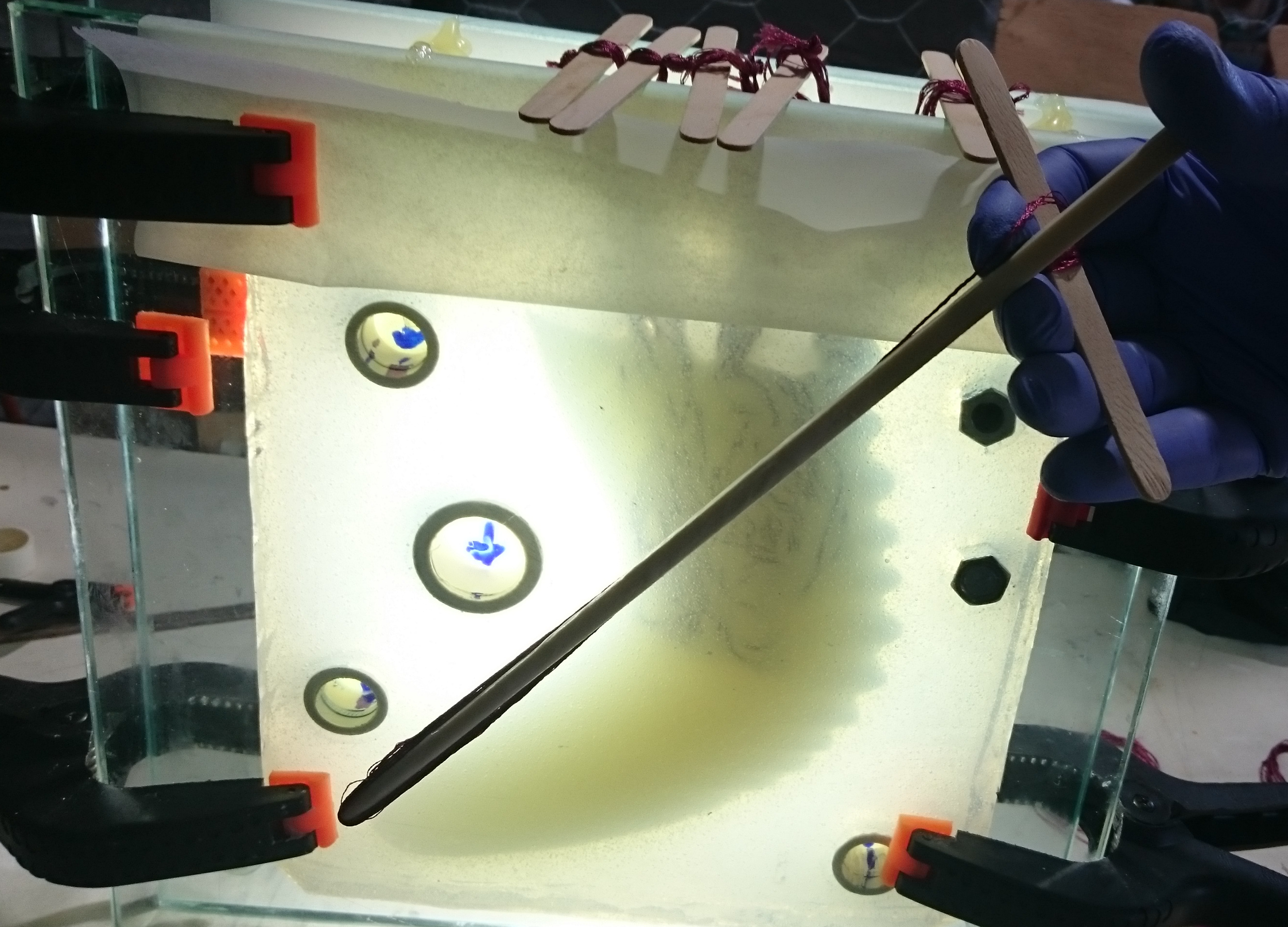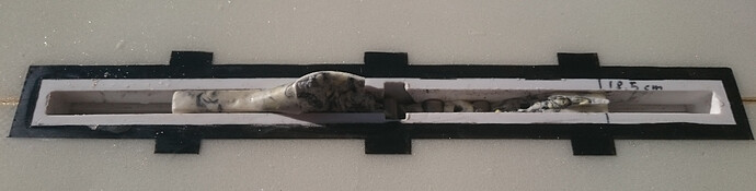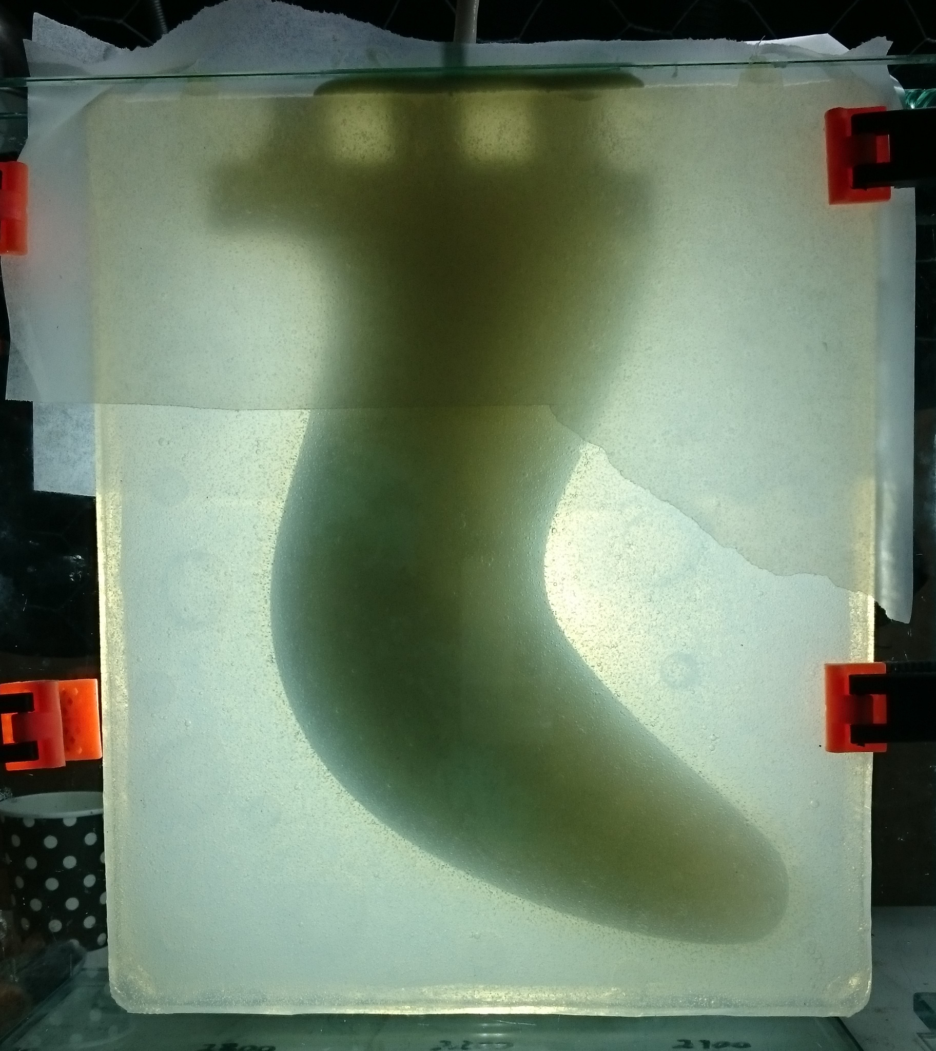Just two small bubbles at the trailing edge (and a big inconsequential bubble towards the back of the fin tab) got away from my ‘real time visual quality control’ (transparent silicone between glass plates). These two bubbles got away because yours truly was stupid enough to put baking paper in the way, so that the bubbles could not be seen. In my defence, I tried to pull the paper out, but the paper would not budge, and I figured that separating the glass plates while the resin was still liquid would have been much riskier than not being able to see what happened close to the fin tab.