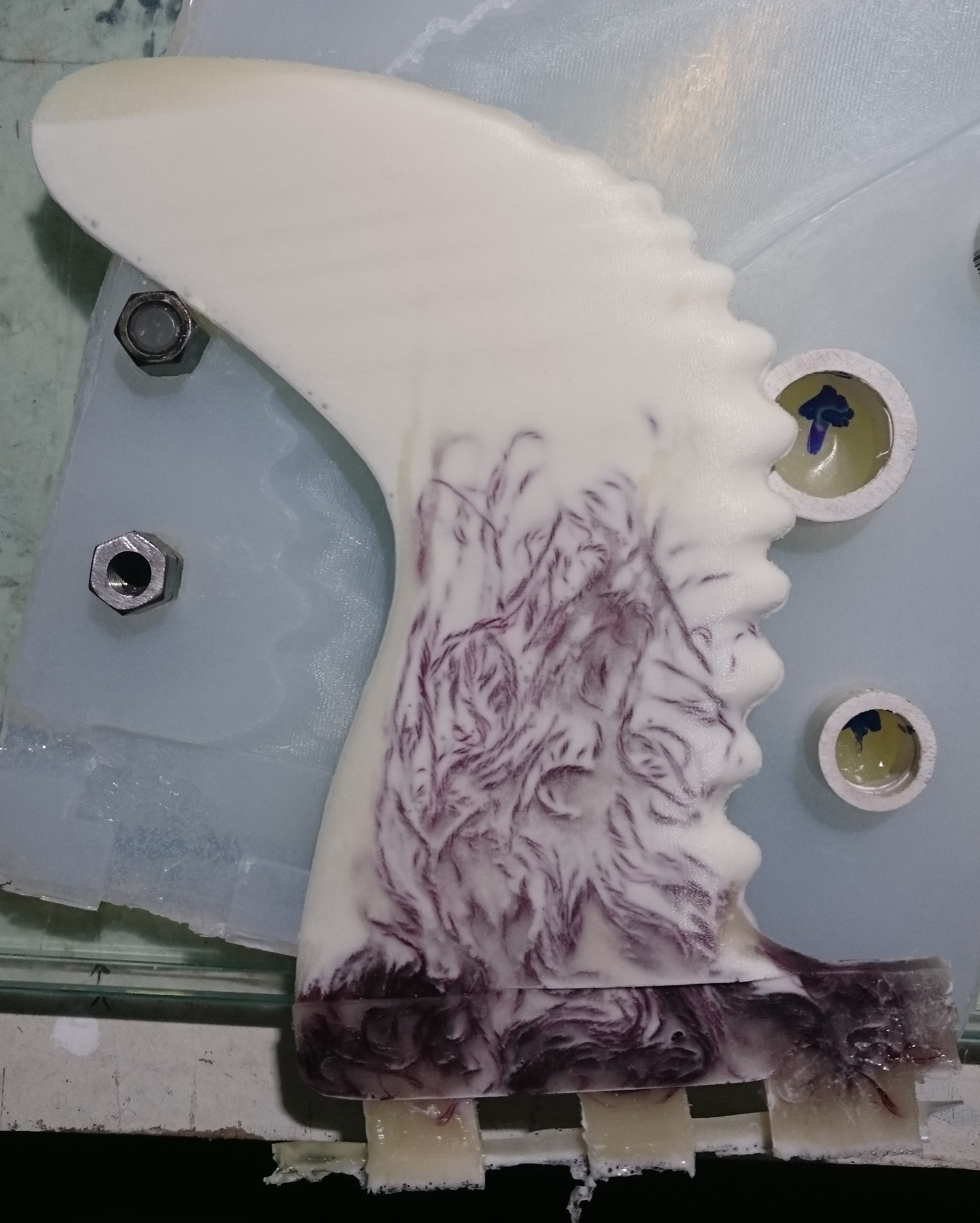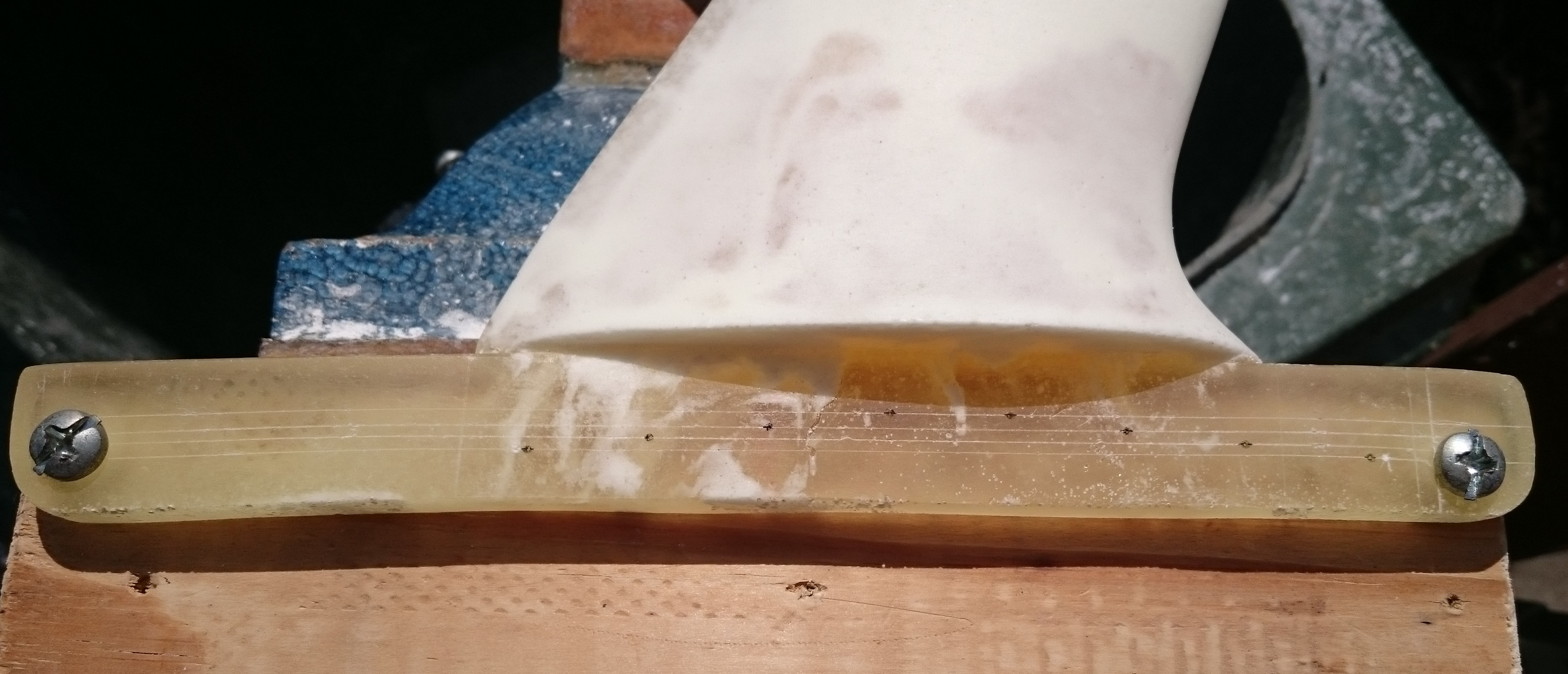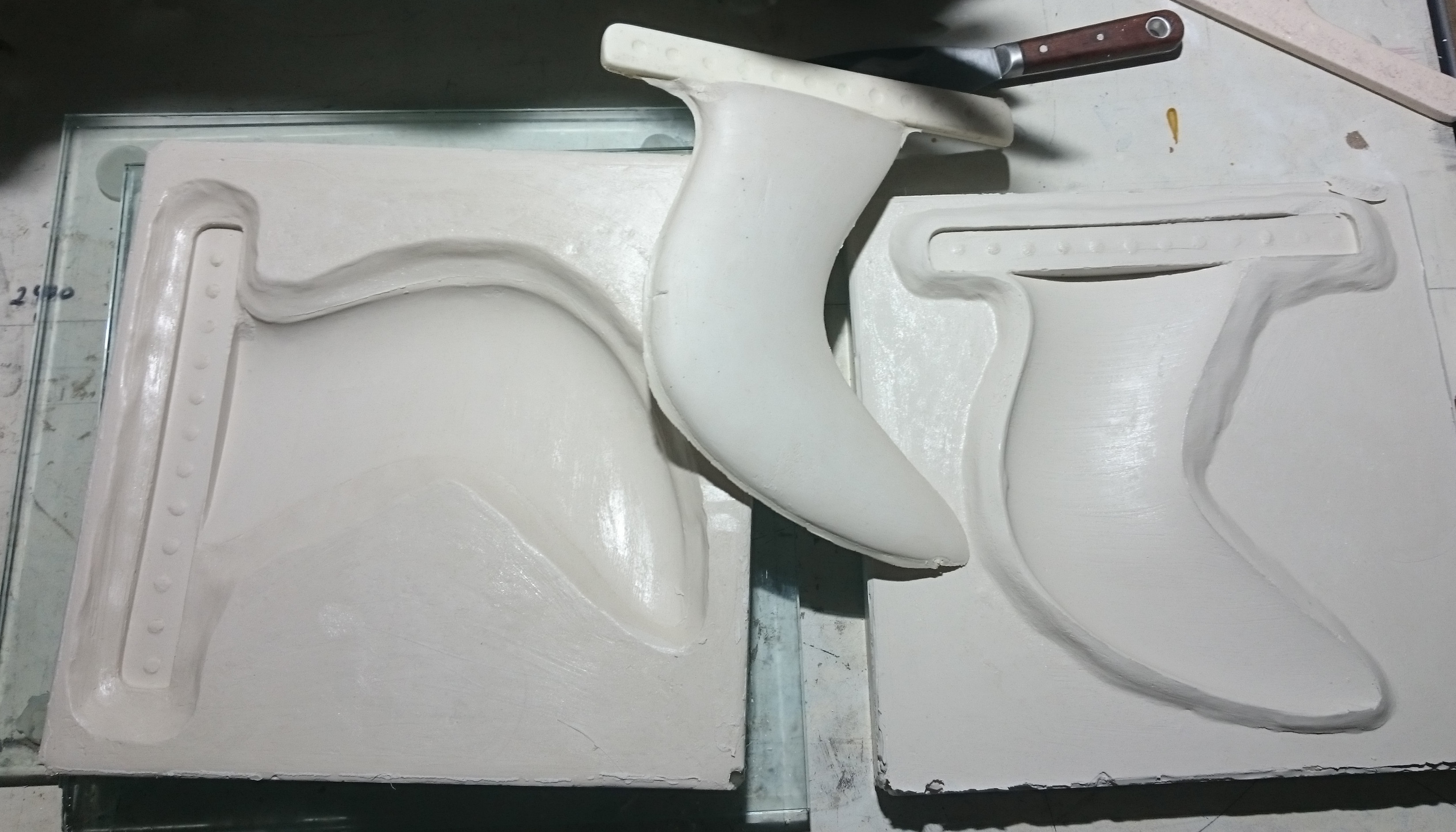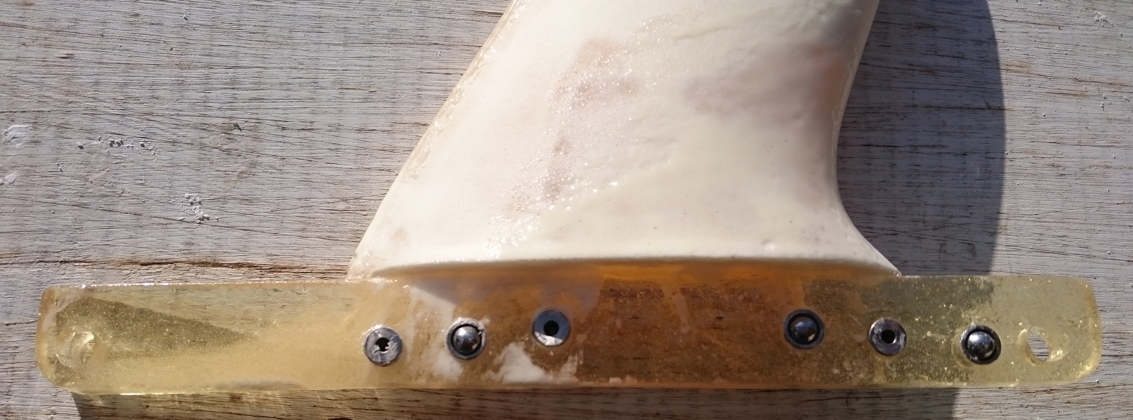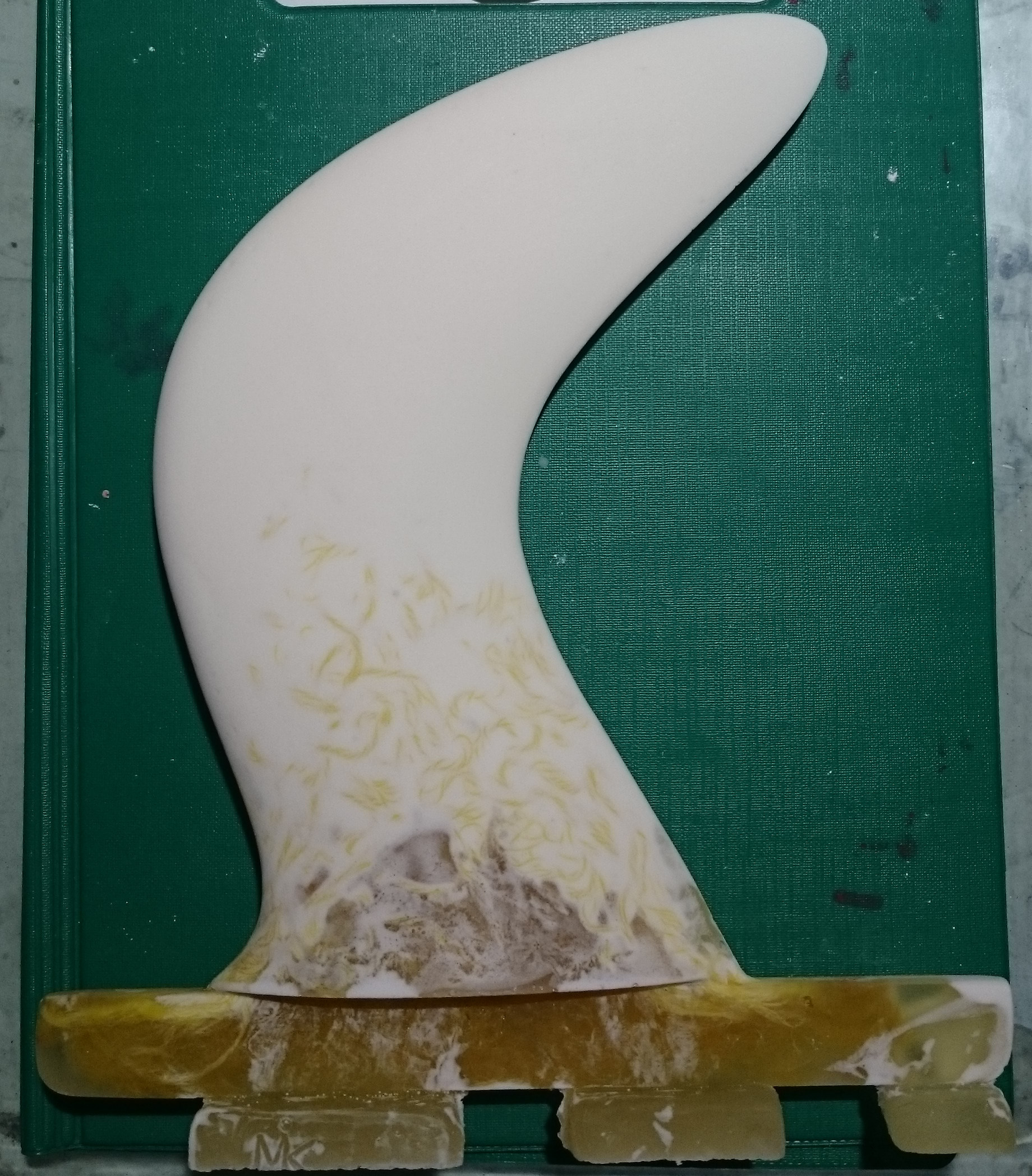 The first cast of the Eppler Gullwing fin turned out near perfect. That’s assuming that it is strong enough to not snap off when surfing…the 10-15mm long silk fibres certainly made the runny resin much thicker, I hope they also strengthen set epoxy a lot.