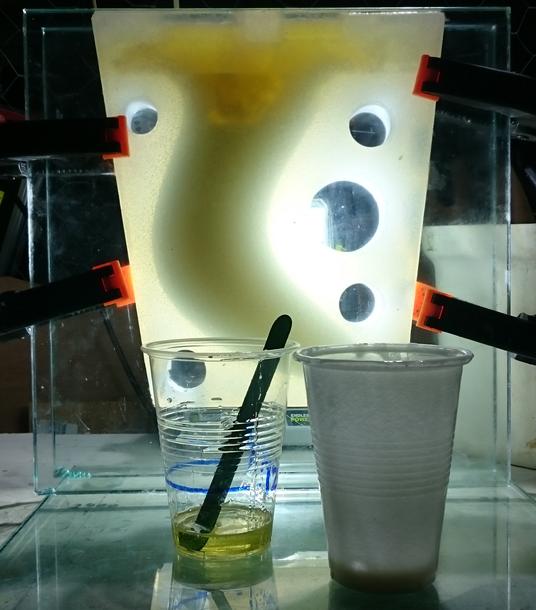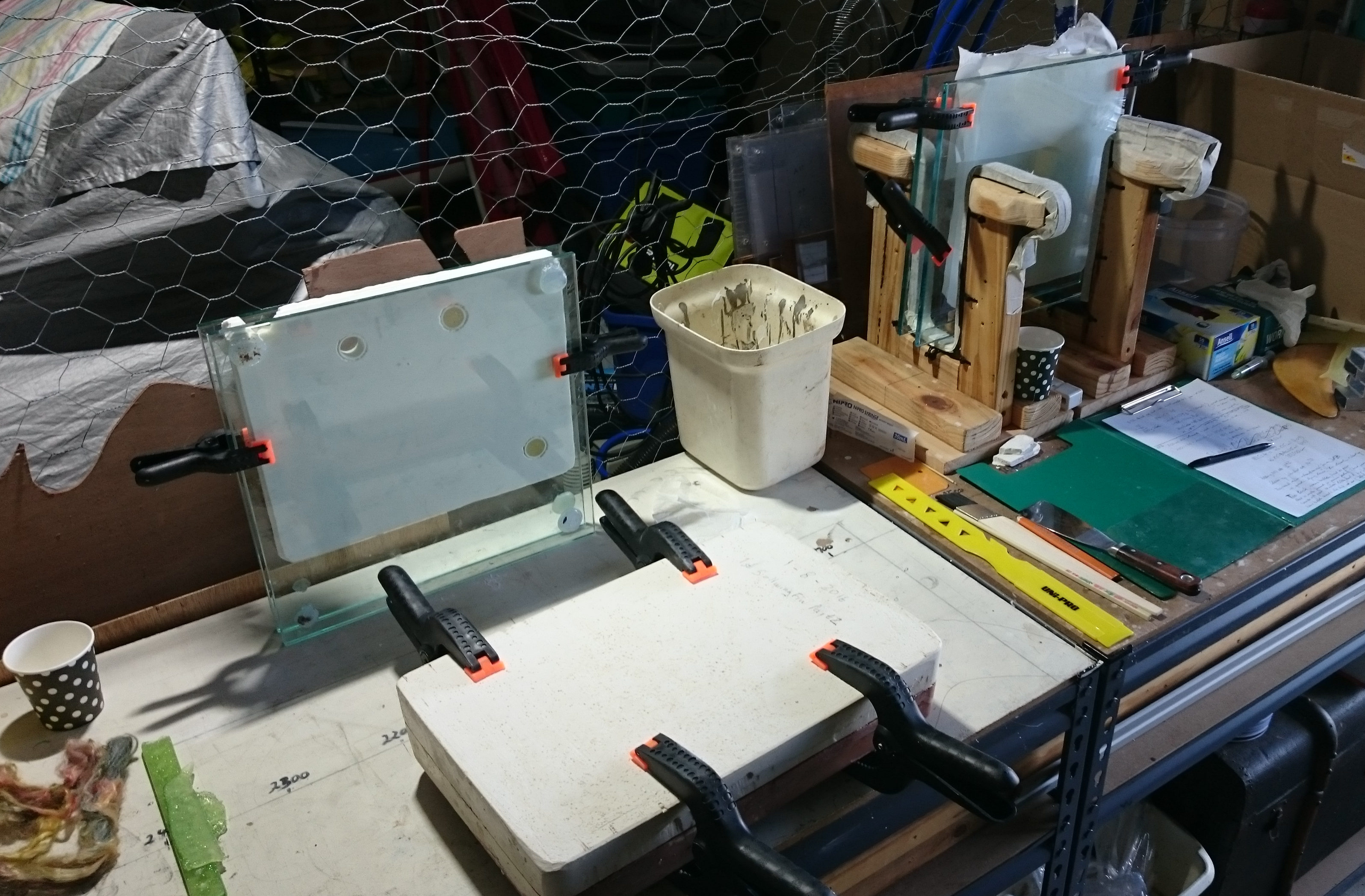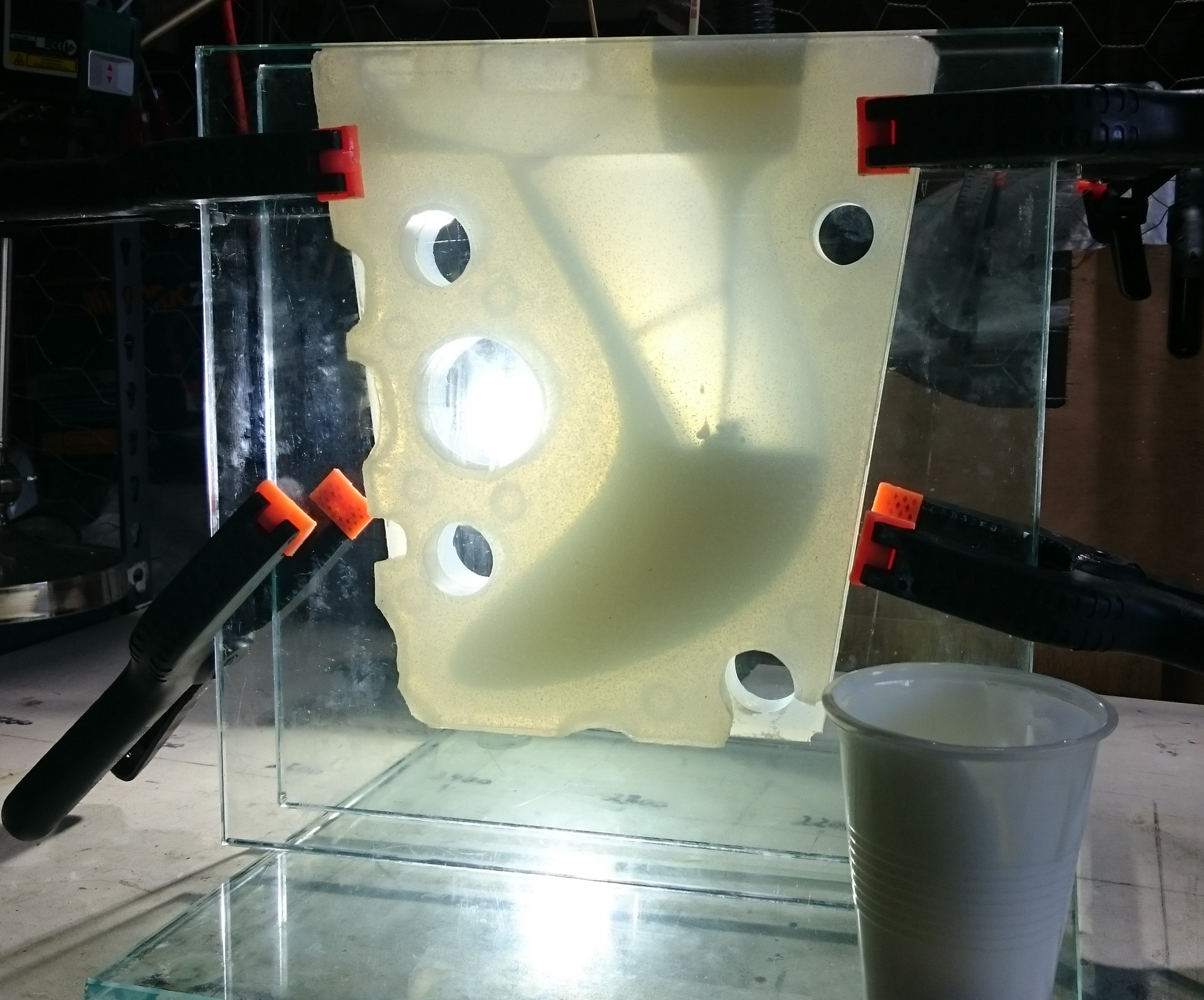 The baking paper works very well to prevent resin and hot glue bonding to the glass plates, but it needs to be applied more judiciously. A short length between glass and silicone is enough, and a longer part on the outside of the glass can be torn off once the potentially messy pouring of resin is completed. So, overall, this is still a very good result, because bubbles like these two will be removed from the edge during future casting procedures.