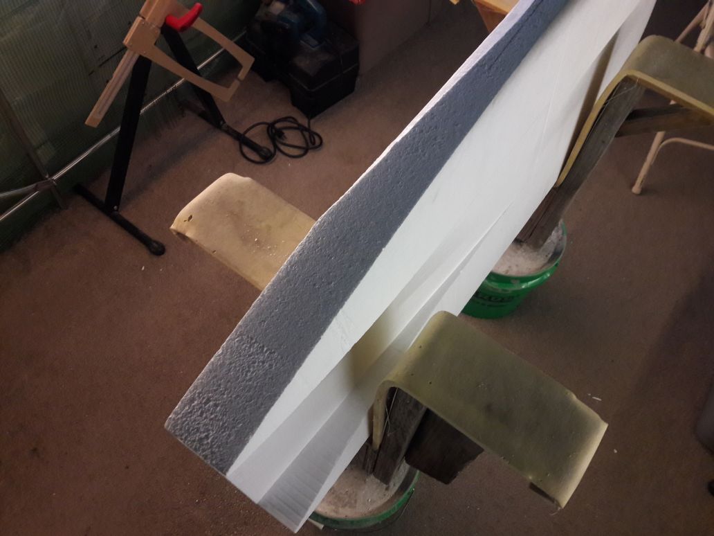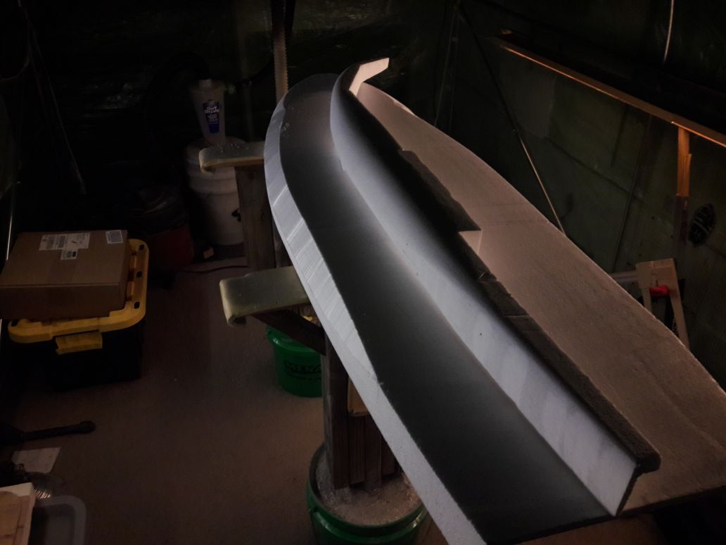 Channel attempted via CNC. I say attempted as it was not 100% successful. The overall length and depth of the channel exceeds my small CNC’s working limits. I still decided to try removing the main bulk with the CNC and leaving the first 4.5" long of channel entry as a hand-sanded feature. The machine tripped the Z limit switches both up and down, losing Z position and nicking the blank…but with some filler and sanding it should play. There are also few good hot wire ‘twangs’ that will need attention as well. I did not cut the blank to allow a global sanding of all my hot wire misdemeanors so they will get spackled or glass micro-spheres and epoxy towards the end…