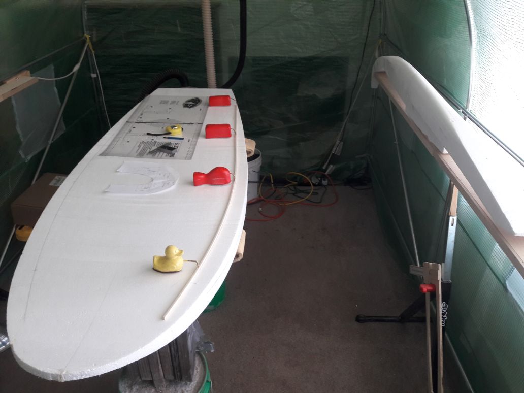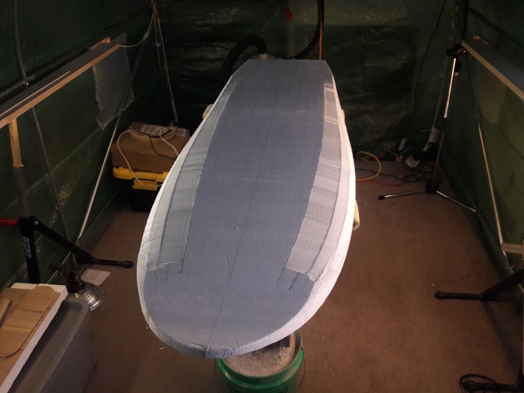It’s been a while since I worked on a board. I got a notion to try making one of these for myself after being a part of the team that realized the design. I needed to work my way down into a block of EPS for a different longboard blank I wanted and had enough foam for one of these.