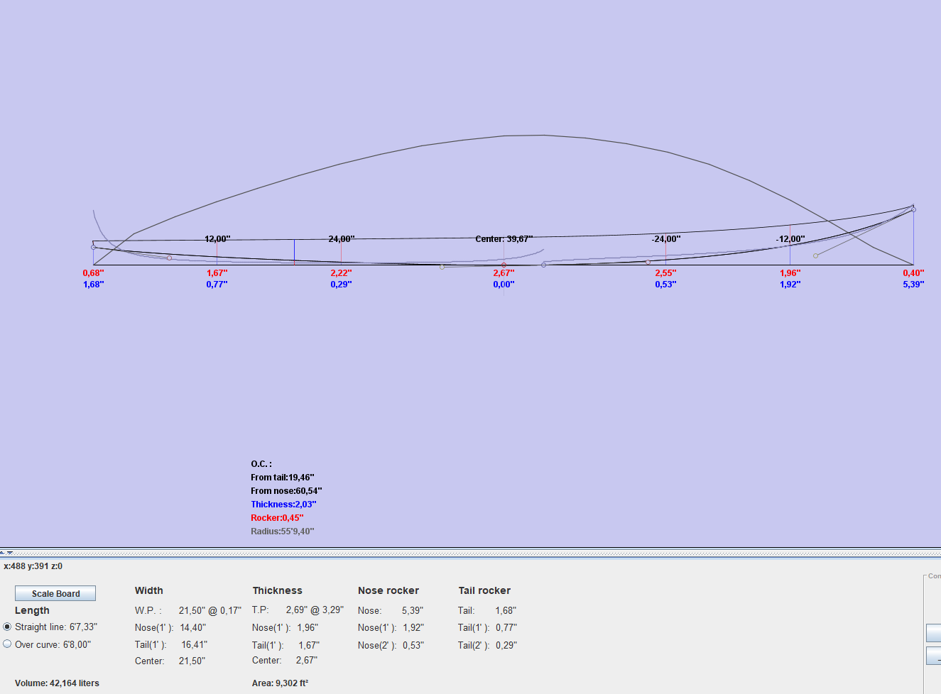 Dims are 6’8" x 21.5" x 2.69", coming out at about 42.1 L. Wide point is basically centered (+0.17"), and center of mass is roughly centered as well.