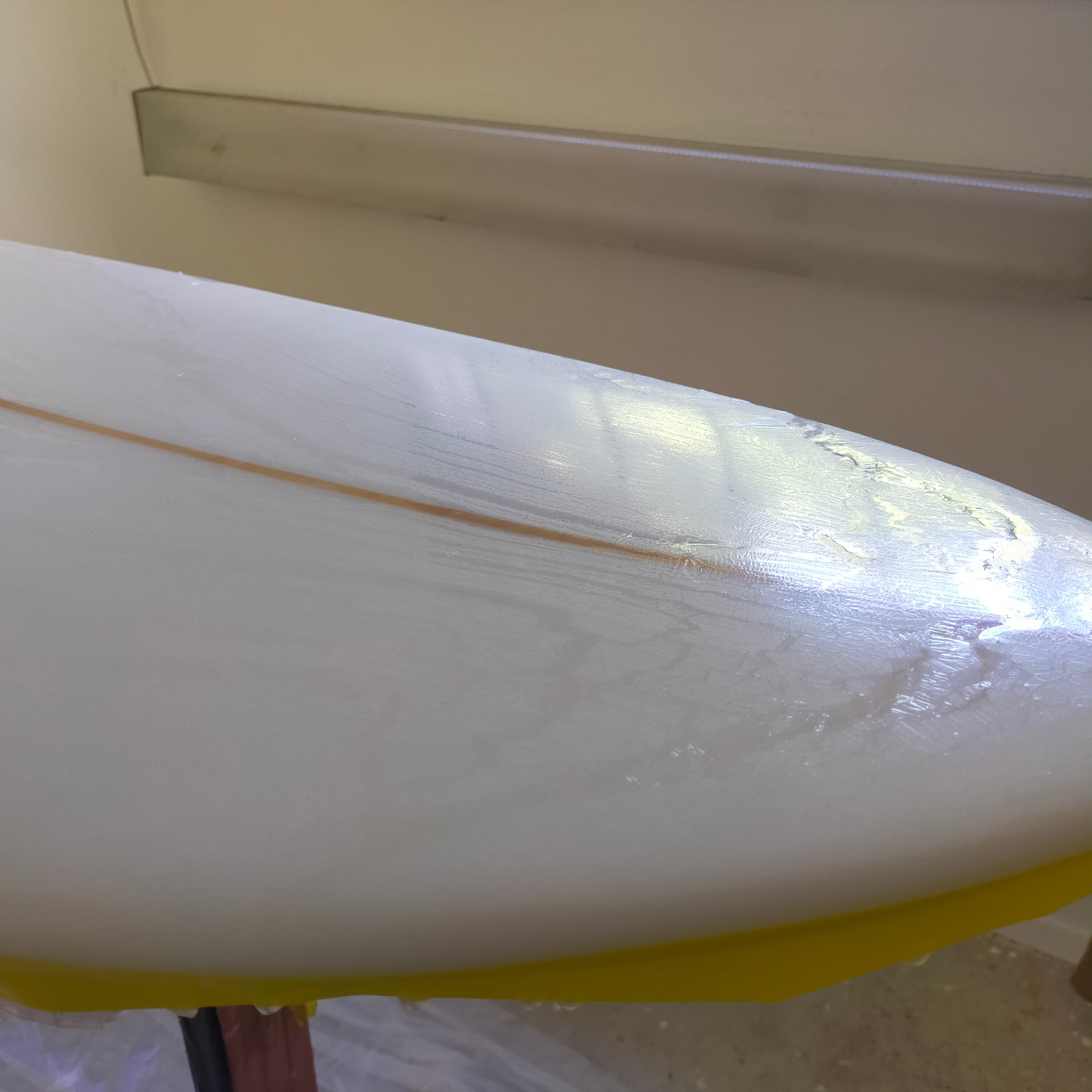 Am building my first board and have come across an issue with my hotcoat today. Using Kinetix epoxy resin and hardener. Triple checked I had the ratio right, weighed out both parts and mixed thoroughly. The resin poured on ok and looked clear, shiny and flat after brushing out. But when I came back to check it 10-15mins later it had gone all streaky and had a sort of ‘skin’ on it.
