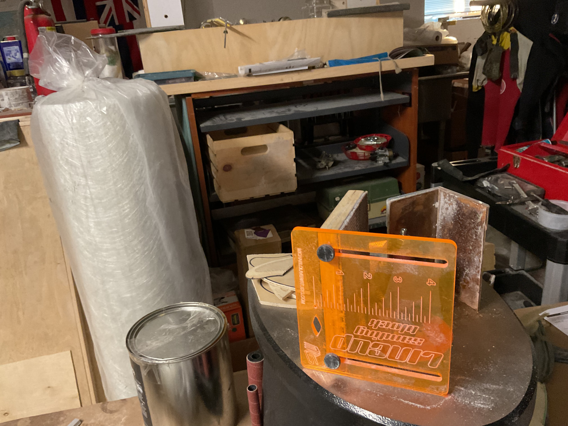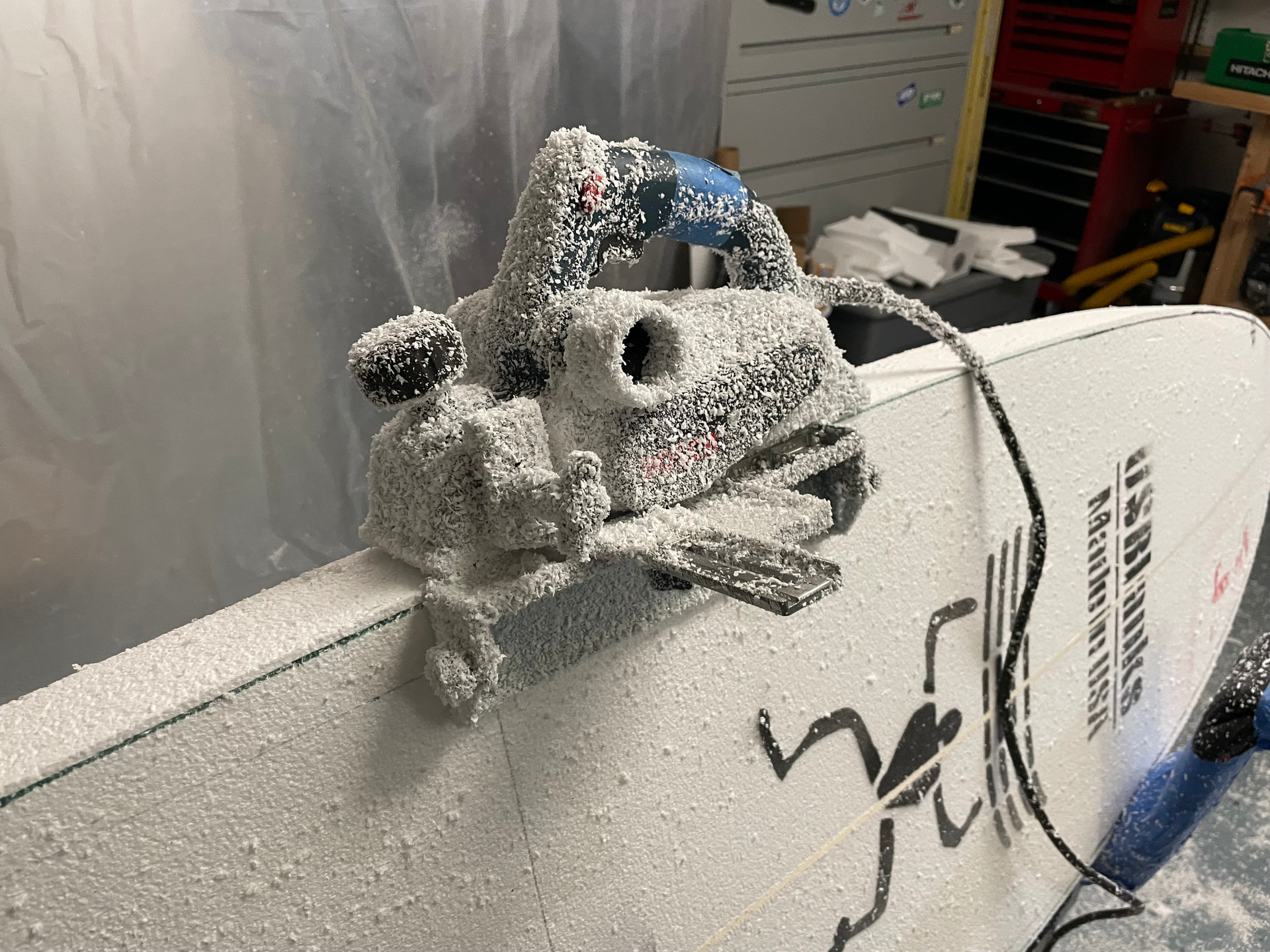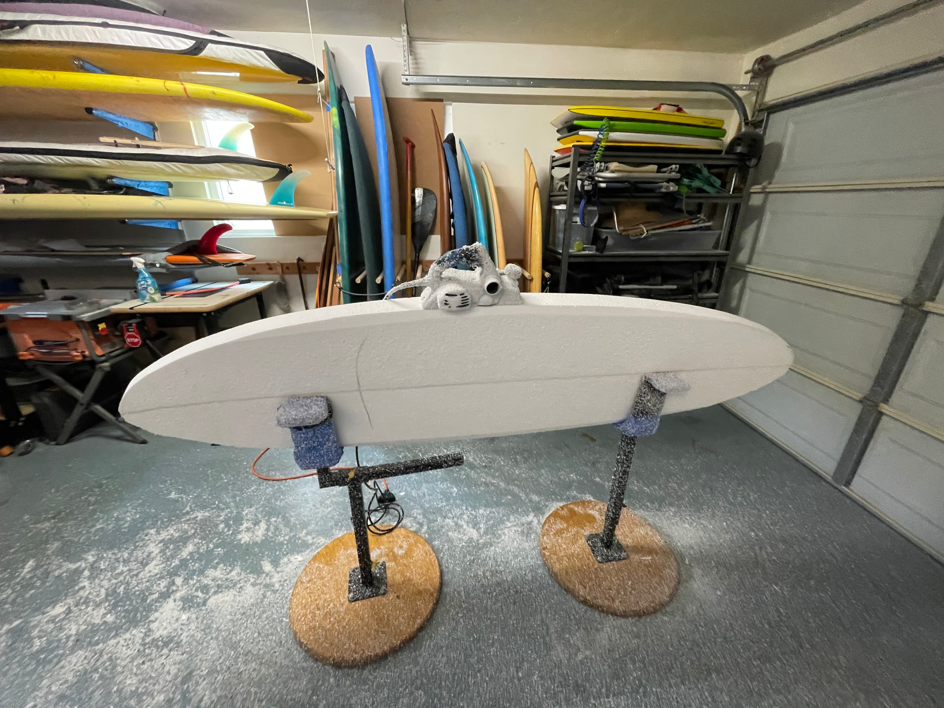 I’m tired of building my own shaping tools. Last one was a tool for sanding perpendicular walls without removing foam from the channel bottom — that could swap out different sandpaper grits. About to use the same grit swap-out concept for the fence-post level profiler.