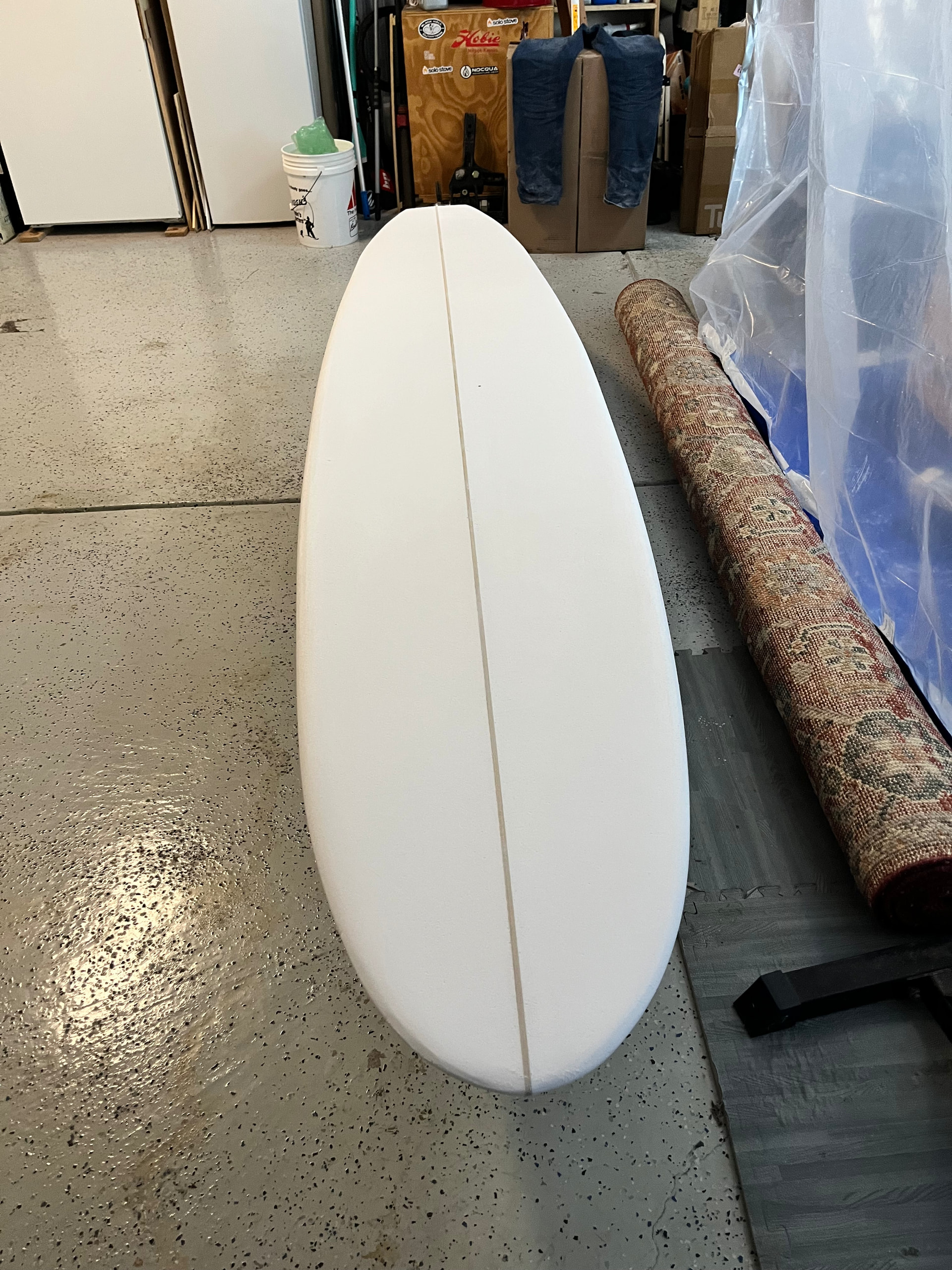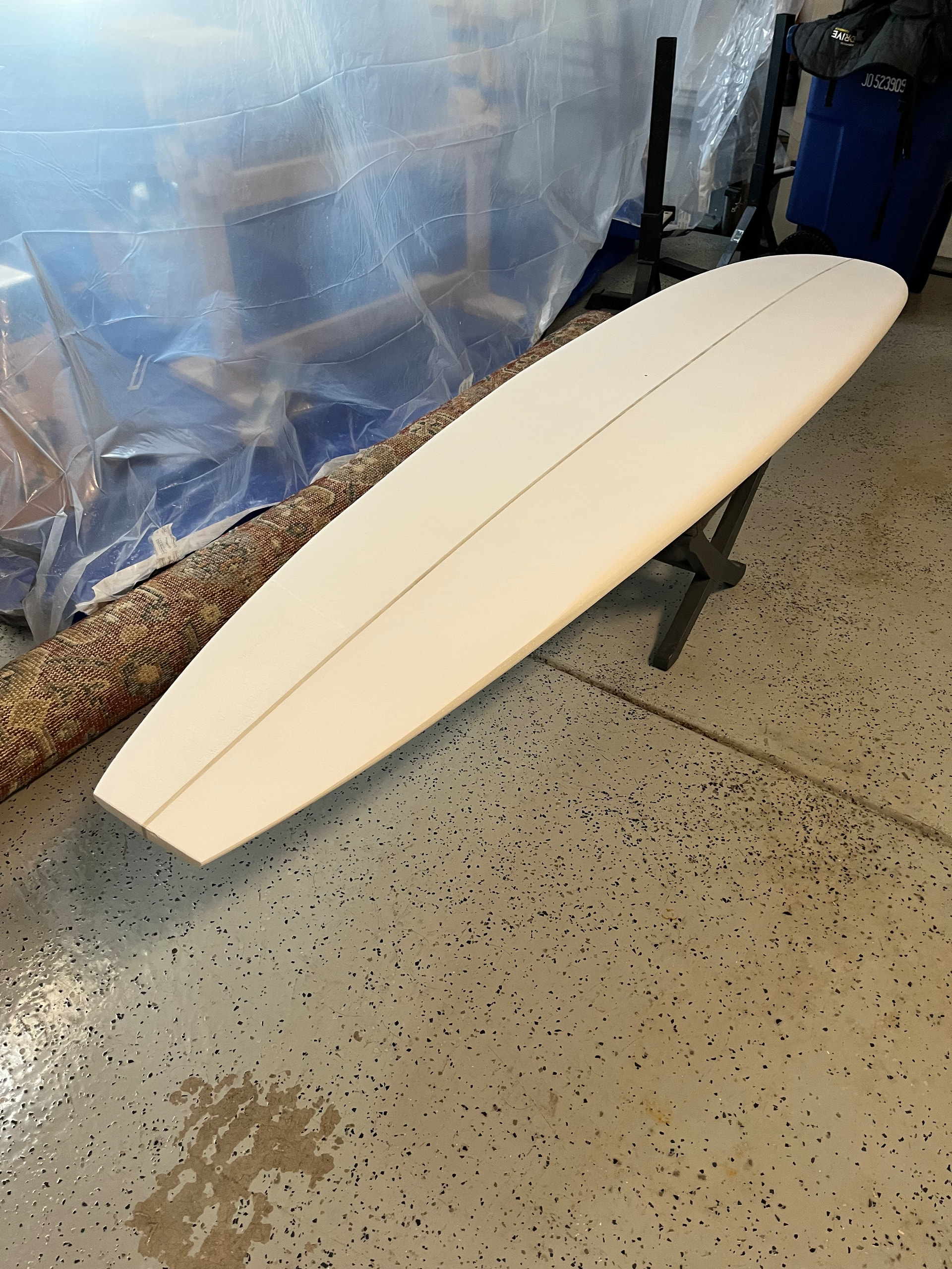 I don’t have dedicated shaping bay…put plastic sheets up as walls in garage so my lighting wasn’t great…but I used handheld work light as best I could.