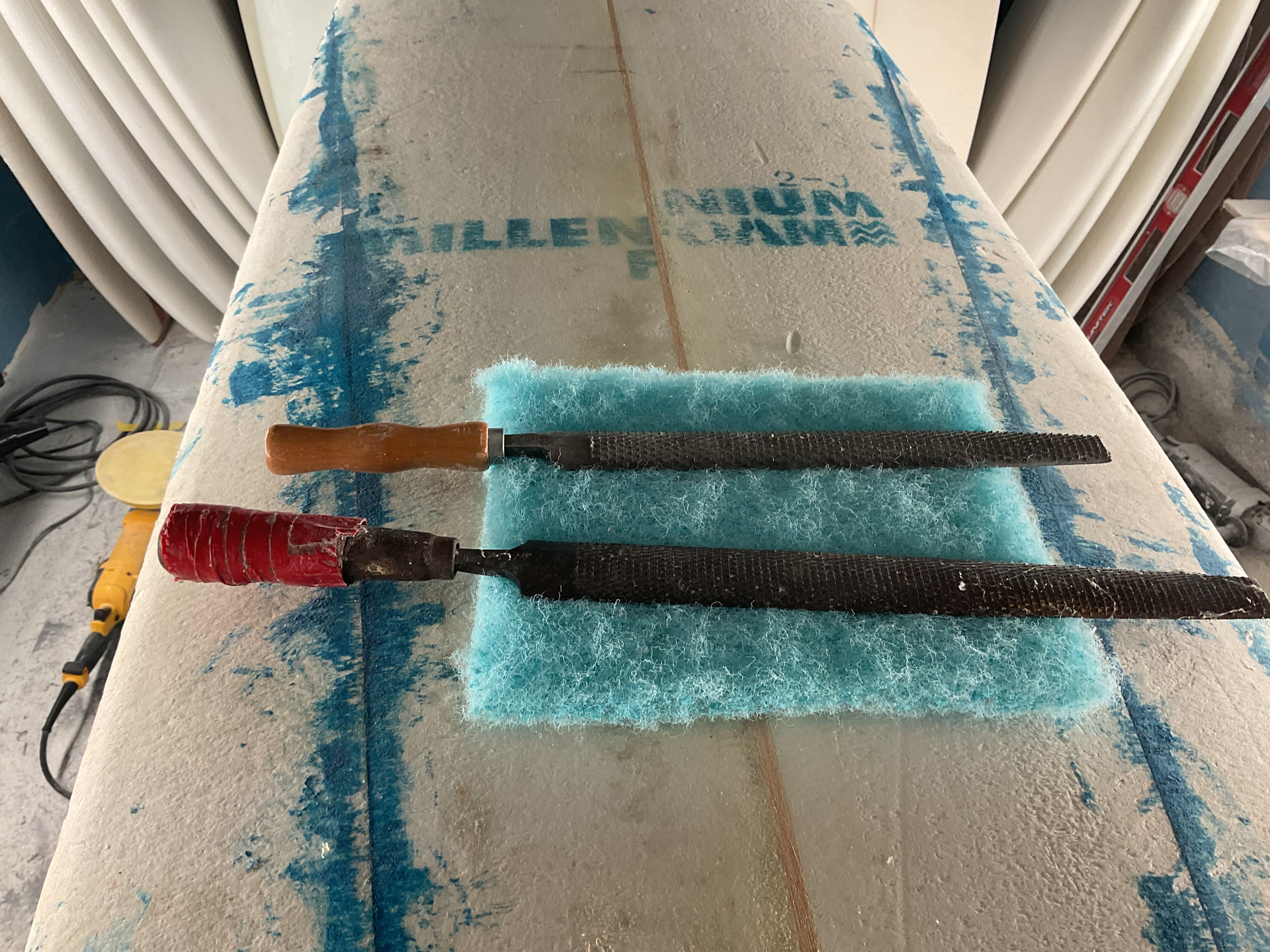 Use a micro round rasp to round over the top of the stringer between the swallows. Then a piece of sand paper to blend the inside swallow foam into the finished stringer. These are available at Foam EZ for around $12.
