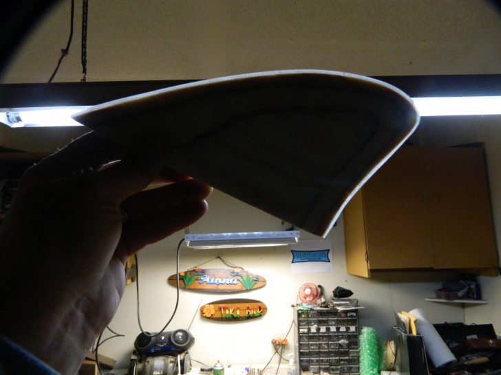 Here’s the new fins, a much better effort than the first try. They’re laminated with 4oz. cloth & Solarez. They were glassed and sanded in 30 minutes, that stuff is amazing, it was really cloudy and it still went off in 3 minutes.
