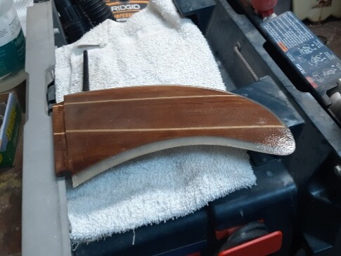 The fin was shaped from the same wood as the board, then it got 6 layers of 6 oz. fiberglass and epoxy resin each side, but with lots of sanding / shaping.