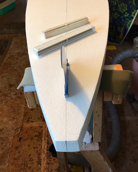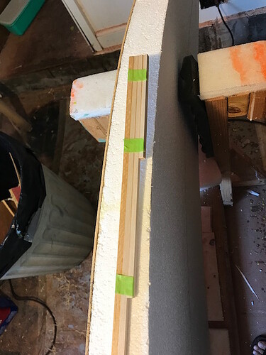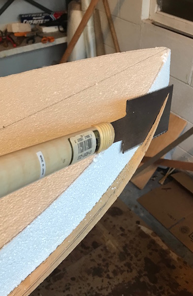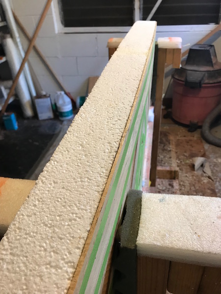 At this time the 2 layers of foam are glued together with an Elmer’s version of gorilla glue. The next step is to clean up the outline and add the rails. Once the rails are set, I’ll attach the bottom skin, then I’ll cut it to match the edge of the board.