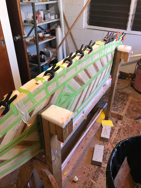 After the deck is shaped, I build the top skin, attach it, then add the last rail band and turn the rails. More to come.