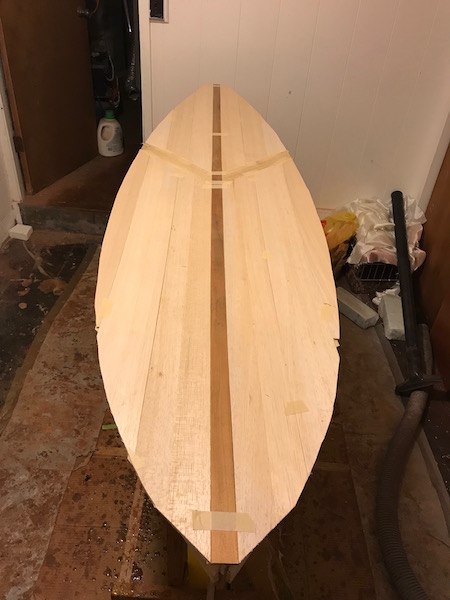 This is the board with the bottom skin and the first rail band attached. Next step will be profiling (top rocker or board thickness from nose to tail) and shaping the deck. It’s all one thickness but I’ll plane it down to the thickness I want then do the rail bands, and crown the deck.