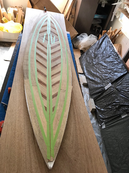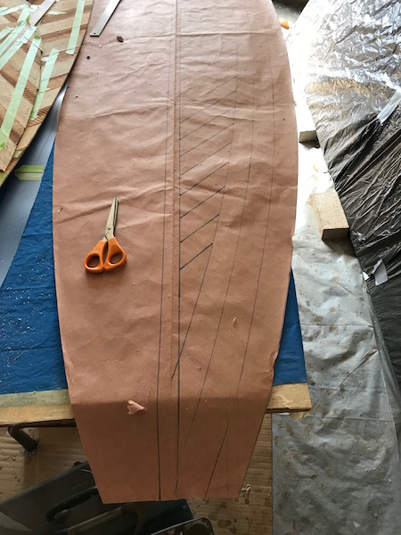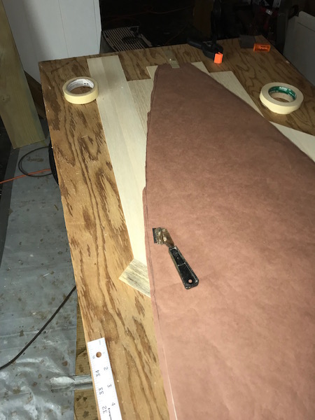 I planned to use 1/8" wood, and the deck has a lot of crowning along the rails, so I started out by making a template with a roll of heavy paper. The same stuff I used for the bottom. I drew a line where I hope to have the wood wrap down to the rail. Once the template was made I lined up my wood and taped it together. I don’t know if I’ll glue the pieces together or just tape them. I will cut groves along the underside of the outer part of the skin to help it bend around the deck. I haven’t gotten there yet.