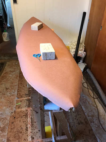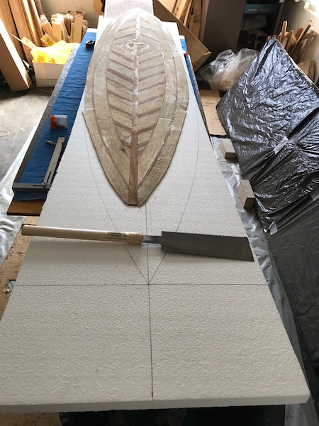 Once the skin was finished, I cut out a piece of 1" thick EPS from Home Depot about 1/4" wider than the template. The skin is also wider that the template, but I’ll cut them back later. The next step is to cut out the top layer of EPS (1.5" thick), then I’ll glue it all together using epoxy resin and probably just use bricks to weigh it all down onto my rocker bed. I may add a layer of 4oz glass under the wood, not sure.