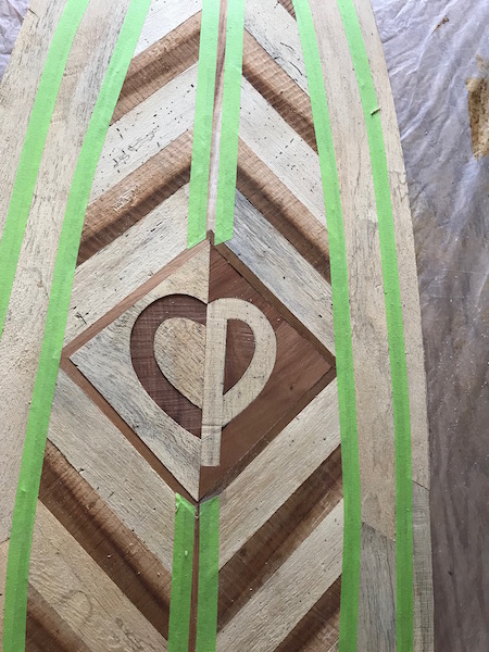 I decided to try another version of the heart and initials using Koa for both letters. I thought the other version had too much contrast between the 2 halves. I also decided to cut the foam to size and add the 1st layer of wood rails before I glue the bottom skin on. I started making another rocker bed, but inverted from the one I have now. I plan to make the rocker bed with an 8’ board outline to make it easier to glue on the rails. I may eventually just make a single rocker bed that has the same rocker on each side. My brother did that and it’s way easier to make these boards using that one.