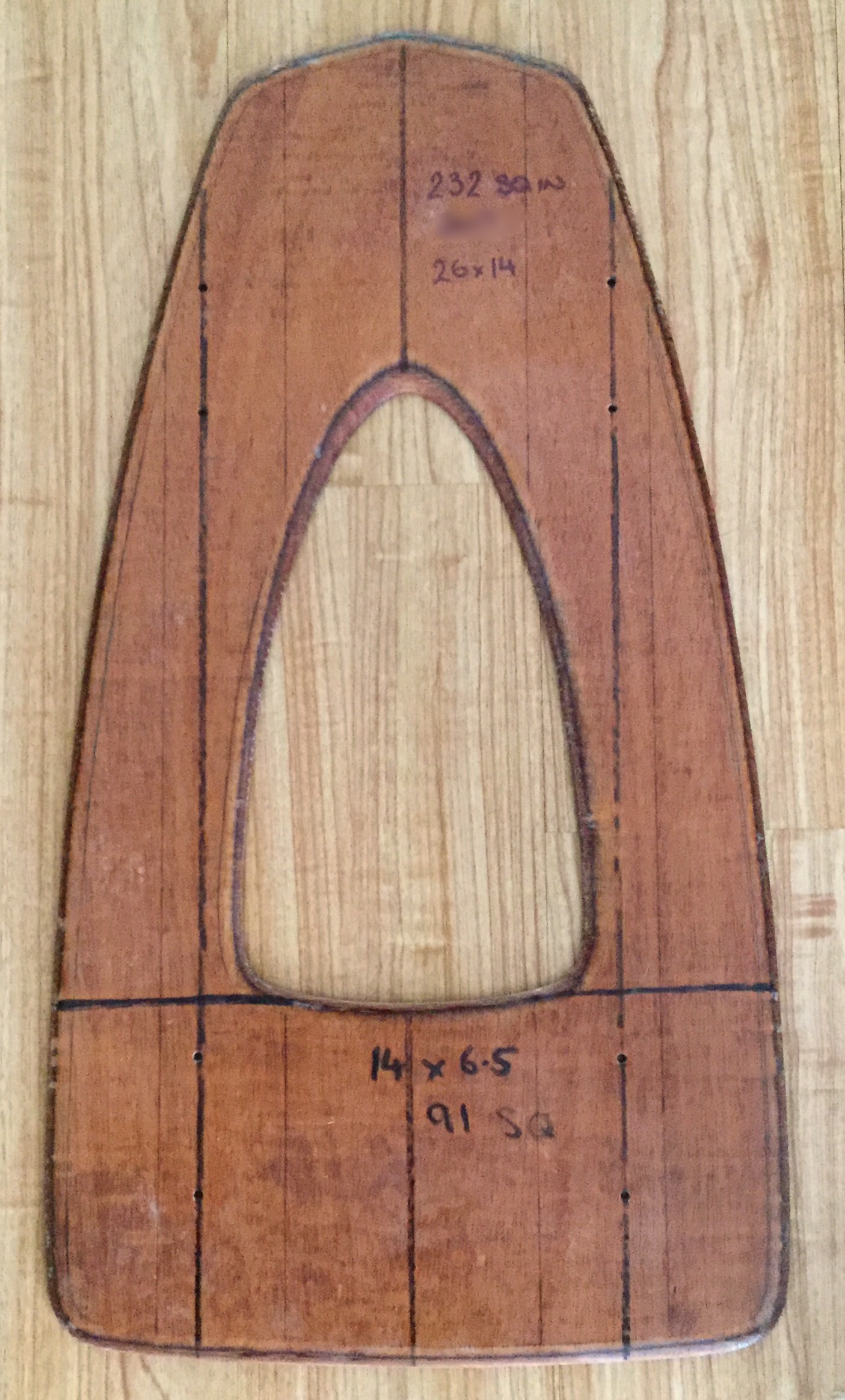 So now we’ve got a foil area 26 long by 16 wide. And I just happen to have drawn out a template for you. It’s 26 x 16, @ 350 sq inches., so long and wide enough for easy balance and @350 sq in it will lift in the slightest of waves. In fact probably too easy, so I’m expecting that as feedback.