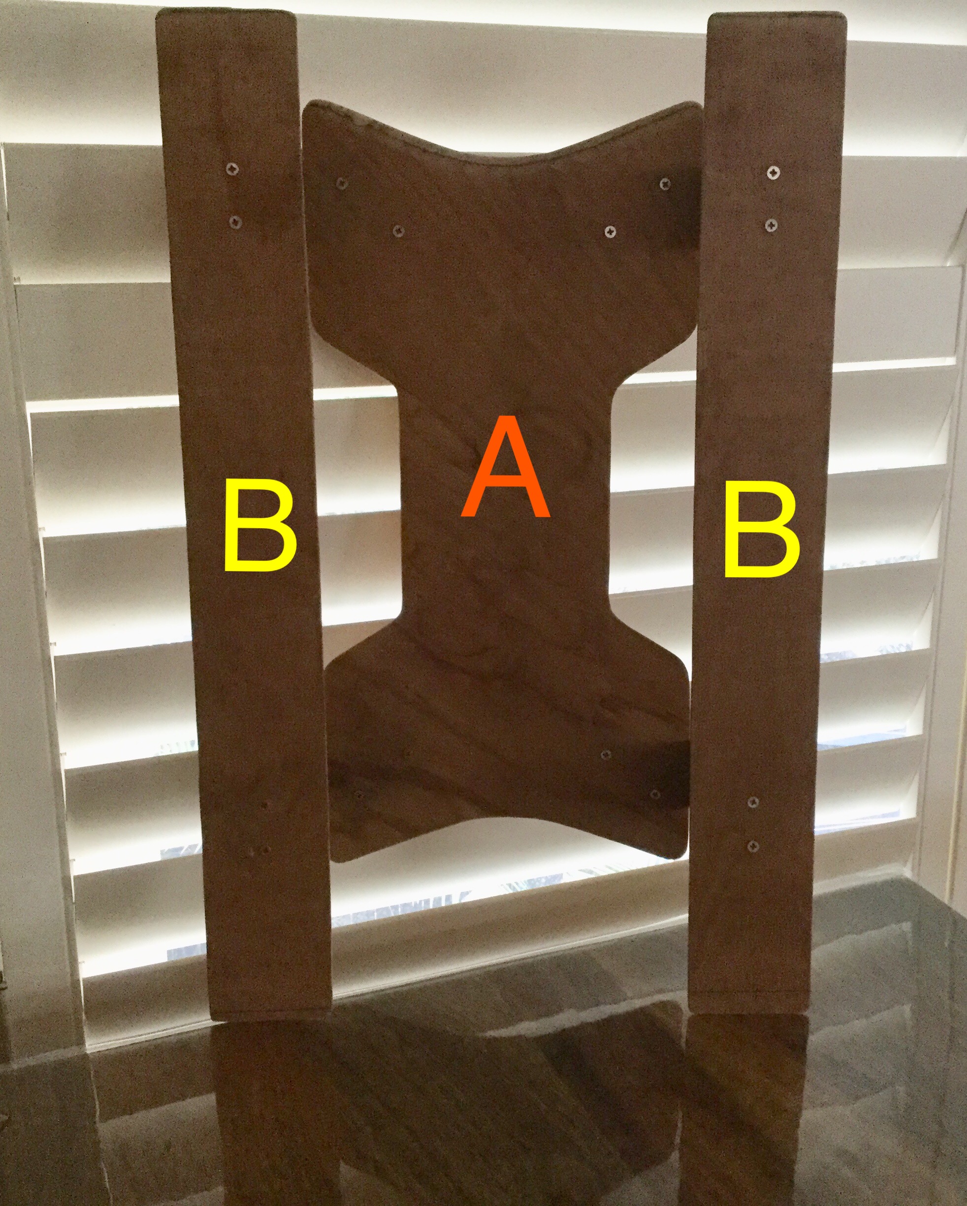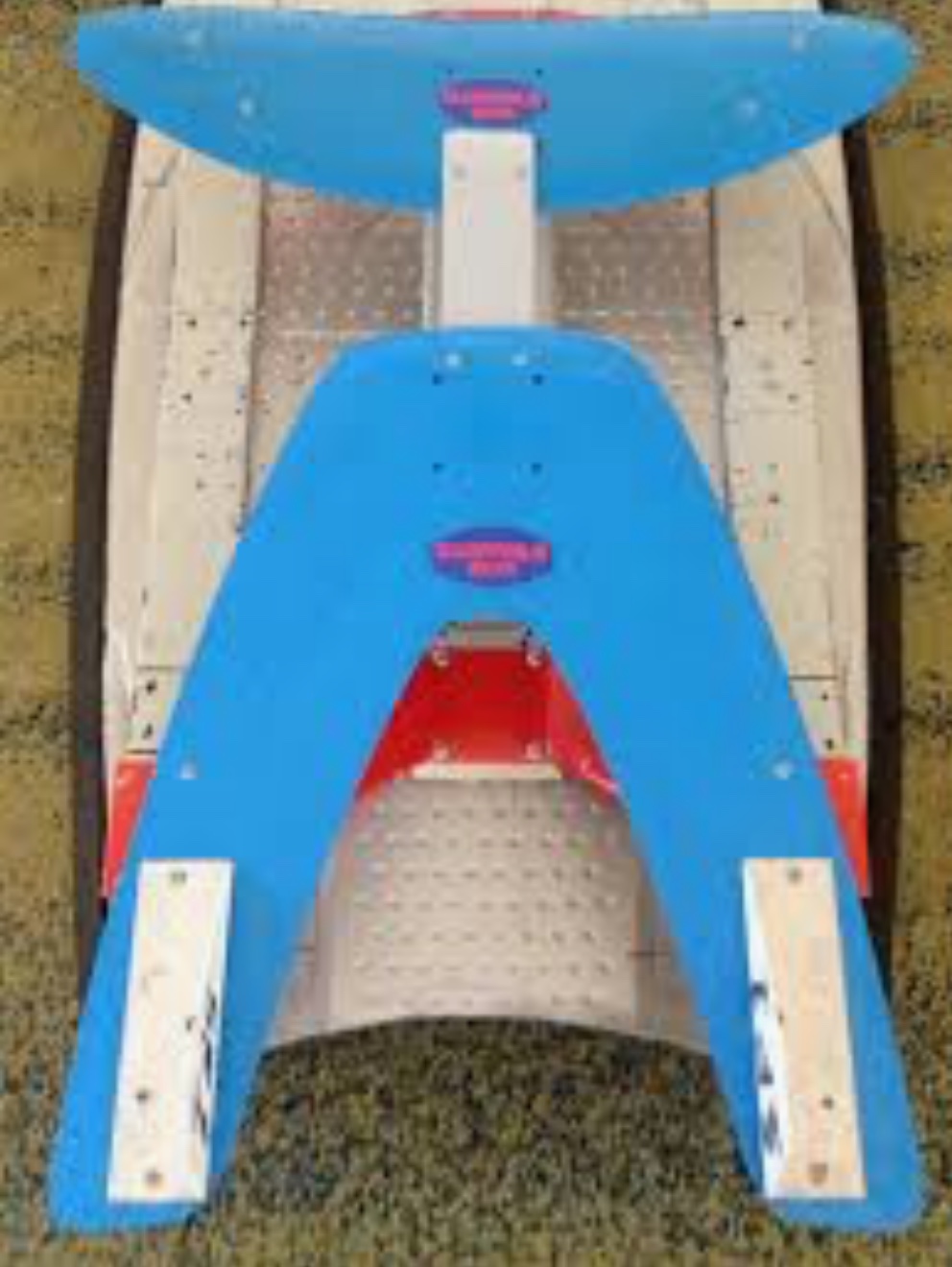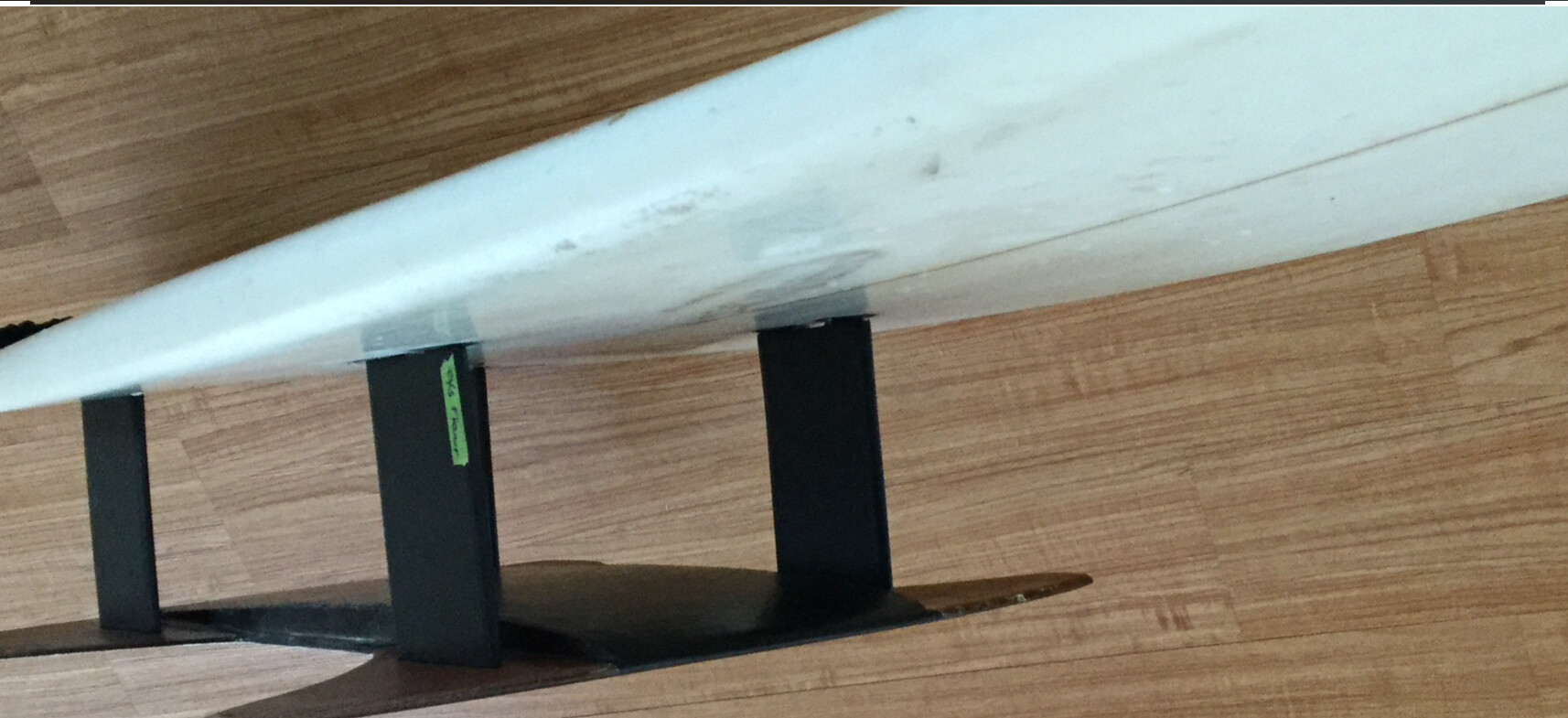 Here’s the latest setup. It’s easier to comprehend how it works by seeing it upside down. You can see the front foil is set lower than the rear foils so it stays submerged in a steep wave.