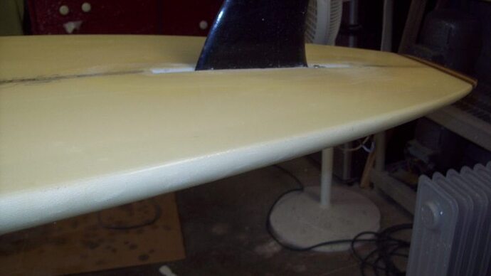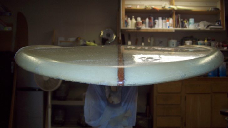 After the deck patch, I decided to try a pin technique I read about in various threads. On the bottom I fared the junction of the deck and inlay lams as best I could and basted the zone where the two laps met in a 1'' strip, once with lam resin to build up some material and again with sanding resing to cap it off. I then sanded this 1'' strip smooth and layed down two pins in acrylic to cover the juncture. Looking back I should have really thinned the strip more since it showed proud in the hotcoat, as it was as thick as a fingernail. I wasnt after a mirror finish, but I should have gone till I was juuuust hitting the underlying weave to get that flatter bottom. After the pins set, I wrapped the bottom in 4oz clear cutlapped on the deck, and after that I did the final deck wrap in 6oz clear and zip-lapped that at the rail apex to avoid the edge from what would have been the final cutlap on the bottom. Then I hotcoated!