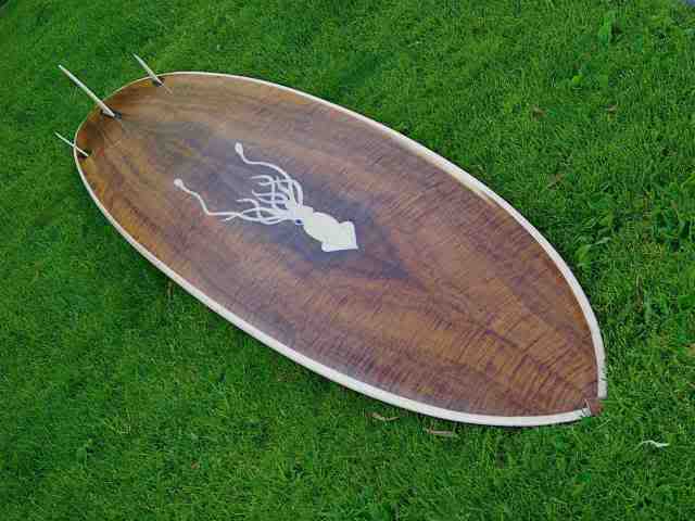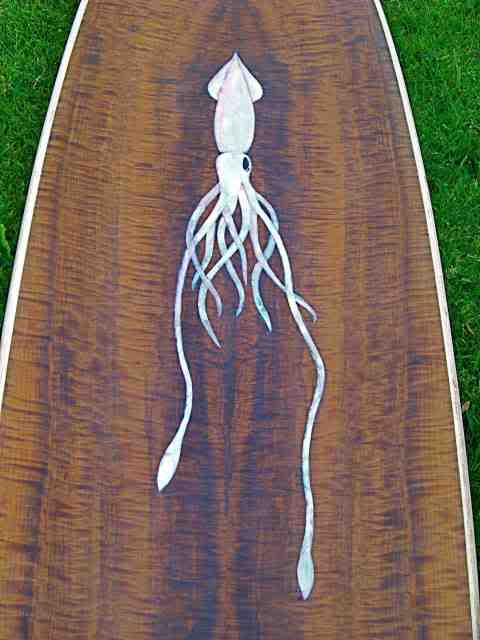No delam detectable. The weave didn’t show up for years. Fins is structurally sound. It’s just an aesthetic problem as far as I know. But this board has nice aesthetics. Brazilian walnut veneer, balsa rails, mother of pearl overlay. Called the Giant Squid. 9’-3” x 23”. I once paddled it way offhosre when blue whales were passing nearby. I questioned the wisdom of having a pearlescent squid on the bottom of my board as I stroked through the deep green water a I mile offshore…