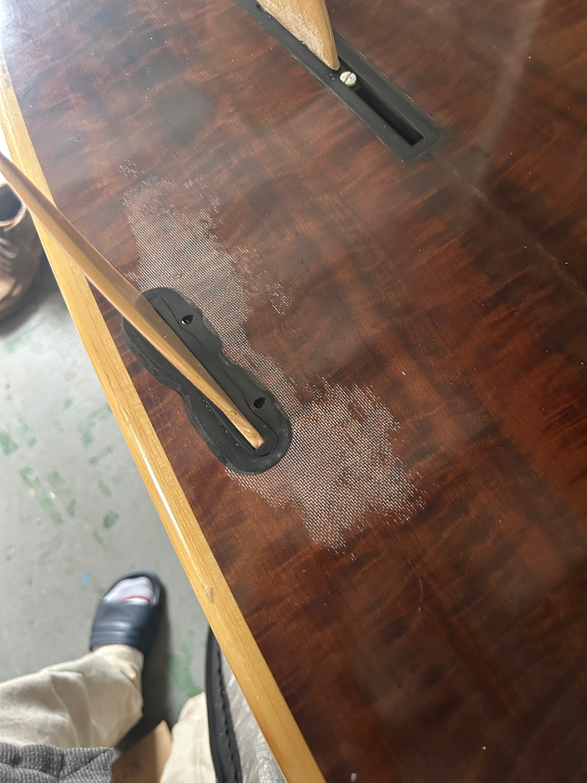 Anyone have an idea how to address this? It looks like a sand thru but it isn’t, as it appeared after a few years. Or rather it is, but barely . The board is epoxy. Sometimes I would clean the wax off with paint thinner and the weave disappears. Same if I used a dab of Additive F. Also I Amy have used polyester resin for a gloss coat but can’g remember. Actually I don’t think so. I got a gloss finish by just working through the grits down to 2000.
