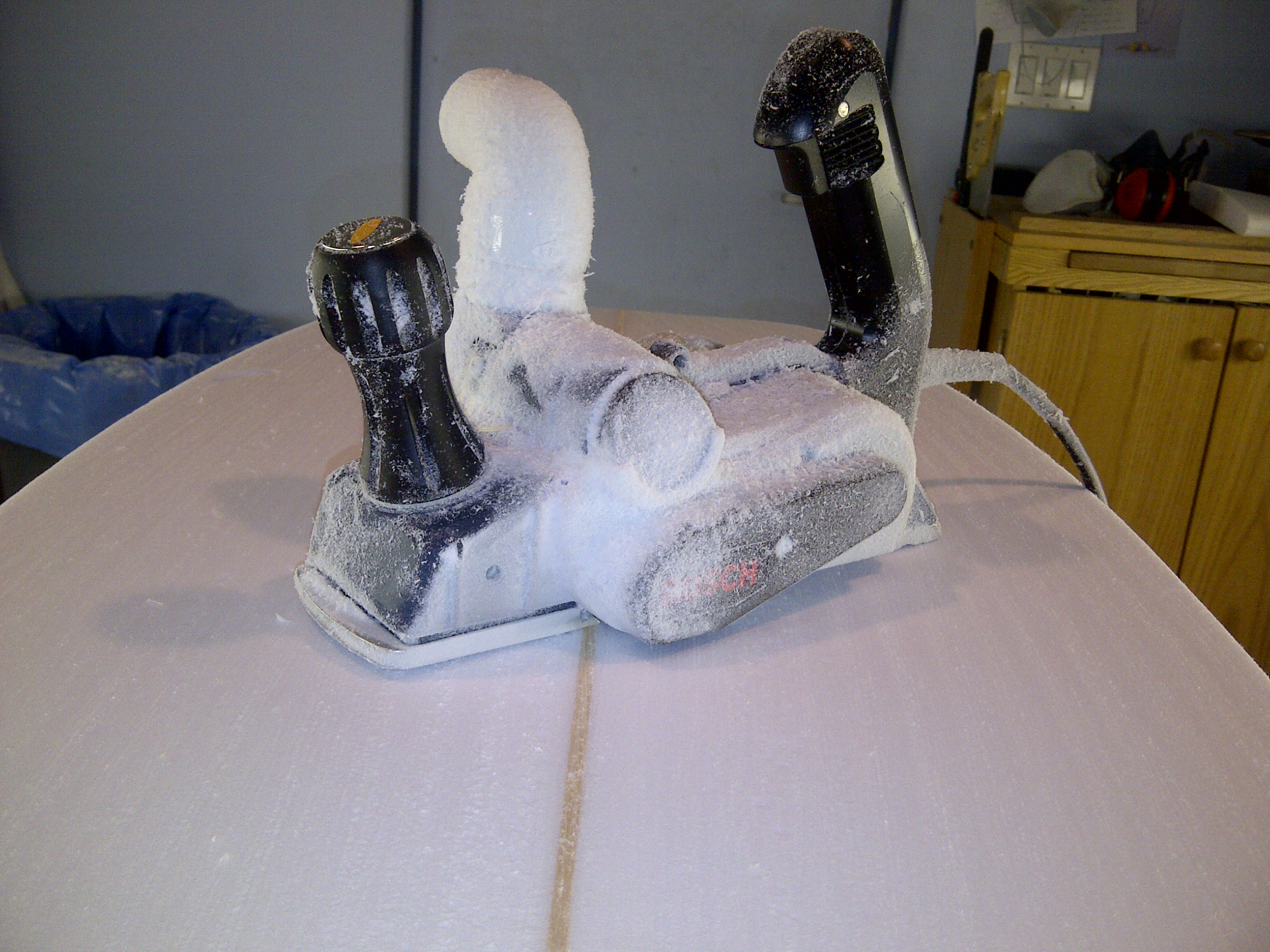 I have been abusing my Bosch to see what it will take to kill it. I took off my vacuum attachment since most planers die due to clogging with foam and melting bearings. I usually do all my days milling and foiling at once so it is not unusual to have my planer on for two hours straight. So far in pu foam it hasn’t heated up at all and not a single clogged exhaust port, all my Clarks clog up which makes me stop my flow. My Skil’s would be very hot to the touch by now and I would have to stop or switch to another planer. (I am not blowing the Bosch while using it just to see if I can kill it) I think that the exhaust has twice the velocity of the Clark or Skil which is great for keeping it cool and clog free but I am throwing foam into places that foam has never been before. I am still getting used to the adjustment knob as it doesn’t have the little lever like the Clark or Skil and I am always second guessing my depth of cut. Seems easy enough to add a knob to it, I might try that since it seems that I am kind of stuck in my ways. Last, I think it is less noisy, when Jim Stephens was using it earlier, I could barely hear it.