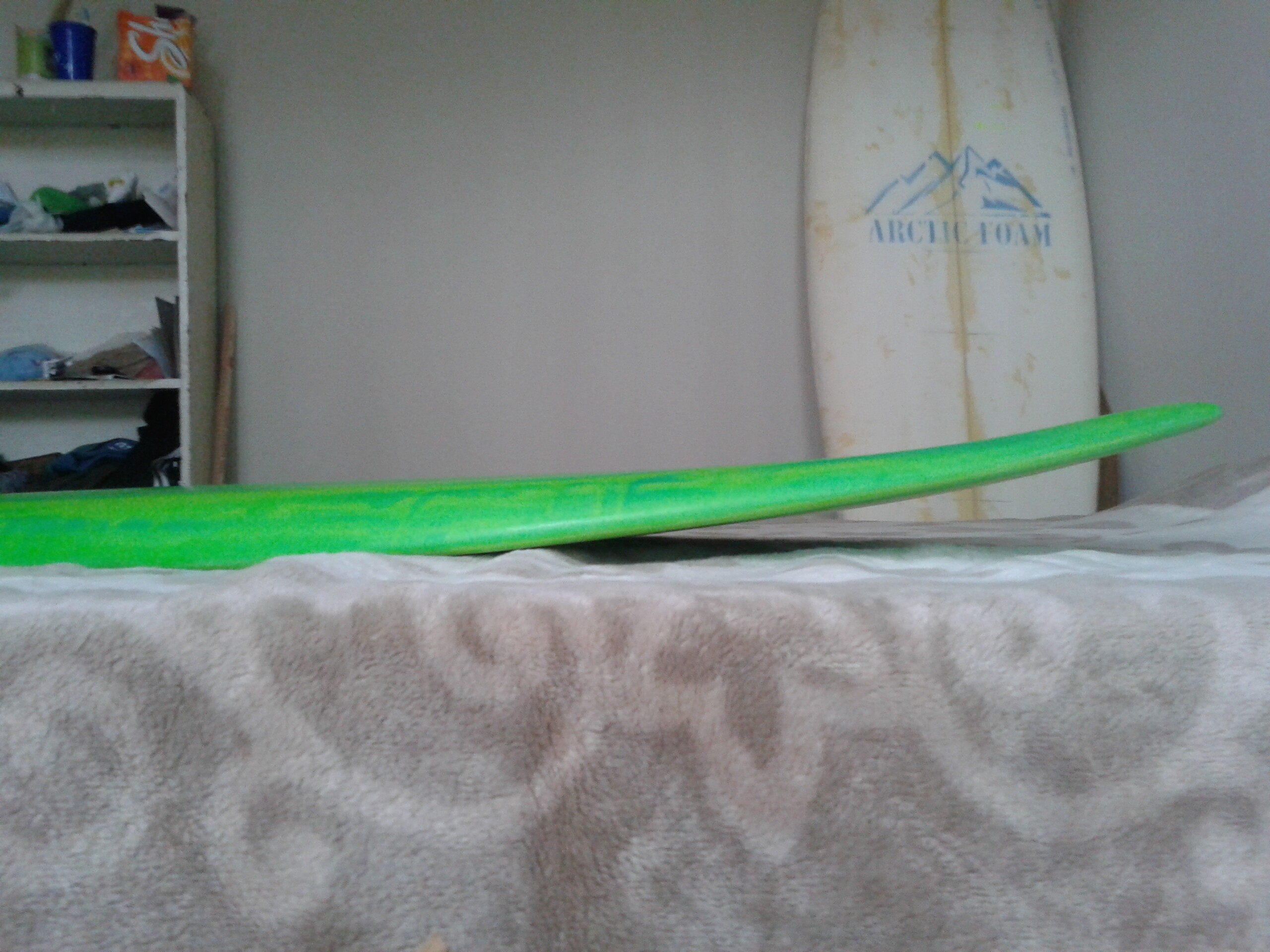 About my foil: I used a stock arctic MABILE fish blank… I did not add any rocker in the nose… however, I foiled the nose (on deck side) a bit thinner from tip towards wp. Not all the way but close! I cross cut a little about three blades width from nose tips towards center at a 40 deg angle with bed nose of planer towards nose…I cut on both sides of blank same deal… low setting just hacking away bits here n there making it evened out… then I sanded the ridges out smooth w block sanding…had to surform a bit to flatten it out, yet retain curves… then I took a spoke shave kept foiling it down towards wp…as before. Lotta eyeballing it! Took caliper to check thickness at 12" from tips…the rest I eyeballed cept center thickness I checked there to… I put a tad of tail kick from fins back on the fronts…gave a 1/4" boost! That there foiled my tail! Very little foiling on the tail on deck tho…just surformed and sanded and winged it…real easy does it tuning…