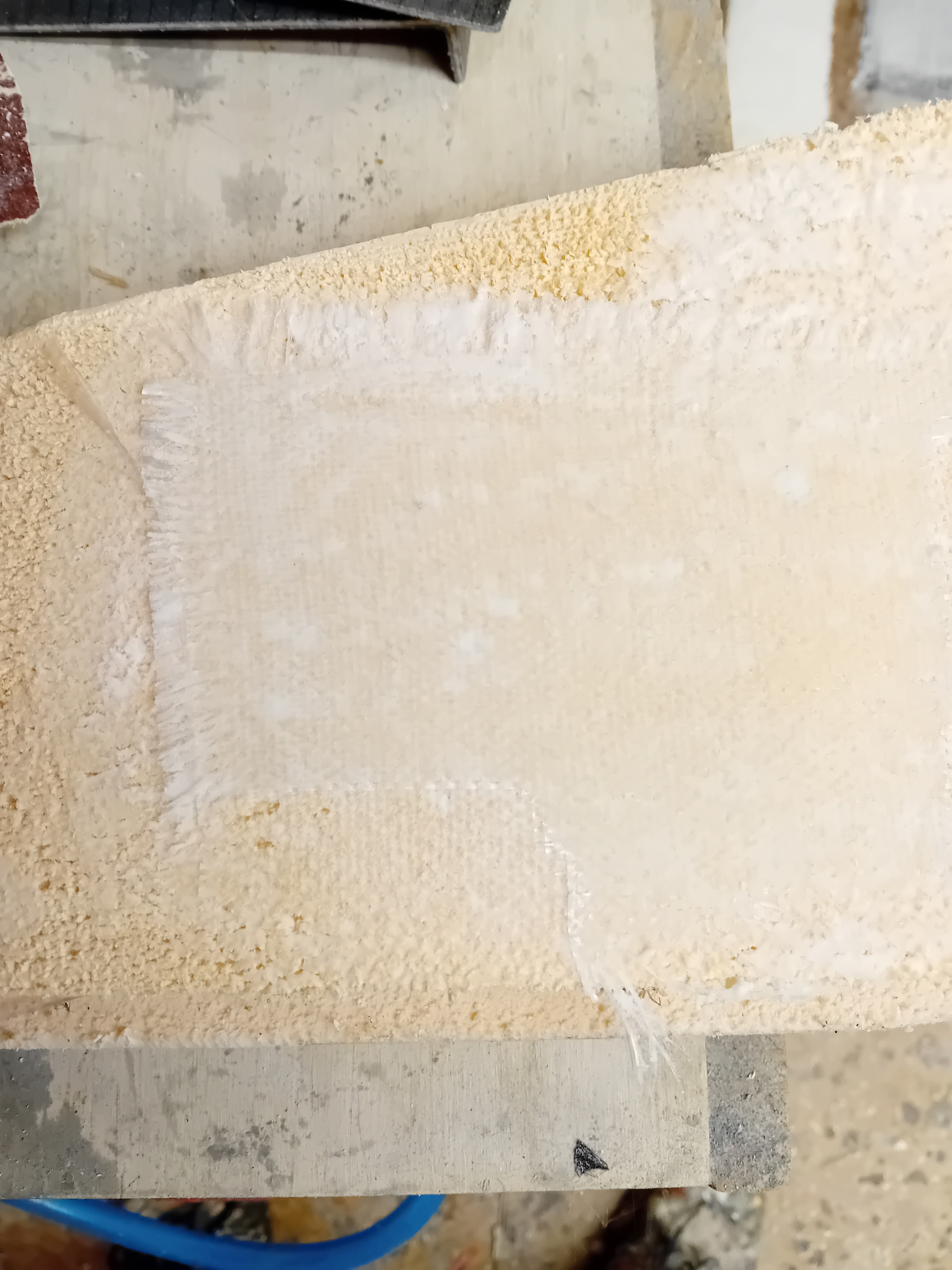 Xps250/300, 2lb standard homedepot xps panel here. Hand wire brush prep, 6oz 471 glass, secret sauce (epoxy+micro+silica+flox) seal and lam i one go. Test make with remaining repair materials.