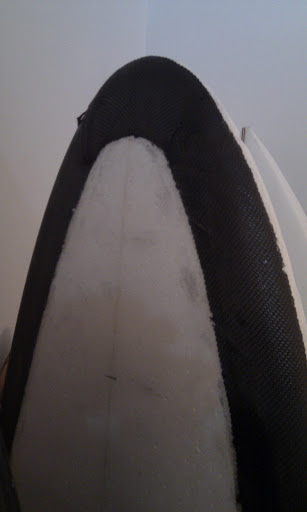 I did not seal the blank prior to glassin on the CF tape, and bhoy am I happy. Once i went at the tape with the metal file, all the exposed white EPS became gray and mucky looking. So my plan is to seal the exposed areas, hopefully the addition of cabosil and some white pigment should hide all the hideous finger prints etc… If not…well there is always acrylic paint.