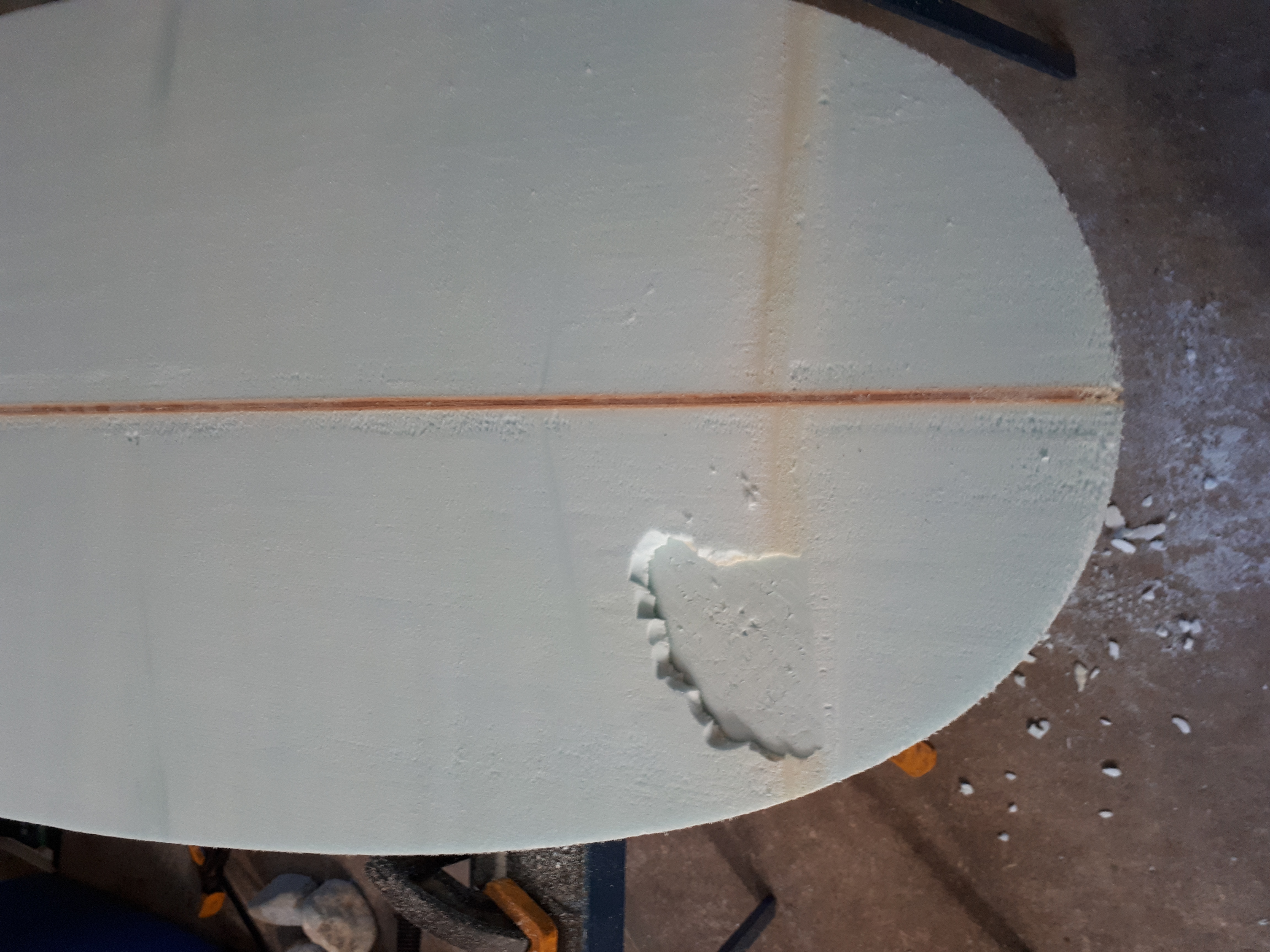 The blank is made of 2 sheets glued together. The resulting join runs along the side of the board, and crosses the bottom of the board near the nose and tail. I removed the big chunk of foam from the nose (seen in the photo) because there was a gap in the joint, making the foam very floppy. Now i need to find a way to fill the 1/2" deep crater left behind. Also you can see that there are some voids which daylight along the rails. They are 3/16" openings but do not run very deep into the board.