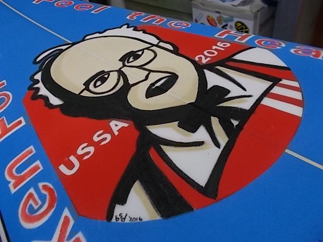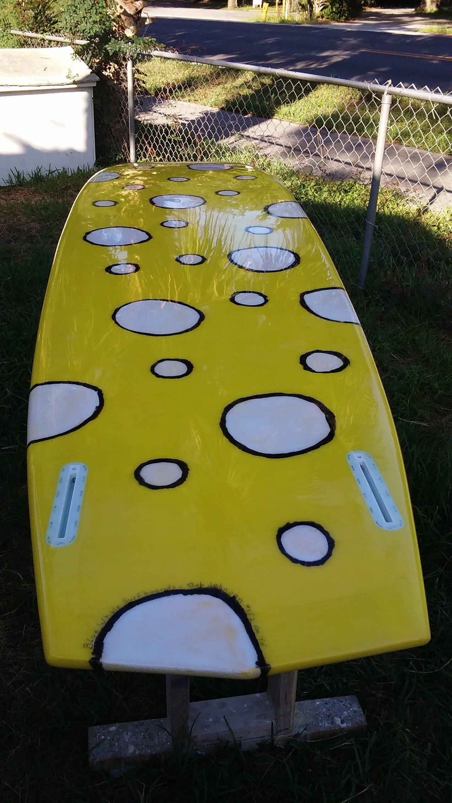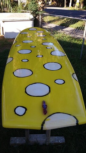 Painted the blank yellow with a clear lam. Then resin circles before the sand coat.