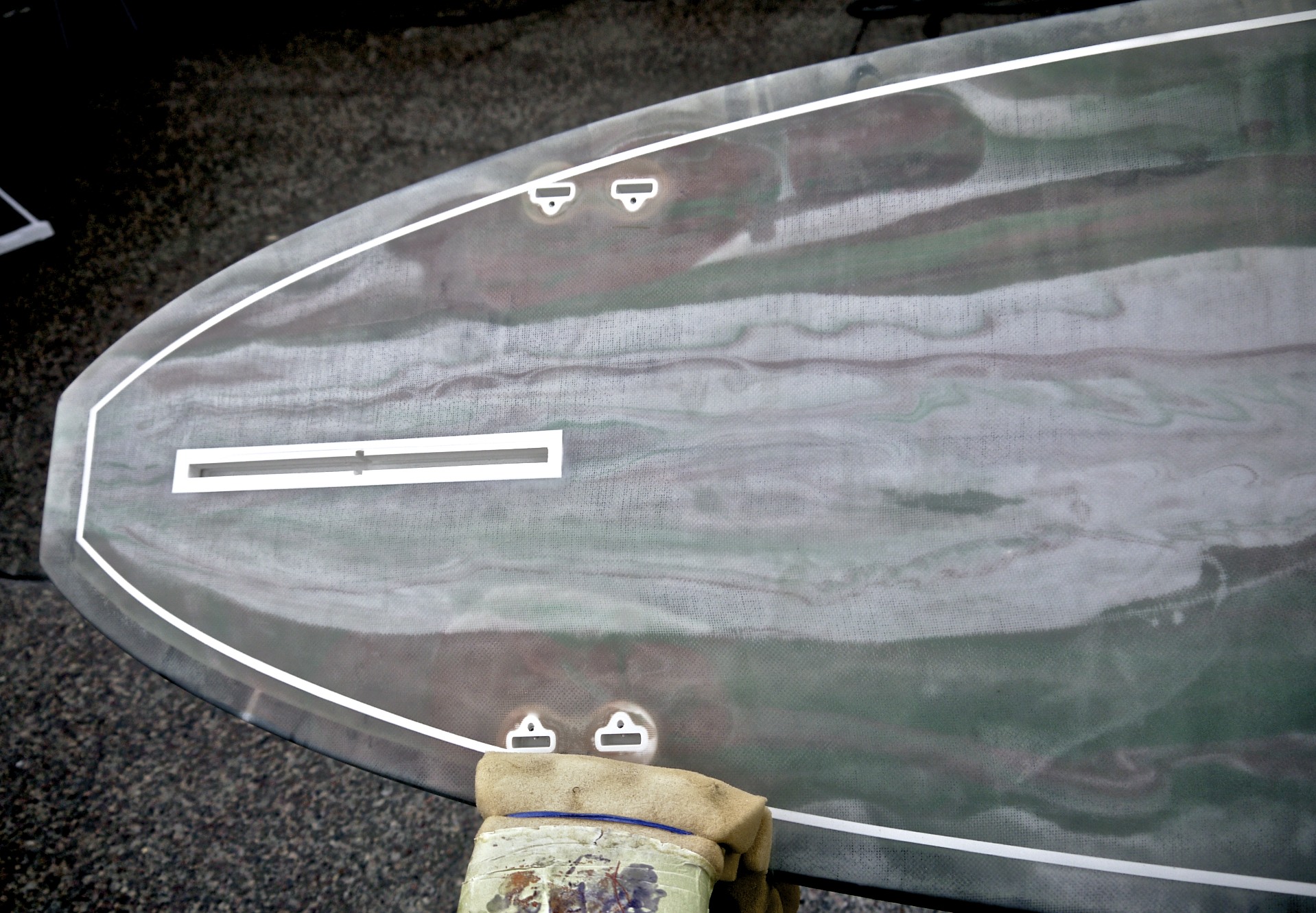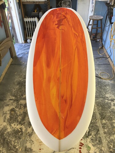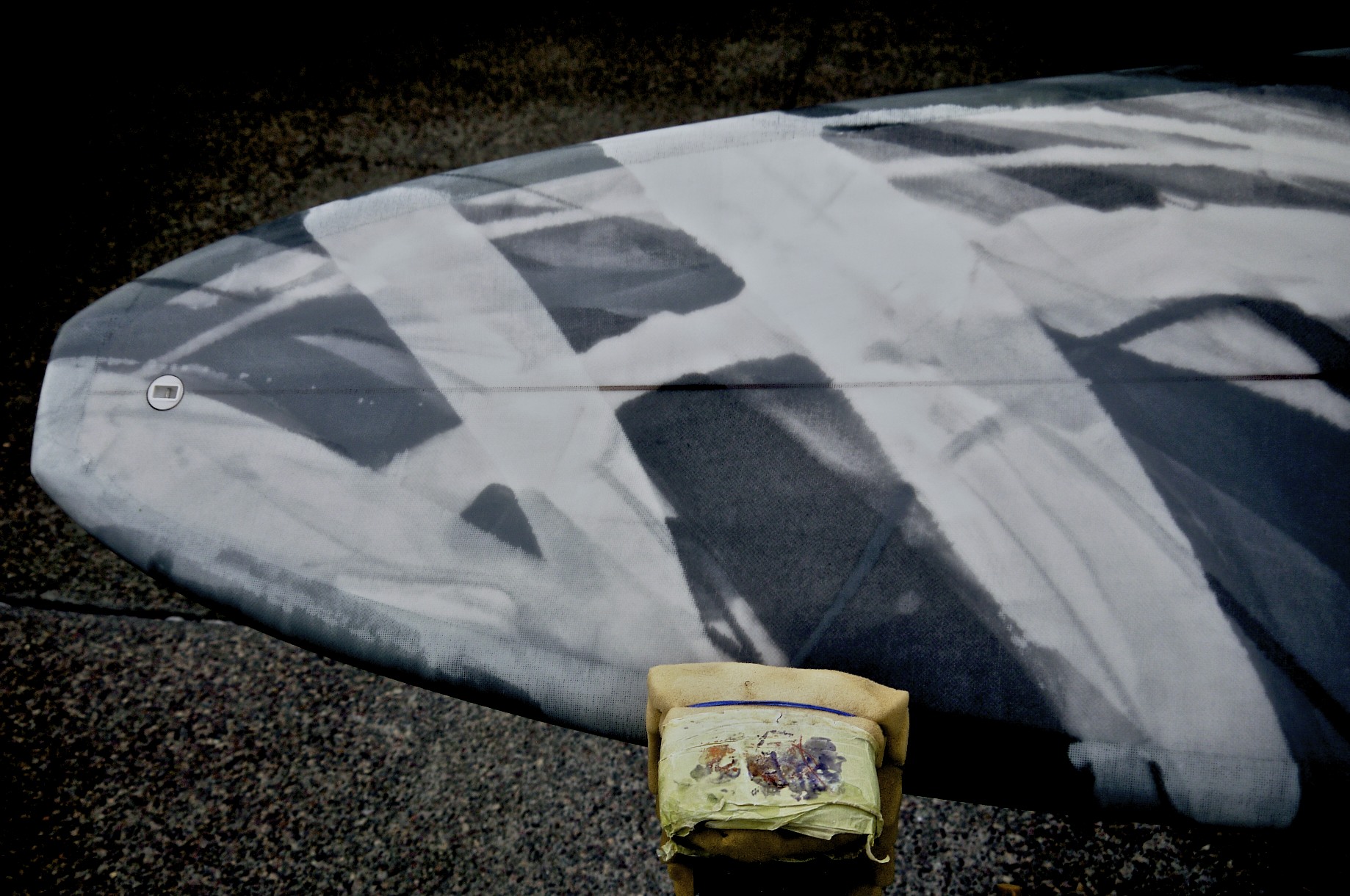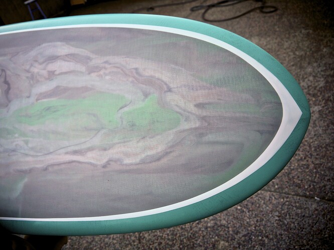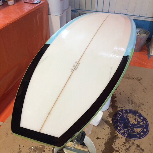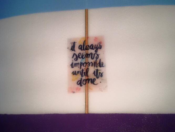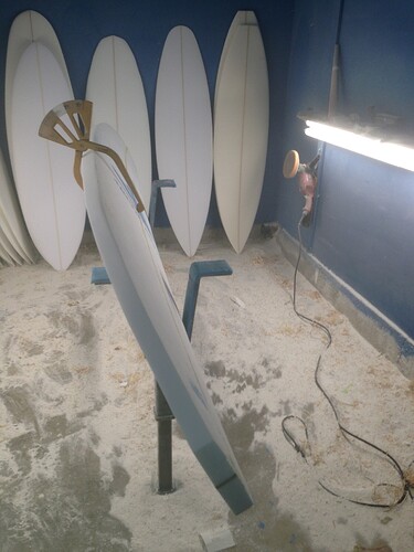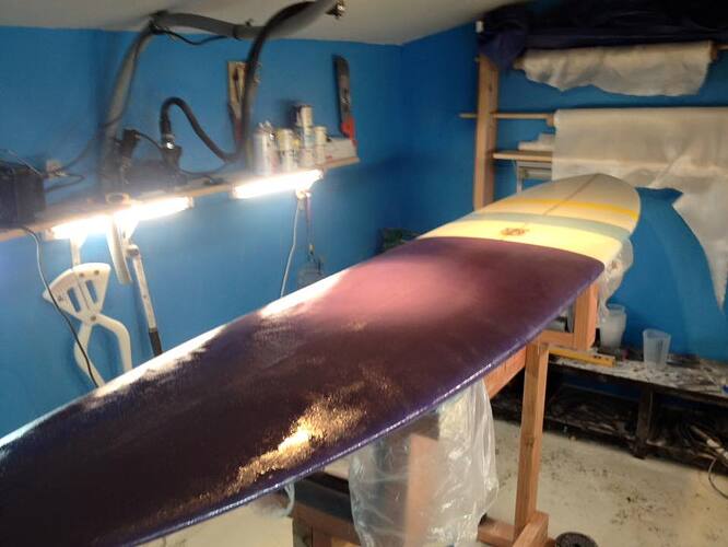 Just finished glassing the deck of my first mal in my little shed, lessons learned in; the difference between laminating two 6oz layers at once compared to a lighter schedule, not overshaping 50/50 rails/deck and the effects adding nose concave has when trying to eye the foil. Madiba 9"x22.5"x3"