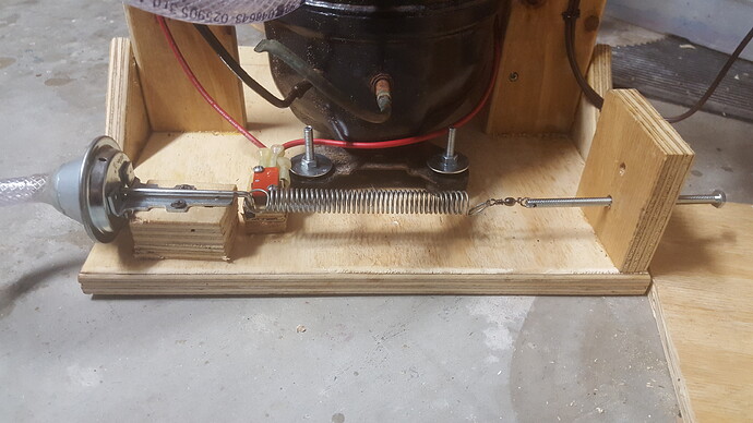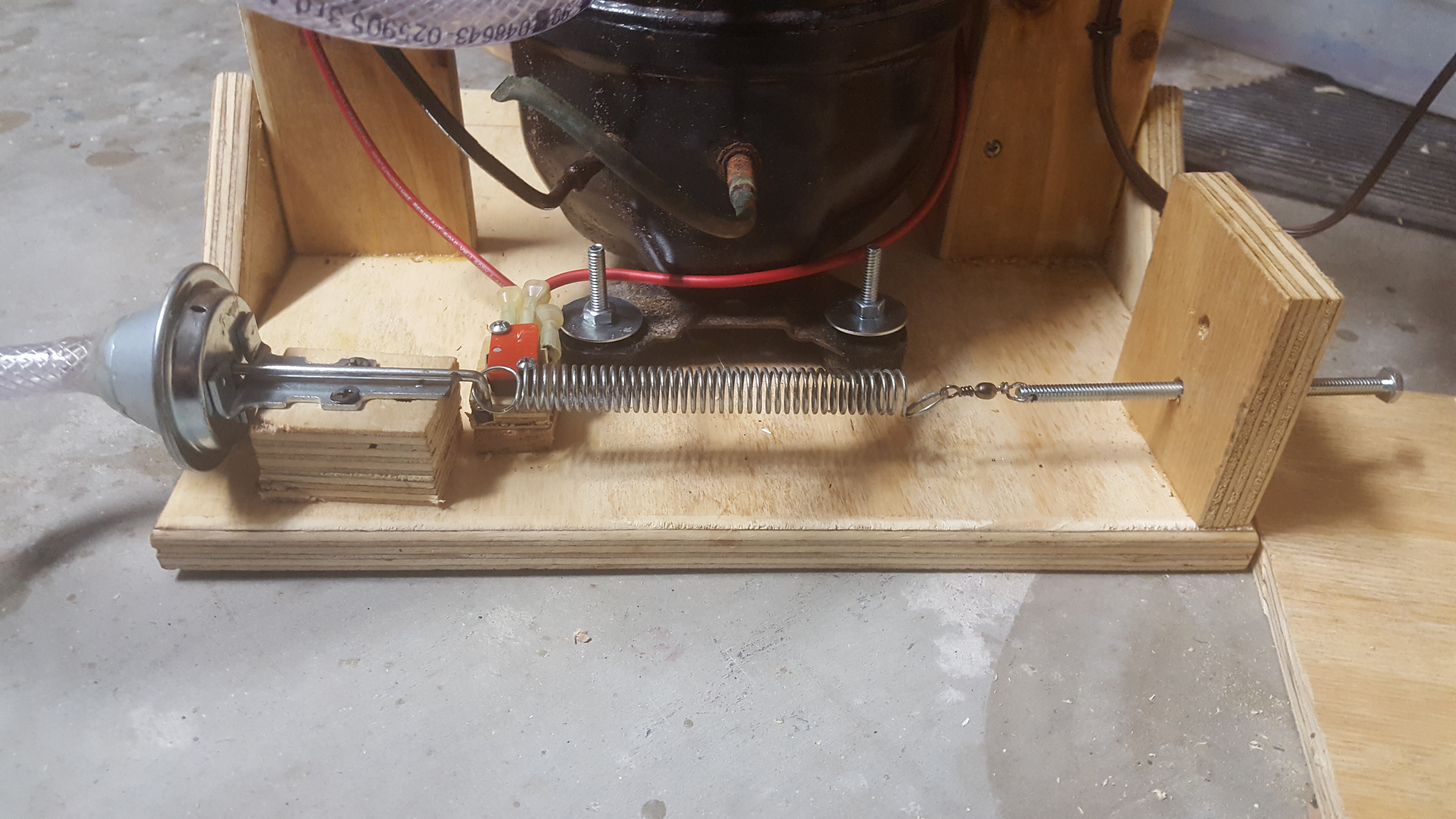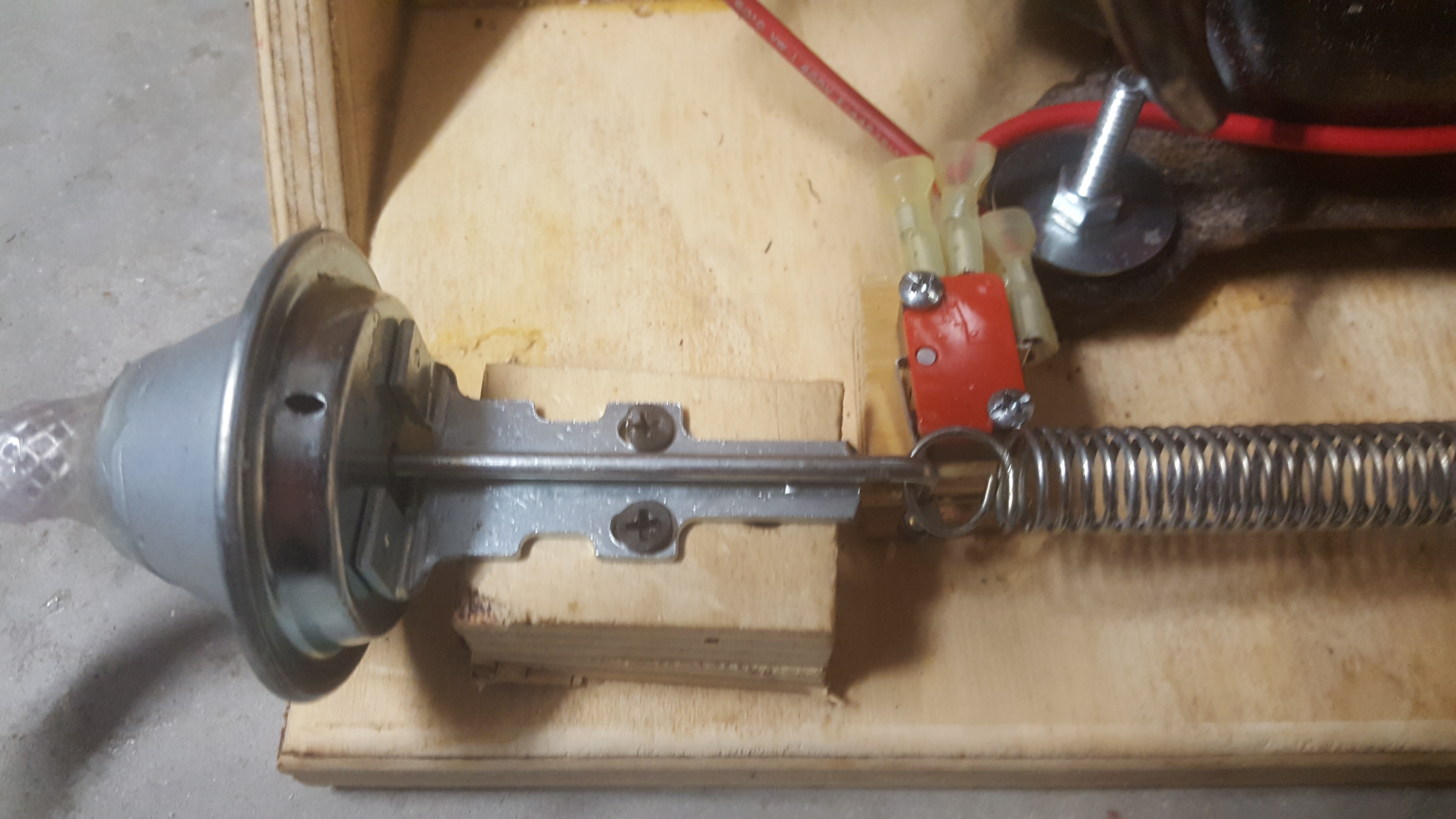 Hydro_skiper, as you can see in this pic I have a spring that I can adjust that will either drop or increase the vacuum. I used a (car vacuum advance) that has a rod that moves in and out that hits the switch arm. The spring is to make it harder for the advance arm to pull in allowing more vacuum. You dont have to use a spring at all but you cant control the vacuum strength. The spring is attached to a fishing line swivel and then to a 5"threaded bolt. The bolt can be adjusted in/out to pull on spring. I used a threaded T-nut that is pressed into the wood that the bolt threads through. The fishing swivel is used because the spring wants to stay still which doesnt allow the bolt to turn. I drilled a hole through the end of the bolt for the swivel to go in.