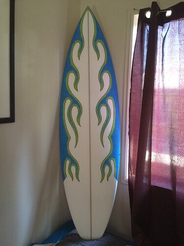 Thanks jiblet65, I am feeling pretty good about the shape. I’ll have it glassed tomorrow night after work and hopefully in the water by Monday or Tuesday. For sure, ascetics are dictated by taste but so is shape to an extent. A friend of mine was using my glassing space to finish up a couple orders and a personal stick yesterday so I decided to keep my self occupied with a little expierementation with this paint job.