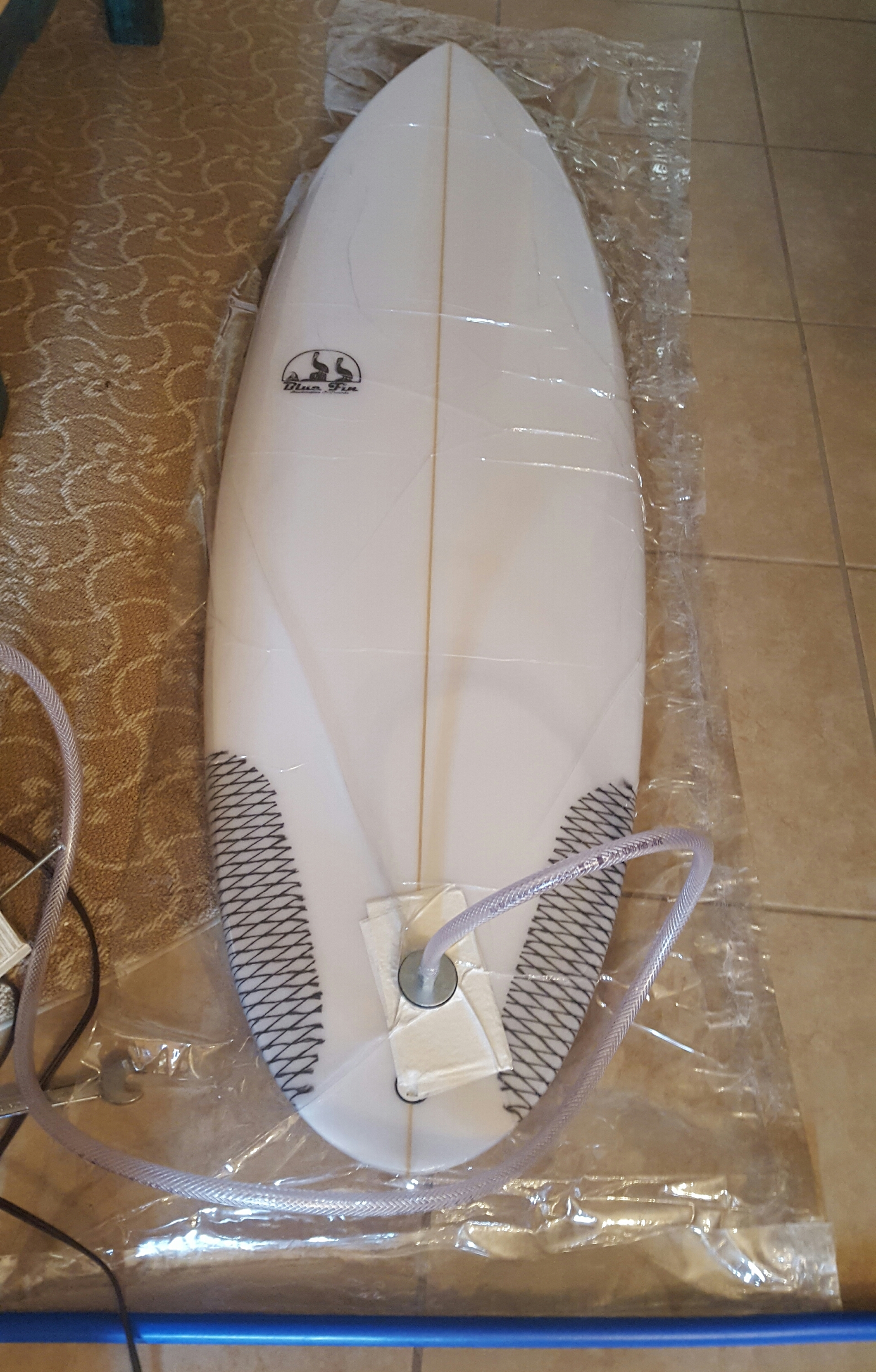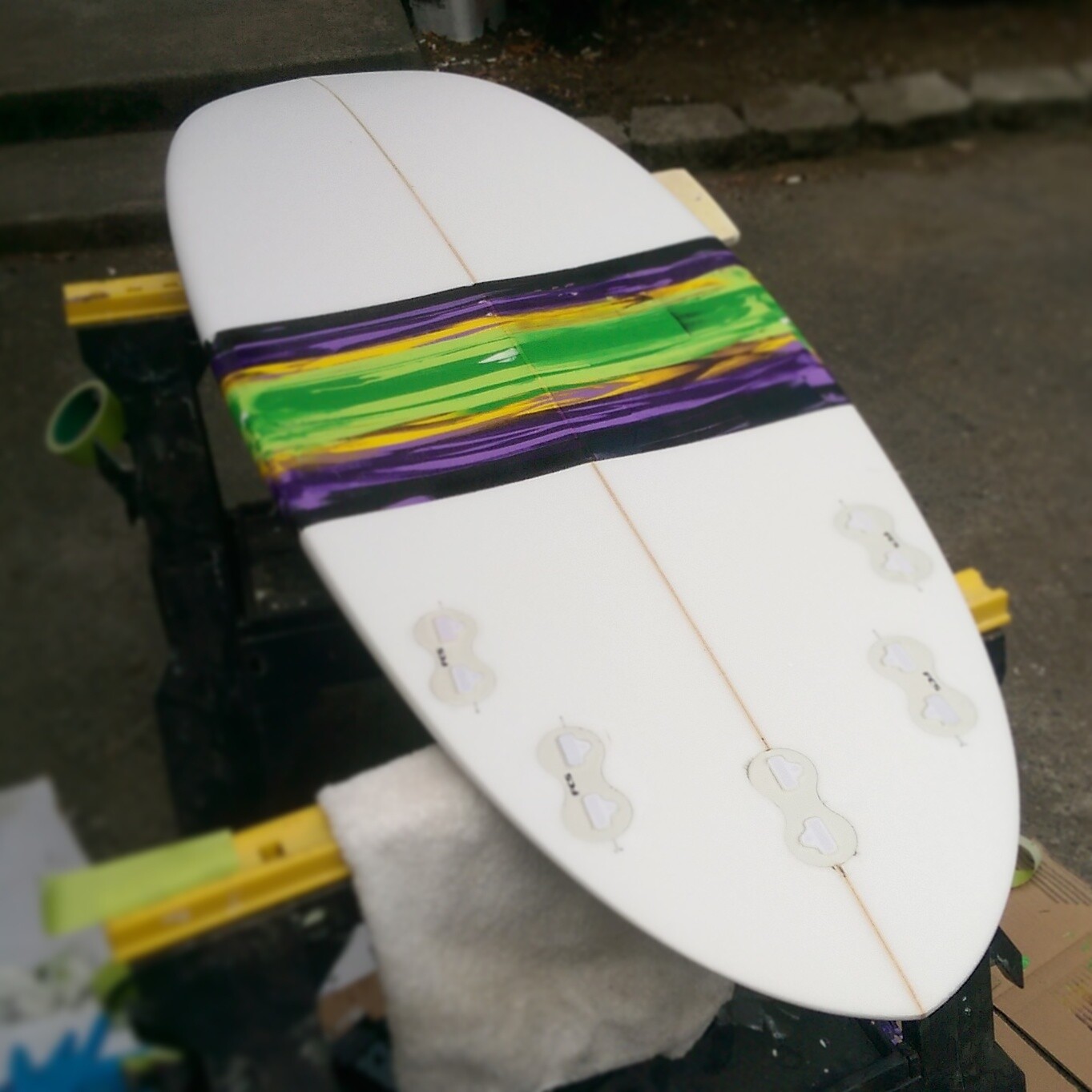 Ive been working up a rounded pin tail. She is a shorty, with a full nose and tail, a pretty flat deck that carries a good deal of volume out to the rails. The contures of the bottom start in a very subtle rolled V in the nose to a double concave through the center of the board and flat out the fin cluster, I did my first instal of 5 FCS Fusion boxes for a little versatility when it comes to finding out what goes best. I have just got the paint worked out, with an abstract dribble and squeegee job, and will be set to glass it up in the next couple of days.