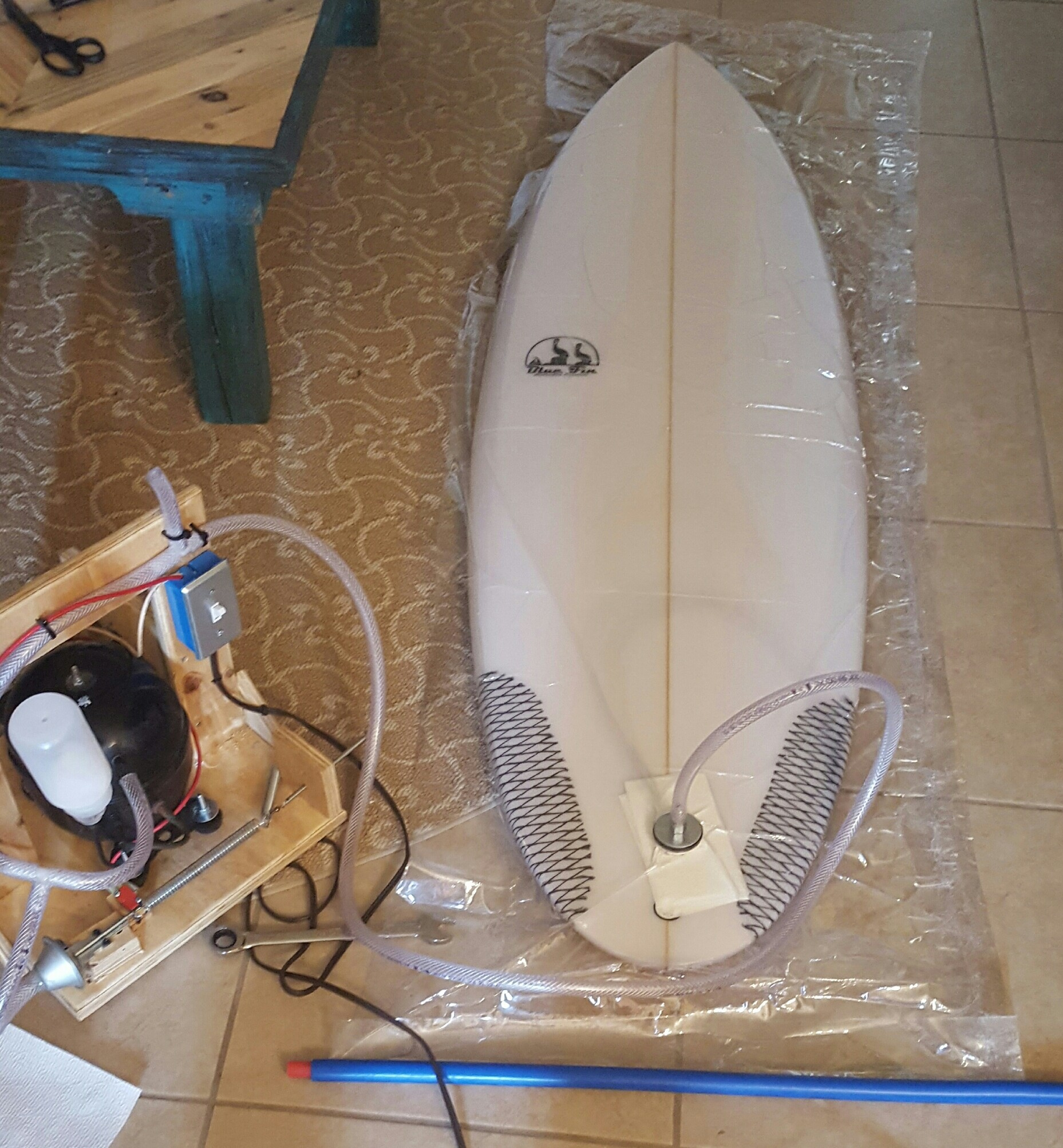 Finished my vacuum bag. Made it out of vinyl furniture covering from Walmart’s. Sealed the edges with adhesive caulking. Messy work but it works. Next time will use a better caulking. The bag vacuums down good and holds but I think it has a tiny leak somewhere. Motor keeps turning on. Might be from the board itself but not sure. I’ve eliminated all the whistling leaks that i can hear. Should be good enough for laying down some veneers on my boards. As for the bag end seal, I was going to buy one of those quick lock’s from online for $12 but when they were going to charge me another $12 to ship I chose the handmade route and bought house water piping from home depot instead. Cut a slit in the blue pipe just like the quick lock and it works great, no leaks and only $5. My vac gauge came in and was messed up, showed 10"hg without pump even on so i bought one of the liquid filled. Once thats here I’m set to go.