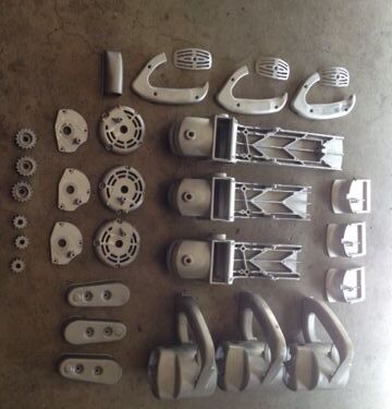 This is phase 3 in the resurrection process; beadblasted, sanded/bondo where needed, bottoms polished, ready for paint. Phase 2 was oven cleaner and pressure washing (too messy for pix). Was able to make 3 out of the 5, the firehoses blew them around and cracked the castings and 2 had completely melted motors.